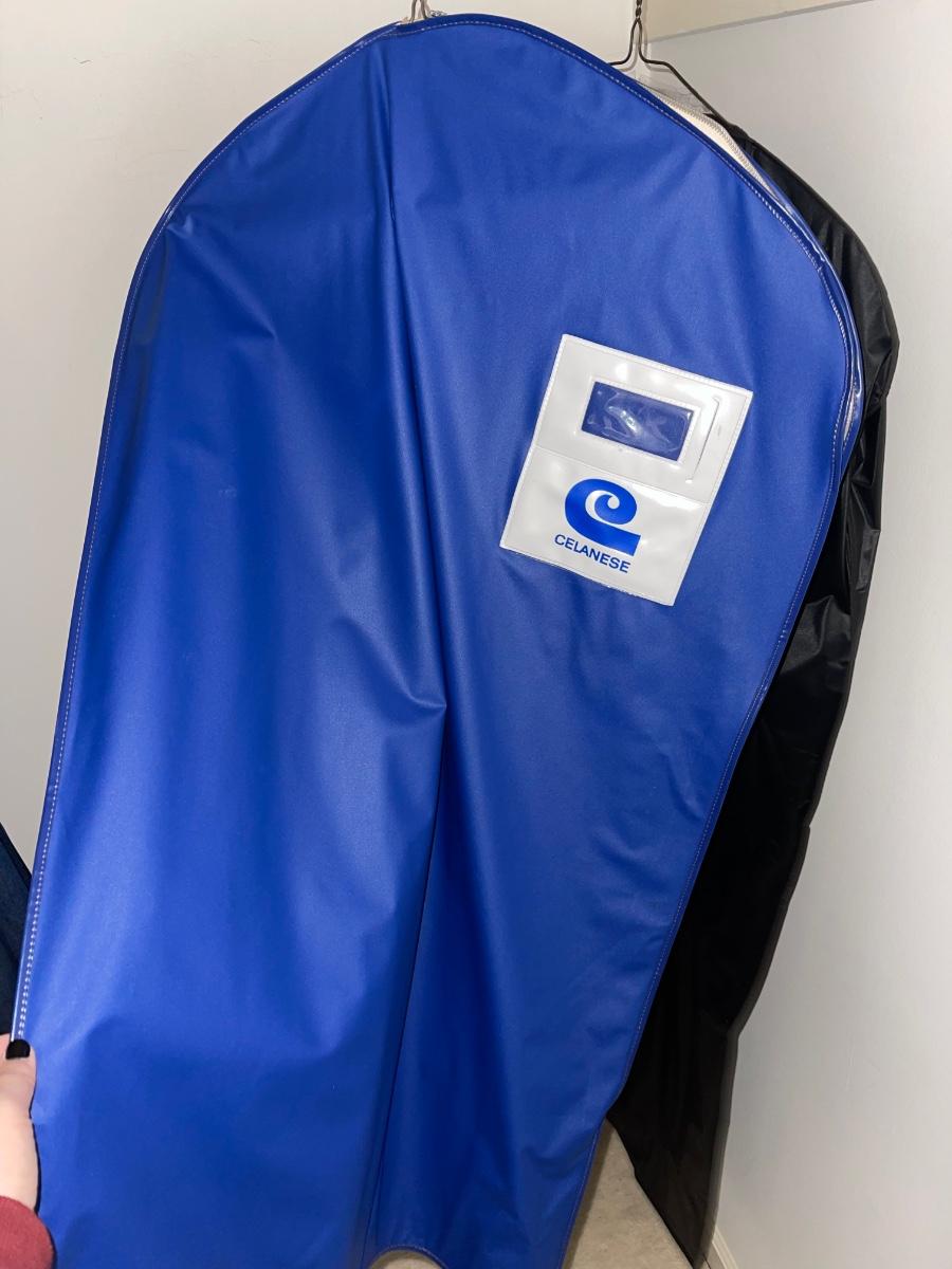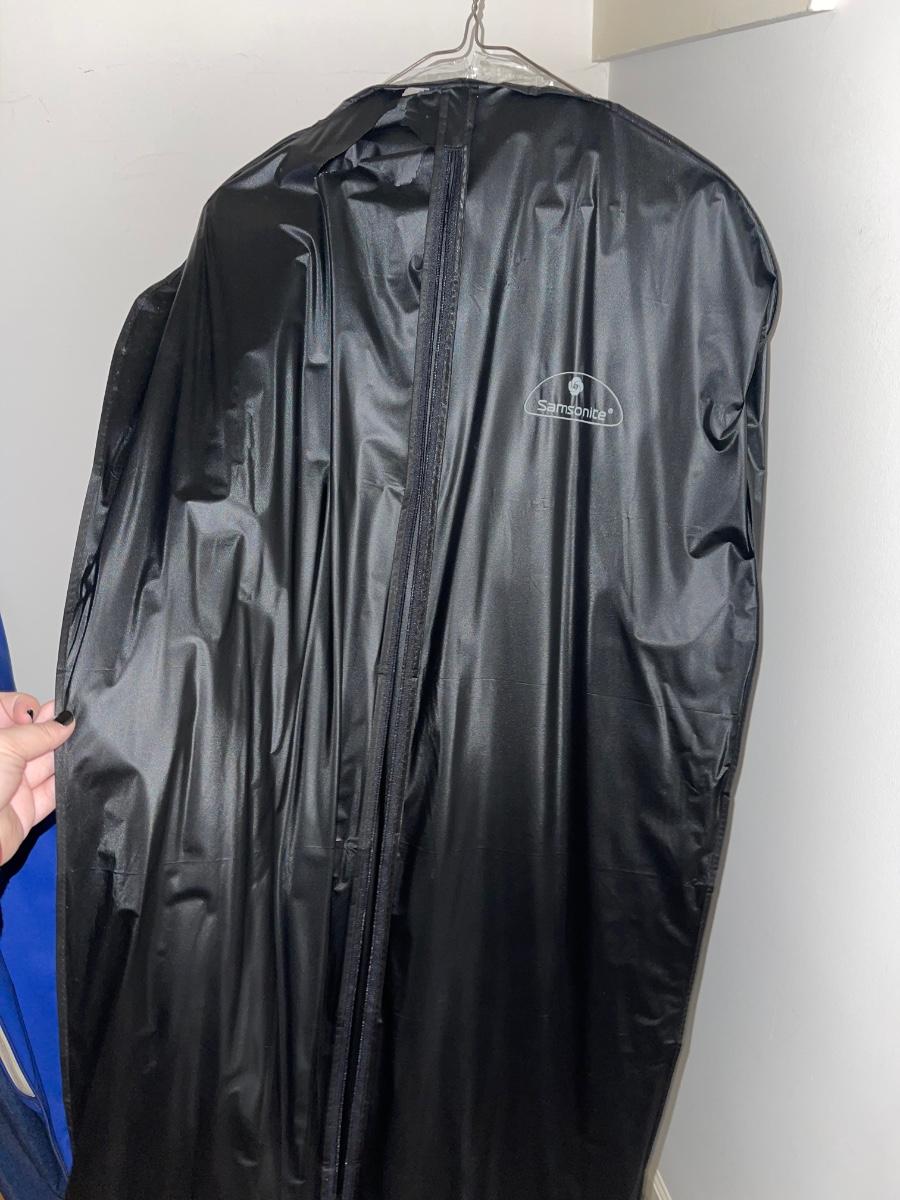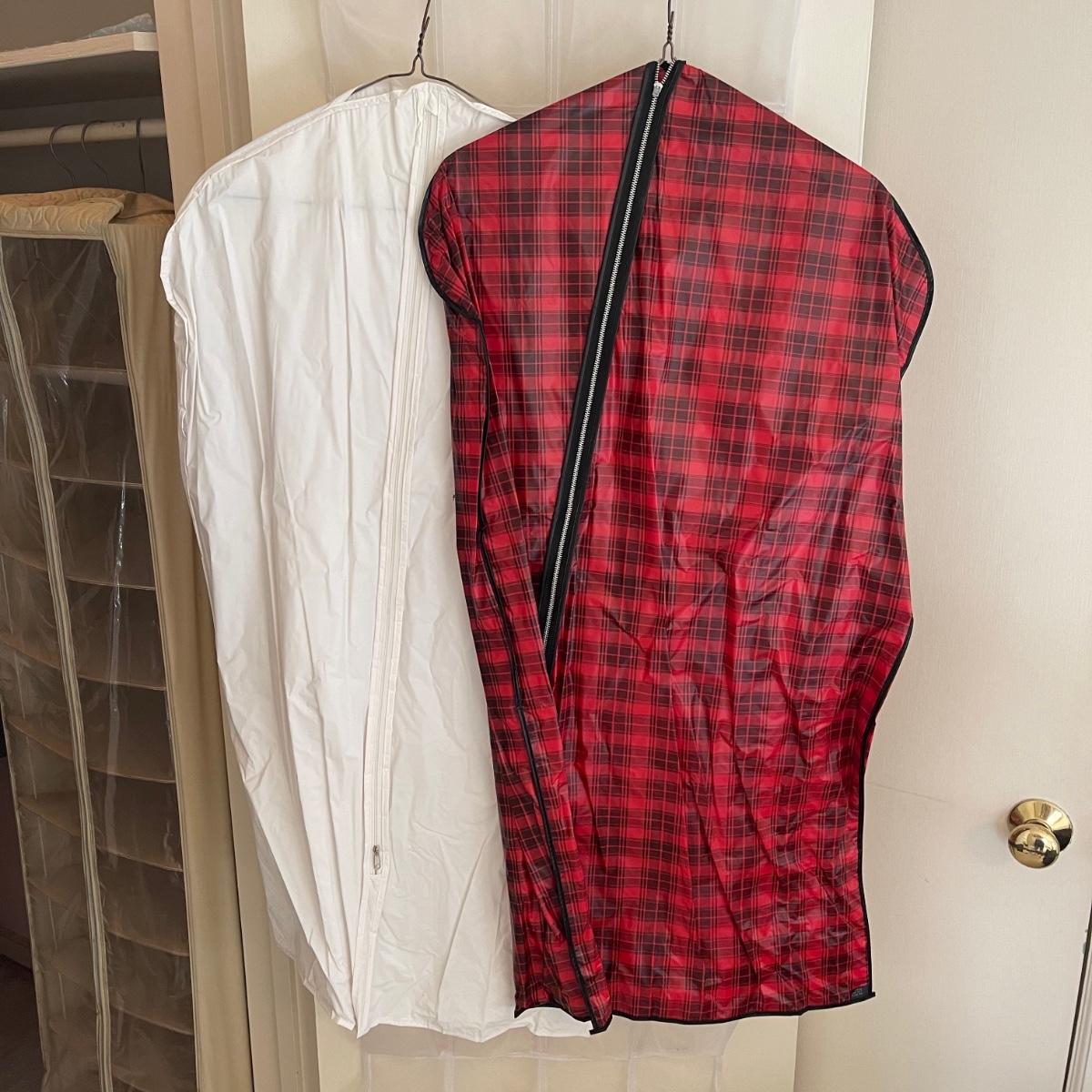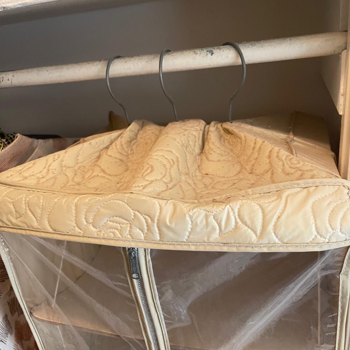 An over the door shoe holder, hanging closet shelving, and six hanging clothing storage bags. The shoe holder is about 68 inches long and covers the back of the door and can hold 24 pairs of shoes. The hanging shelving can be zipped up and has 10 shelves, it’s about 53 inches long when hanging.