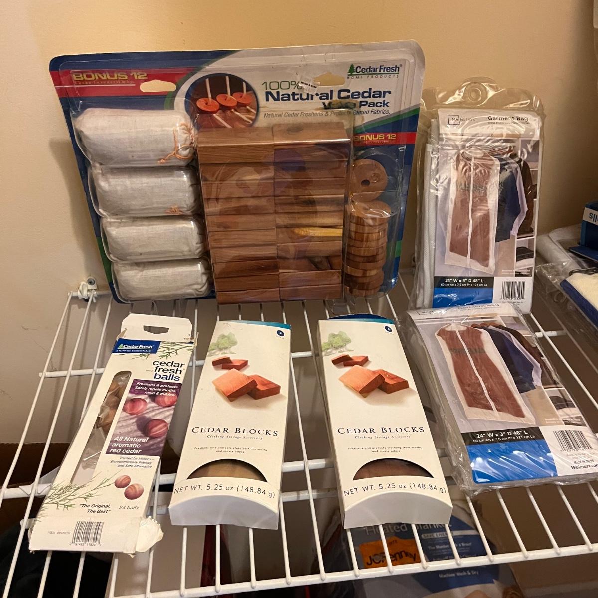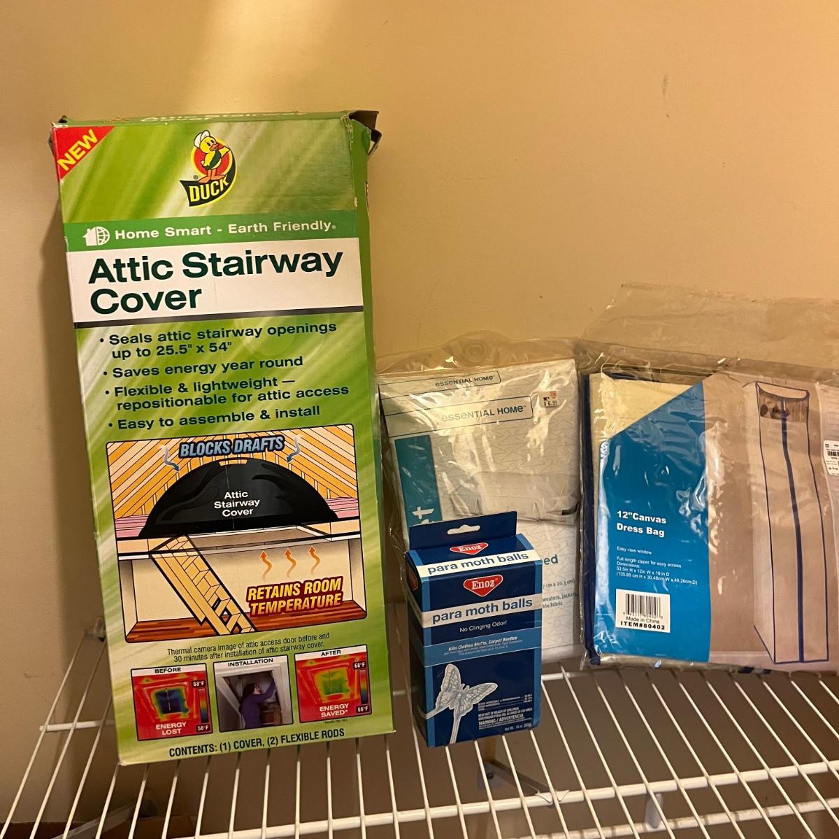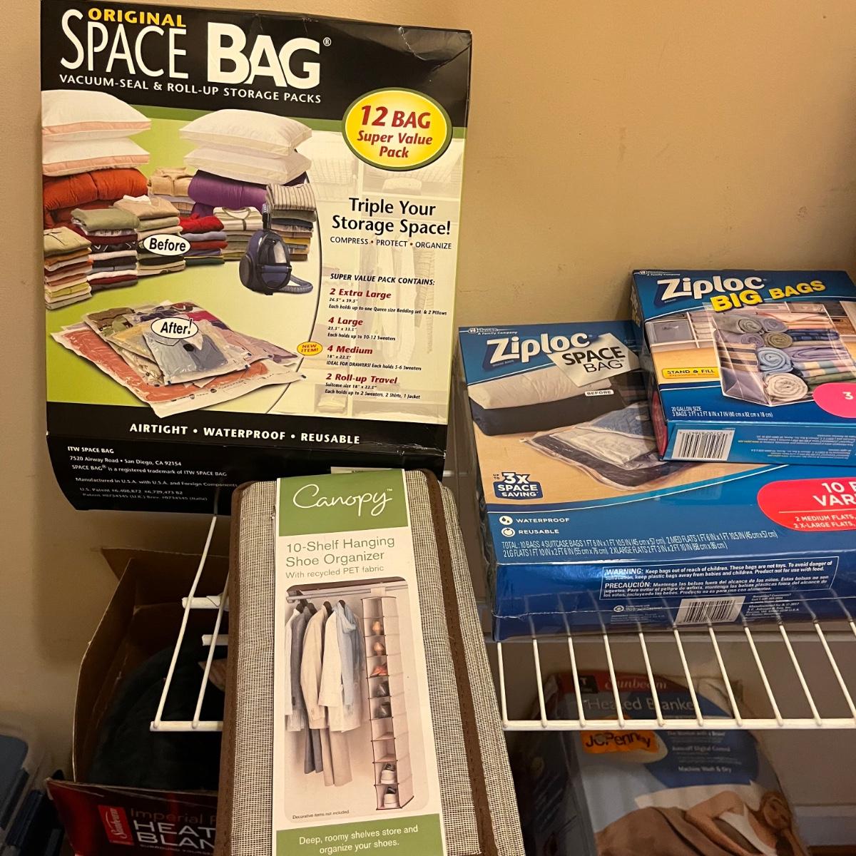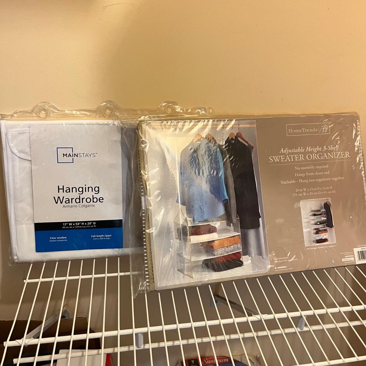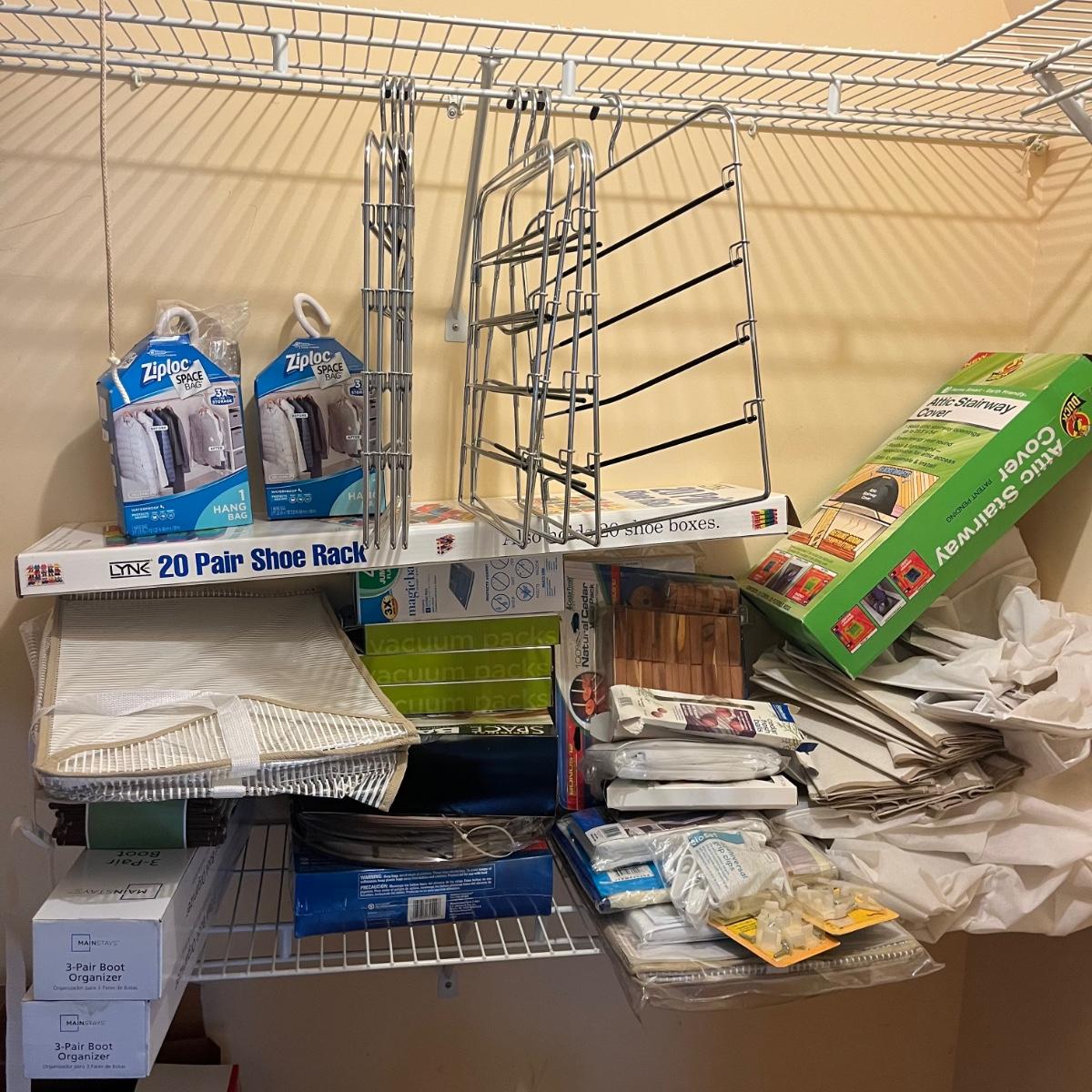 Lot includes nine swing out hangers, sweater organizer, attic stairway cover, cedar blocks, hanging wardrobe, shoe hangers, space bags, twenty pair shoe rack and more.