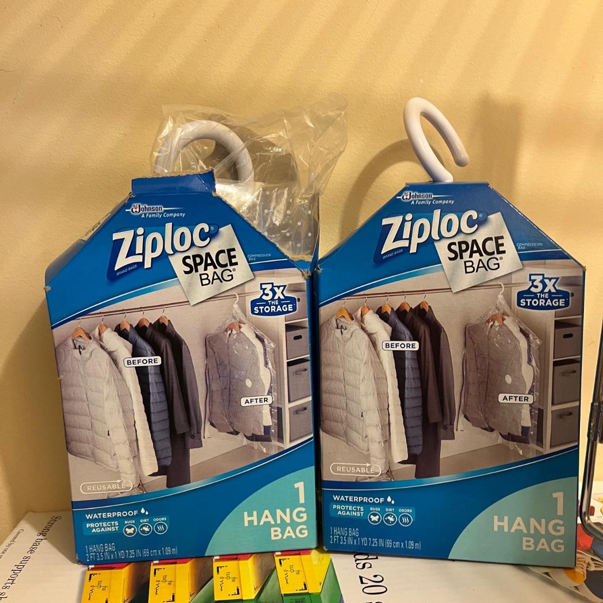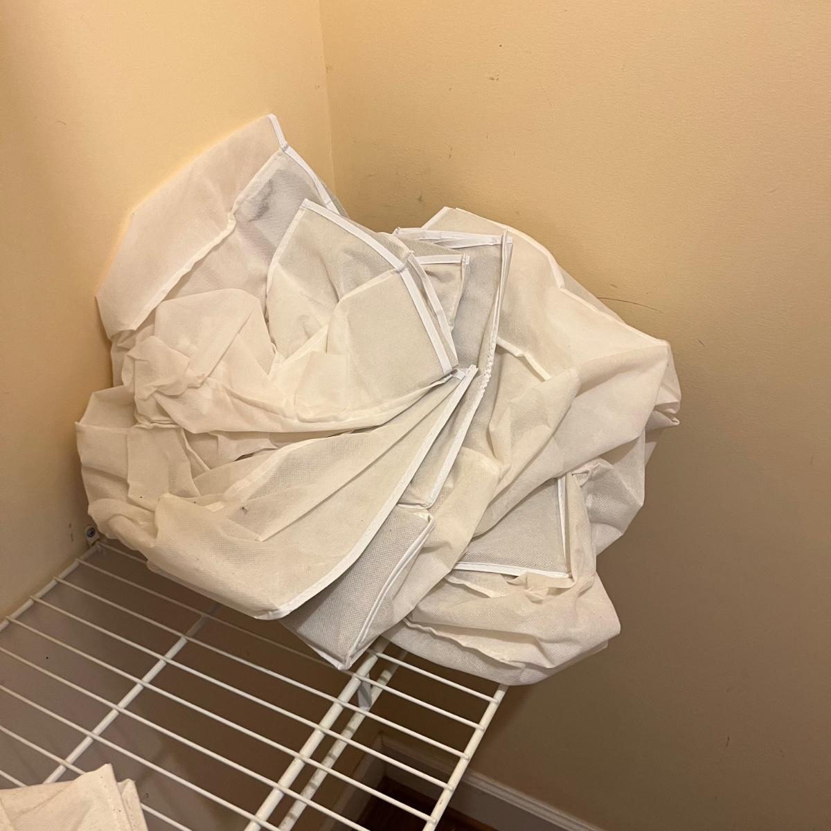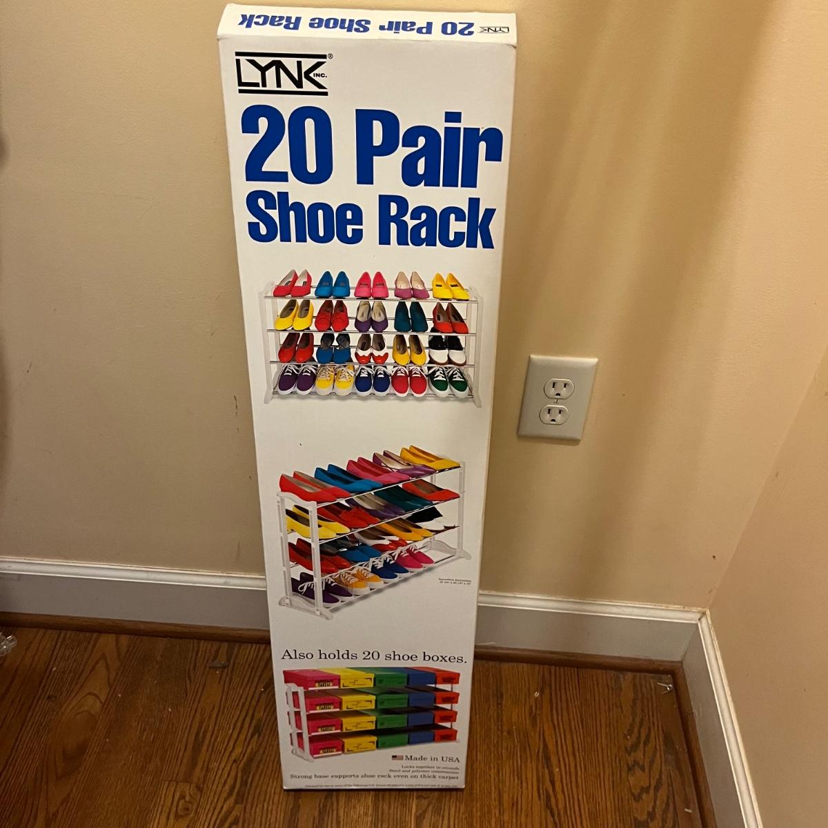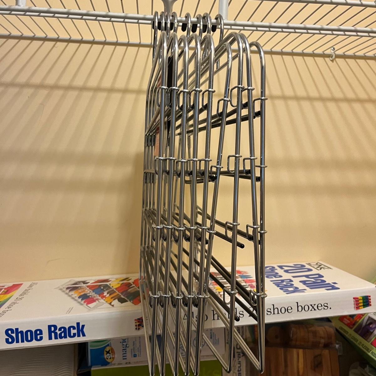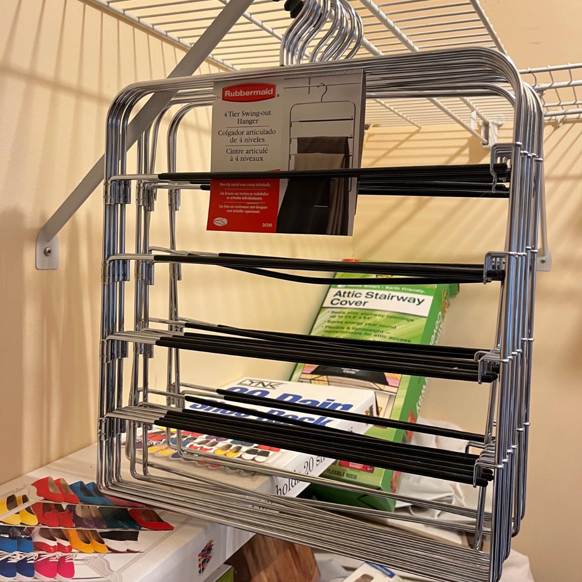Lot includes nine swing out hangers, sweater organizer, attic stairway cover, cedar blocks, hanging wardrobe, shoe hangers, space bags, twenty pair shoe rack and more.