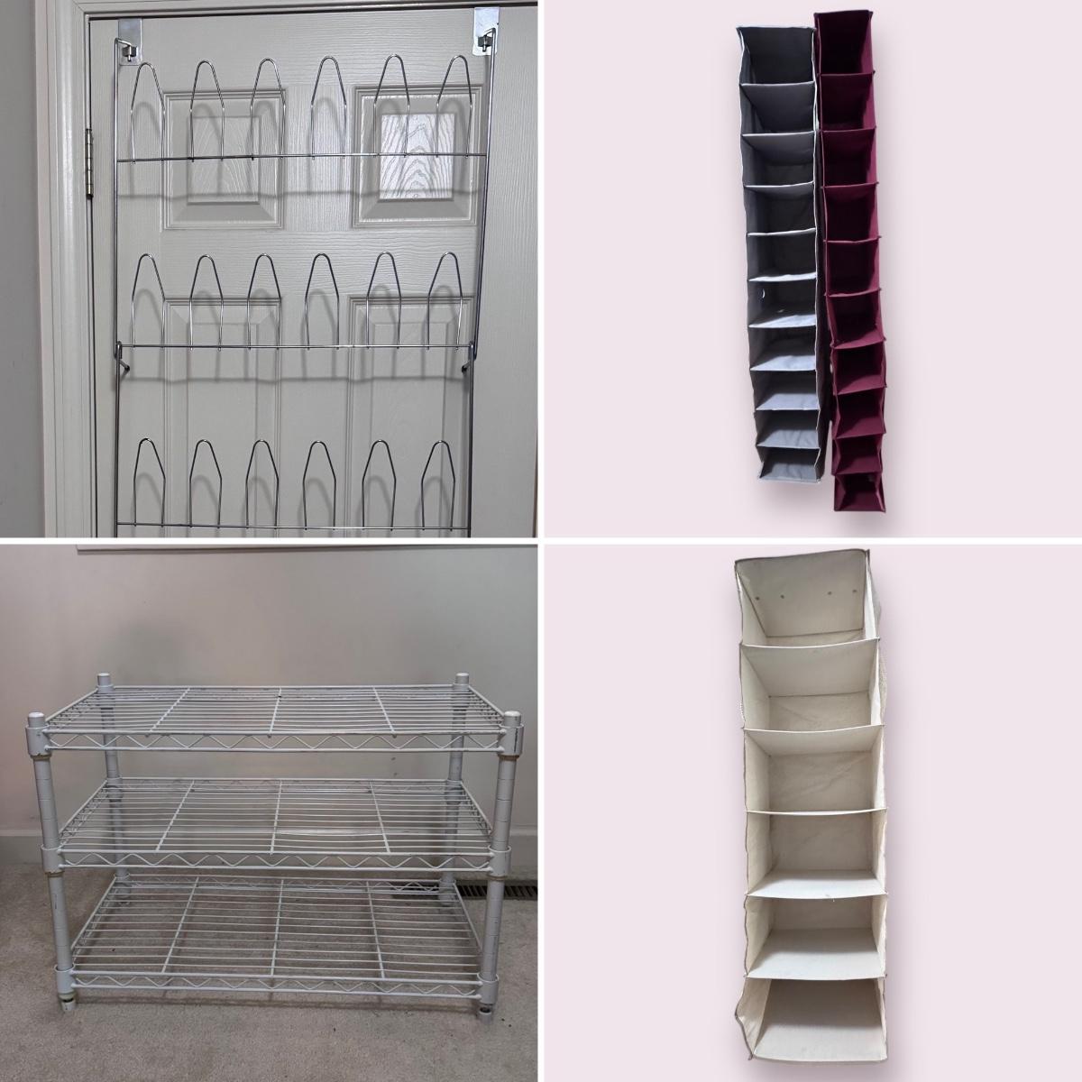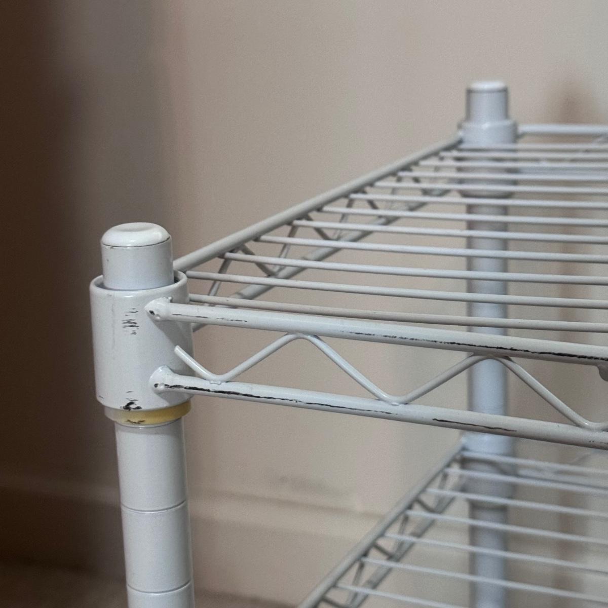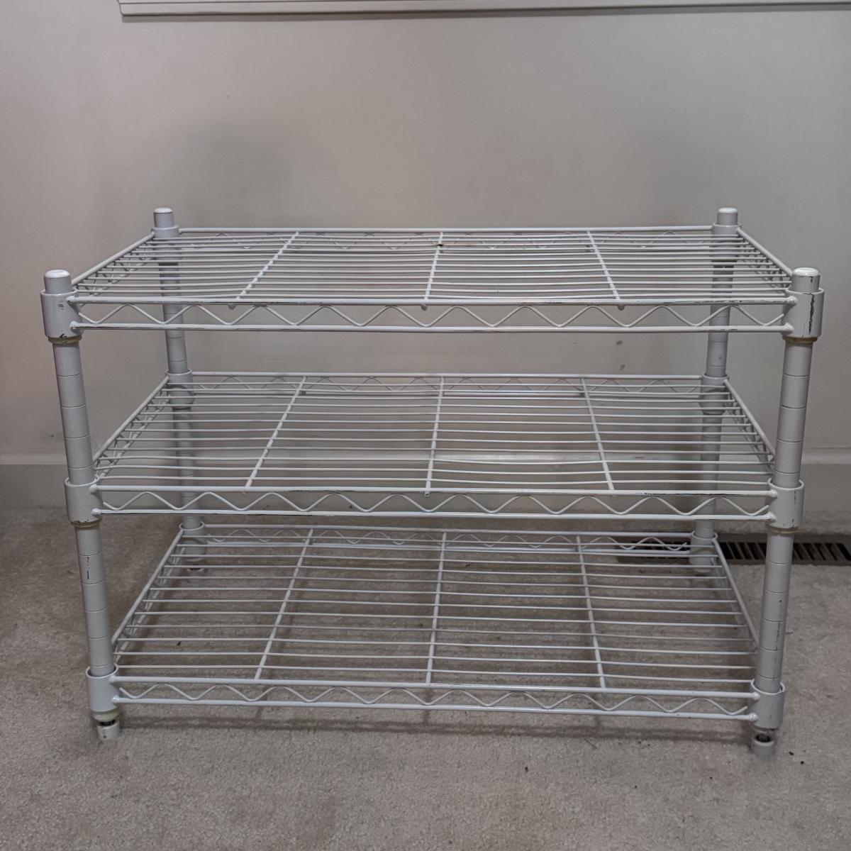 This lot includes a white metal storage shelving unit, three canvas collapsible storage shelves, and a metal over-the-door shoe rack. The shoe rack breaks down into three pieces. The white metal storage shelving unit measures 23” x 13” x 16”H. There is a small stain on the white canvas collapsible shelves - see picture included. Local pickup only.