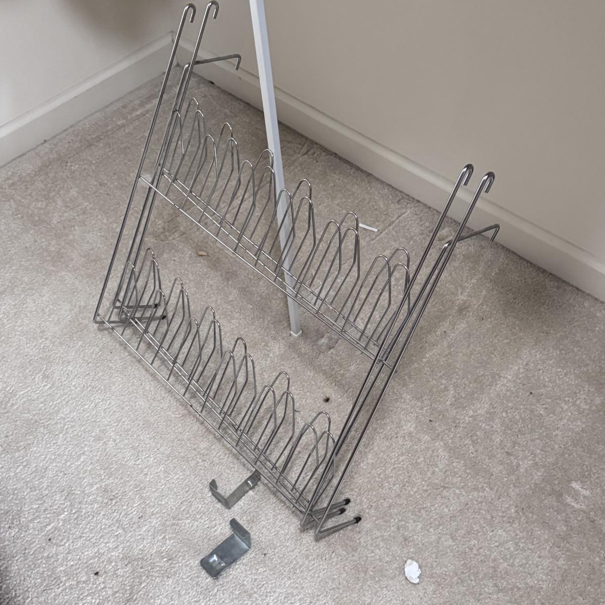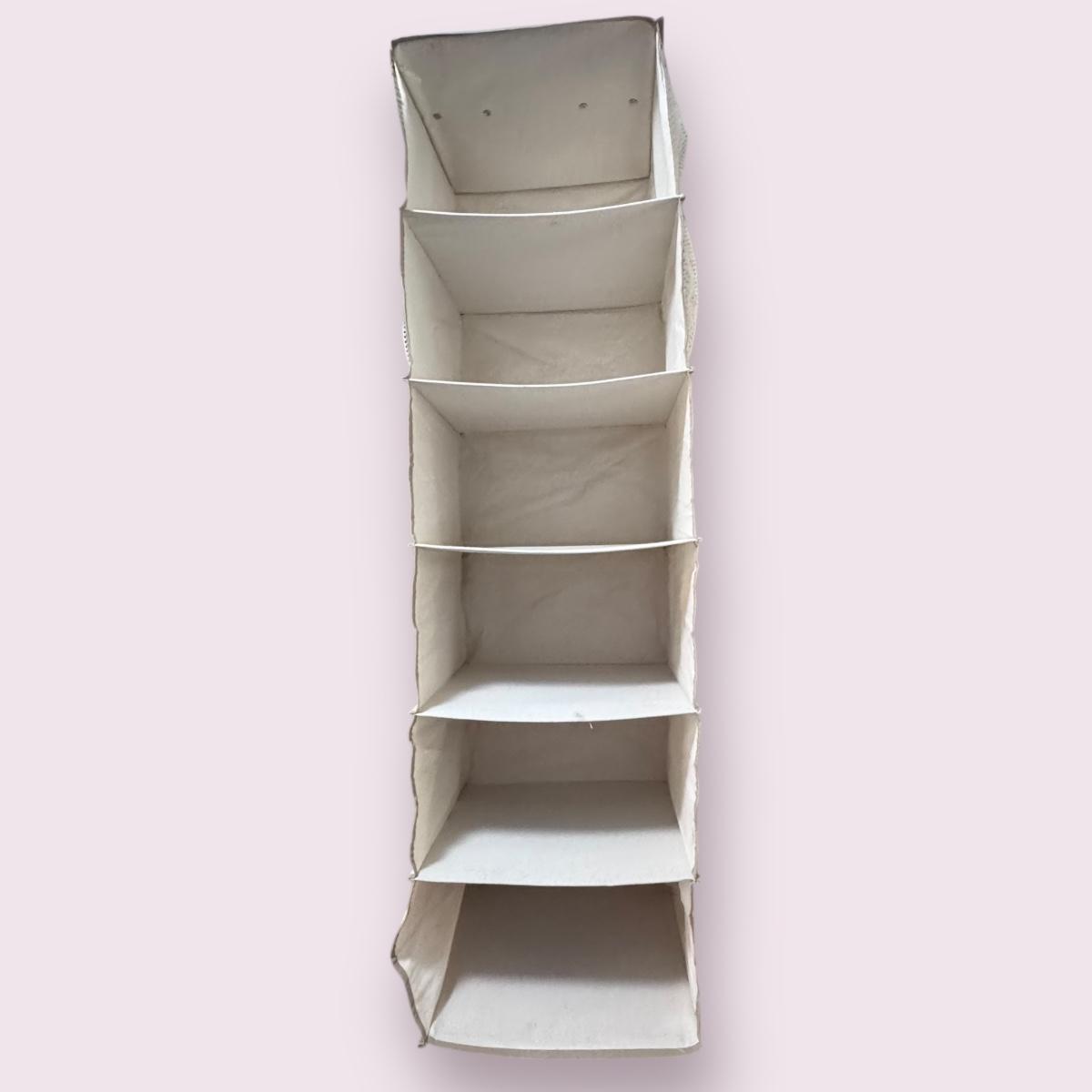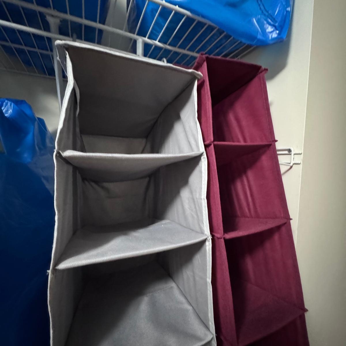 This lot includes a white metal storage shelving unit, three canvas collapsible storage shelves, and a metal over-the-door shoe rack. The shoe rack breaks down into three pieces. The white metal storage shelving unit measures 23” x 13” x 16”H. There is a small stain on the white canvas collapsible shelves - see picture included. Local pickup only.