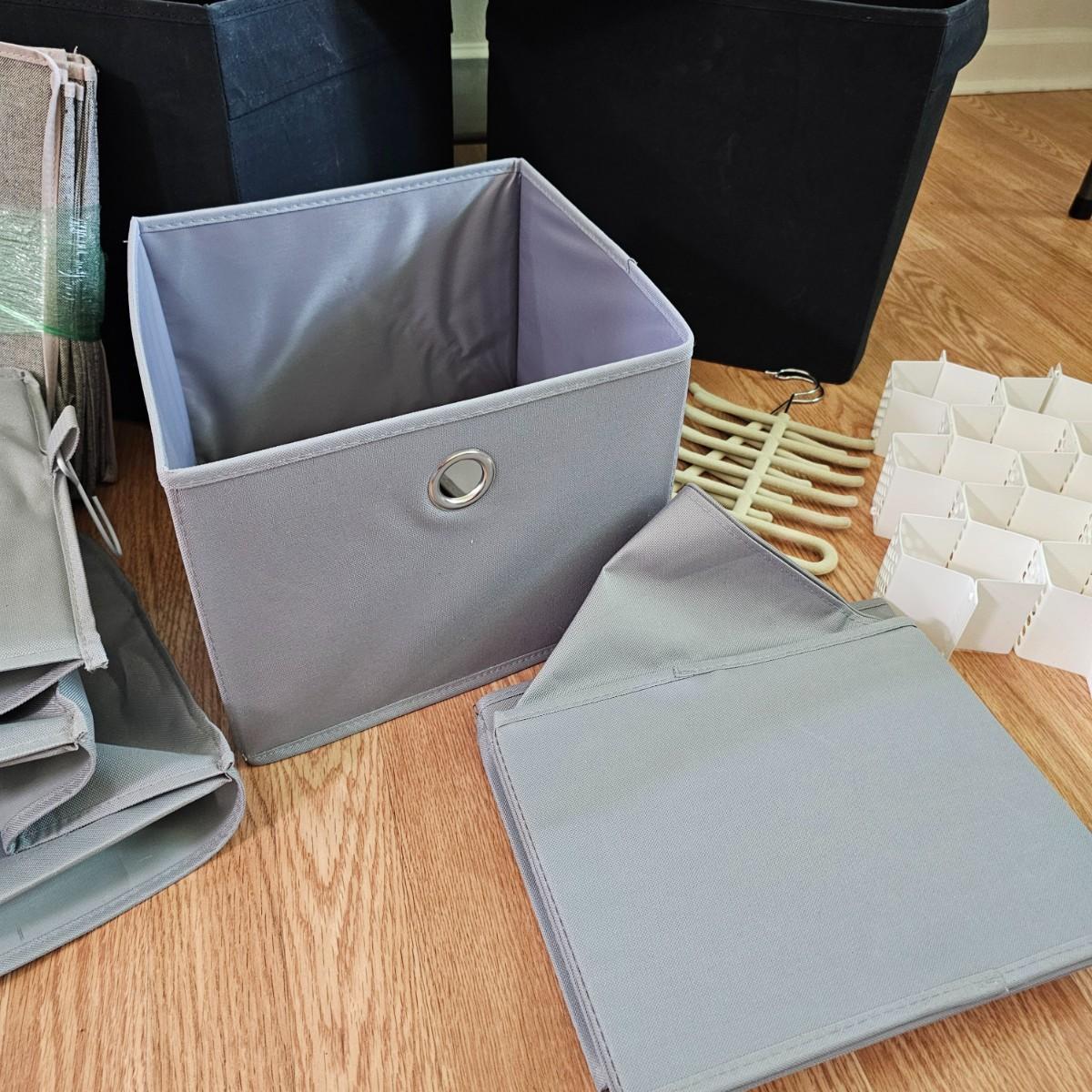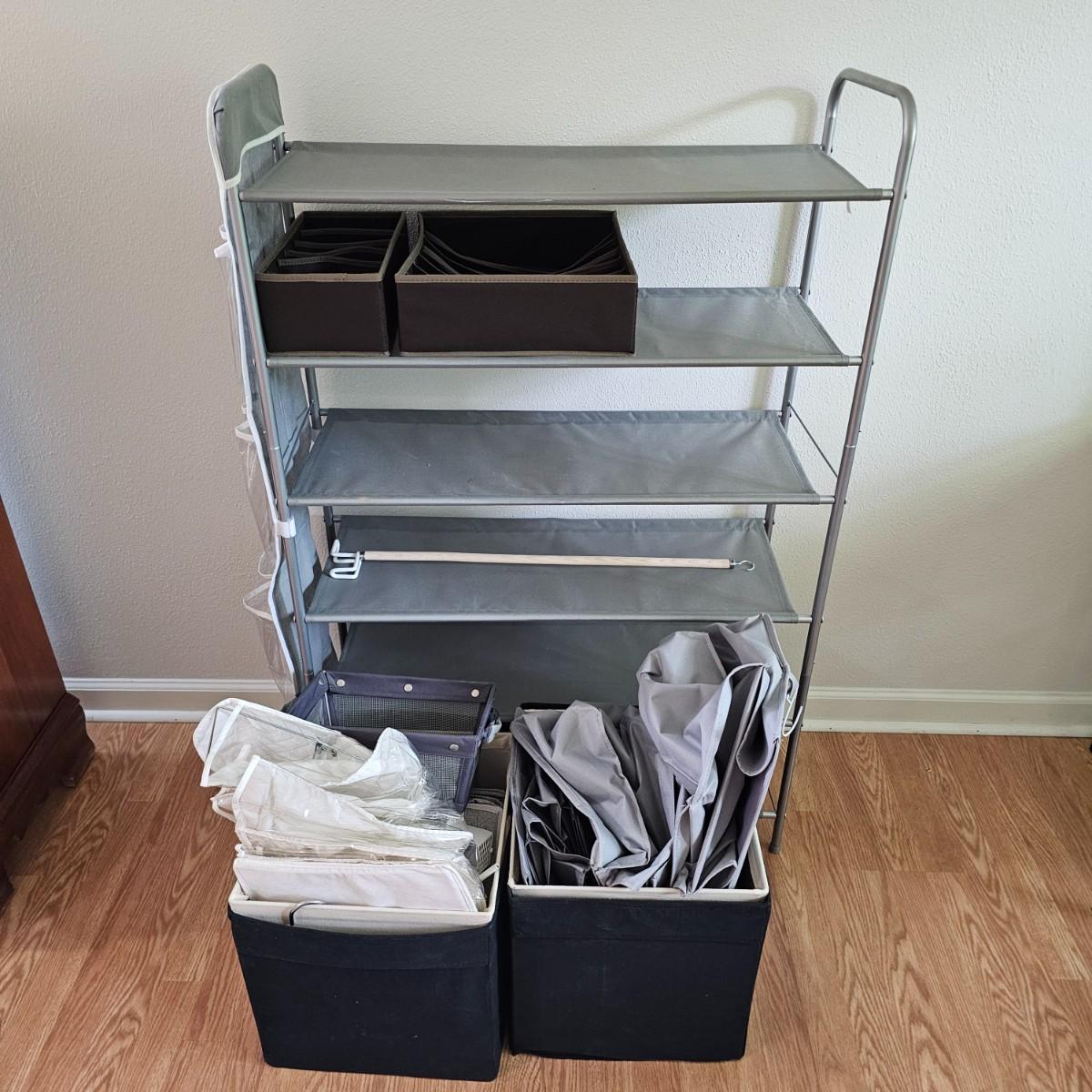 One stationary six shelf rack, 31"W x 12"D x 48"H. Cloth shelves on metal frame. Two hanging expandable cubby storage pieces, 12"W x 12"D x 48"H. Small hanging shoe holder. Several fold down/expandable fabric boxes, from 12"W x 12"D x 8"H to 13"W x 17"D x 13"H. Miscellaneous hangers and smaller items. Wooden handled piece is a button fastening tool. See photos for details. Rack can be easily dismantled with a phillips screwdriver. Local pickup only.