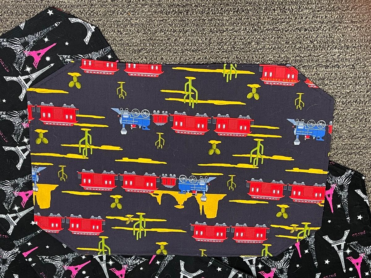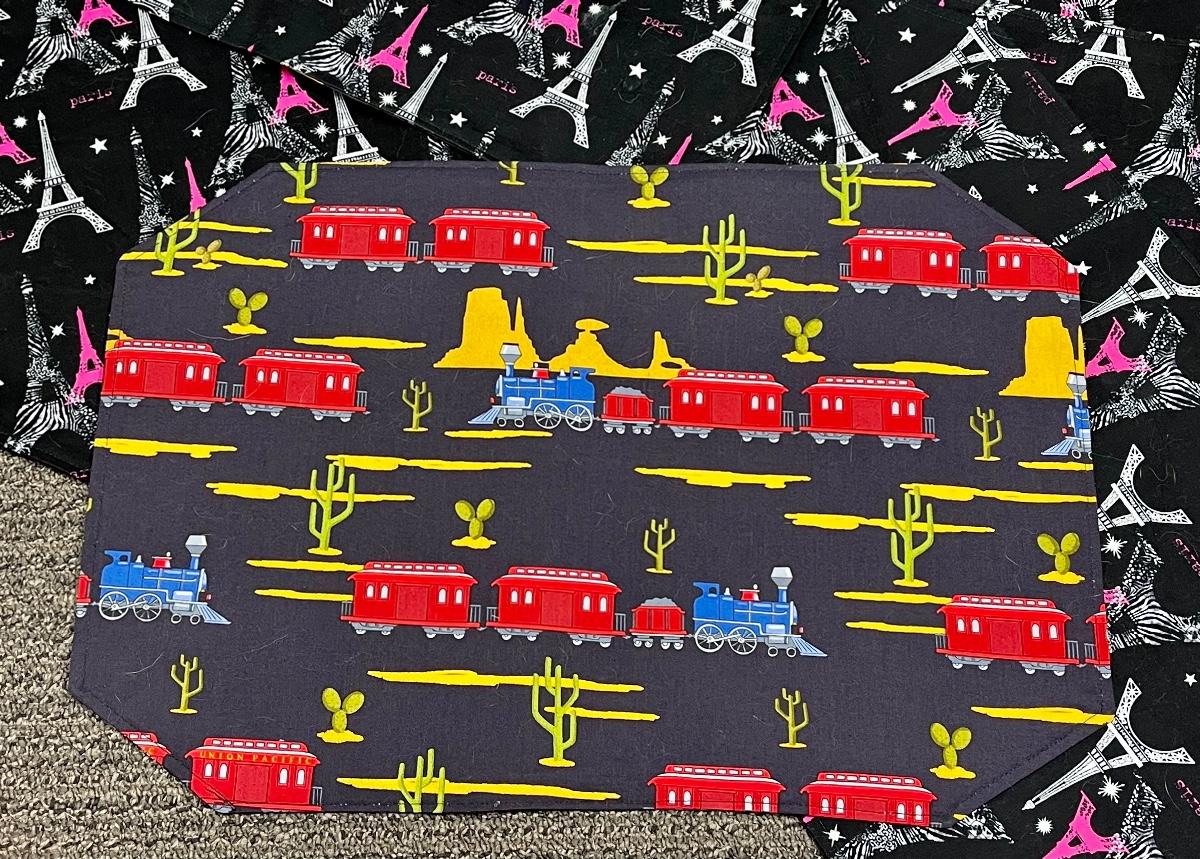 10 Cloth placemats, homemade, Paris Eiffel tower on one side, trains on the other side