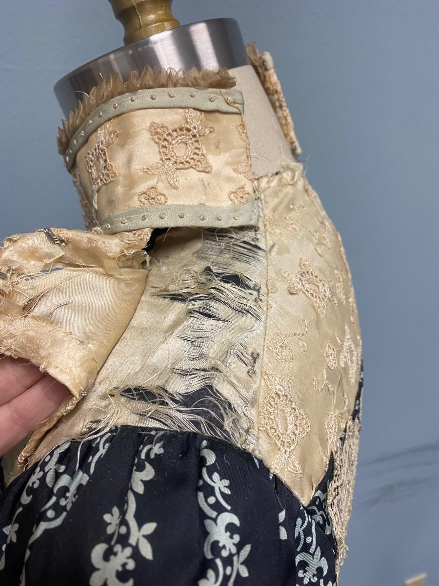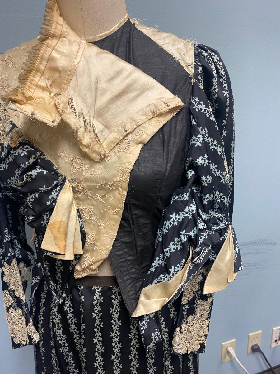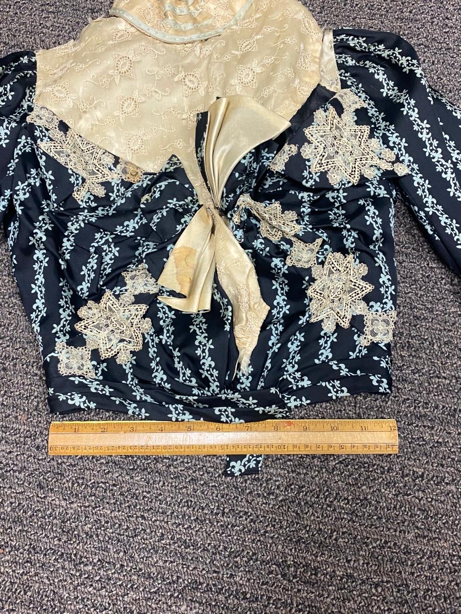 Antique Blue Floral Striped Ivory Lace Victorian Two-Piece Gala Opera Party Dress Bodice Skirt. In good vintage condition. Material feels like silk. Bodice and skirt are small, do not fit mannequin well. There is tearing to the inside lining fabric of top. Fully boned, hook and eye closure. With a little fixing it is probably wearable with care. Some photos make the fabric look black, but it is a dark navy with turquoise print. See photos.