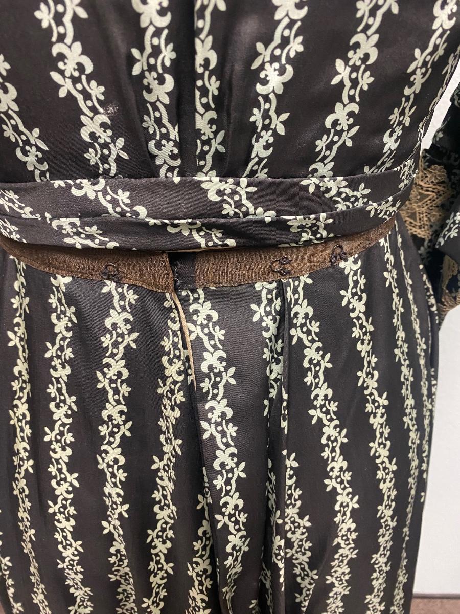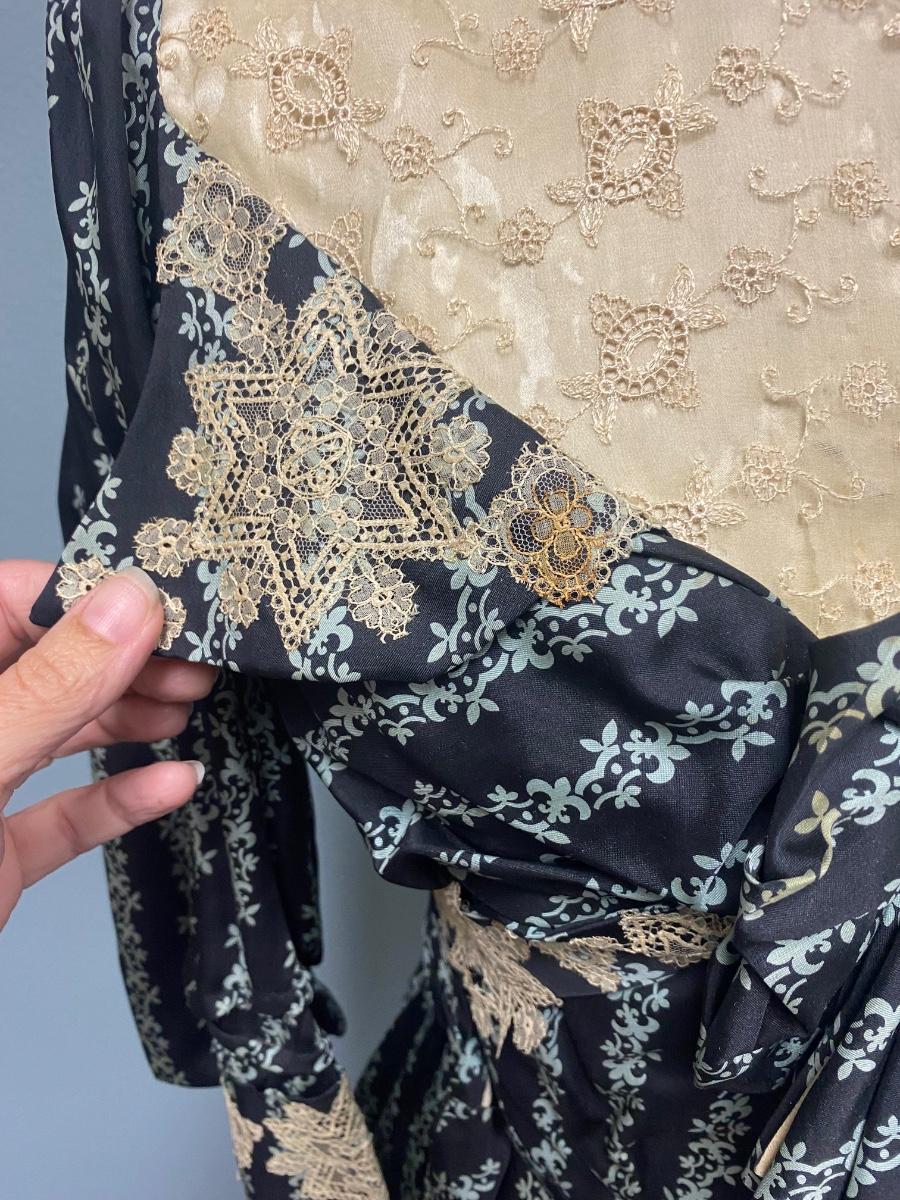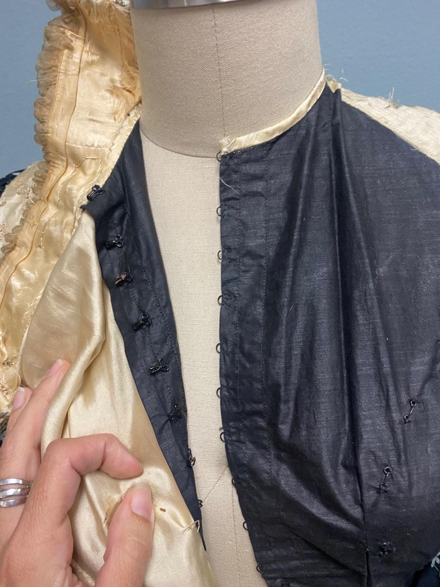 Antique Blue Floral Striped Ivory Lace Victorian Two-Piece Gala Opera Party Dress Bodice Skirt. In good vintage condition. Material feels like silk. Bodice and skirt are small, do not fit mannequin well. There is tearing to the inside lining fabric of top. Fully boned, hook and eye closure. With a little fixing it is probably wearable with care. Some photos make the fabric look black, but it is a dark navy with turquoise print. See photos.