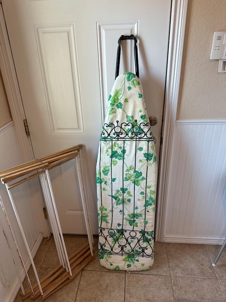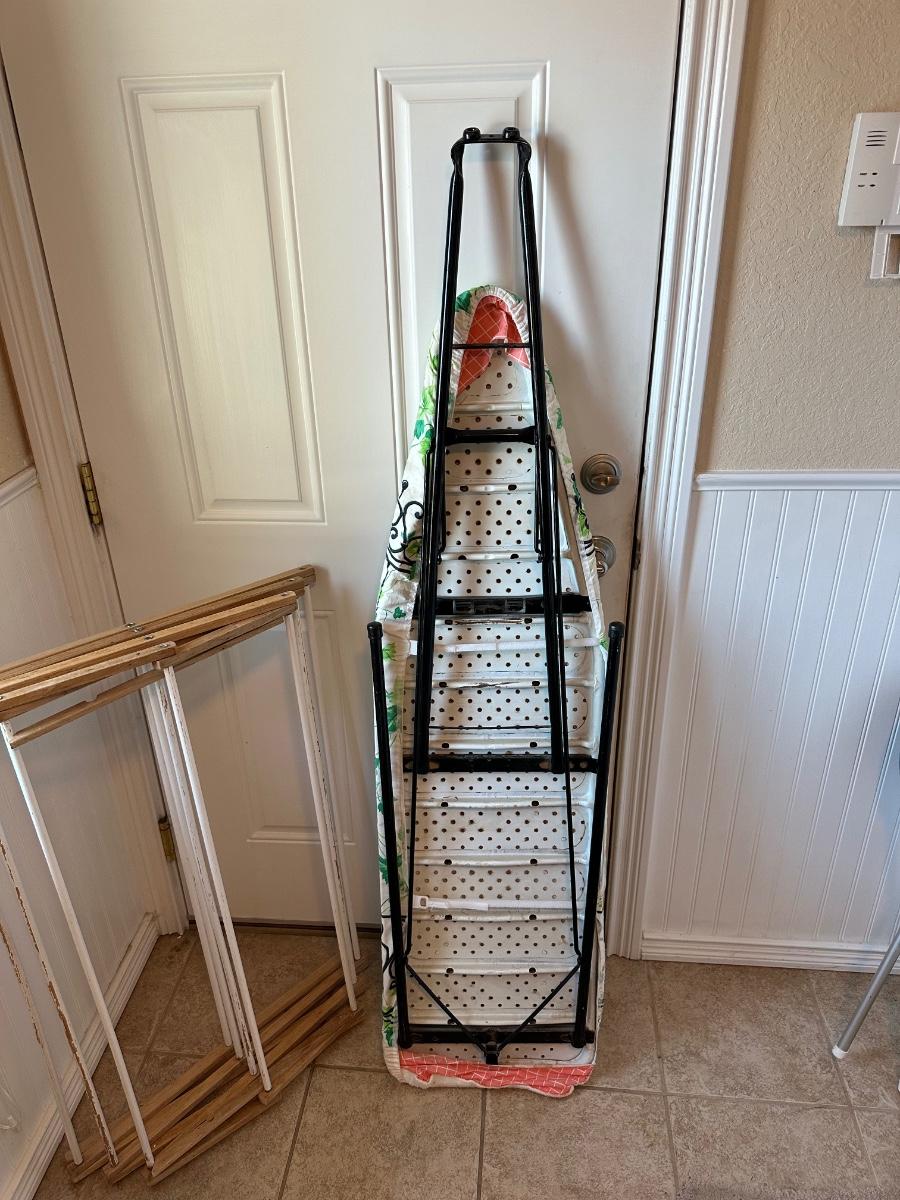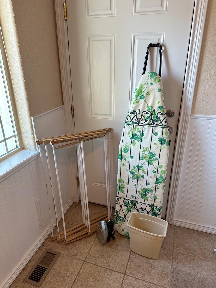 CLOTHES DRYING RACK, IRONING BOARD, BLACK & DECKER - THE CLASSIC STEAM AND DRY IRON AND WASTE BASKET