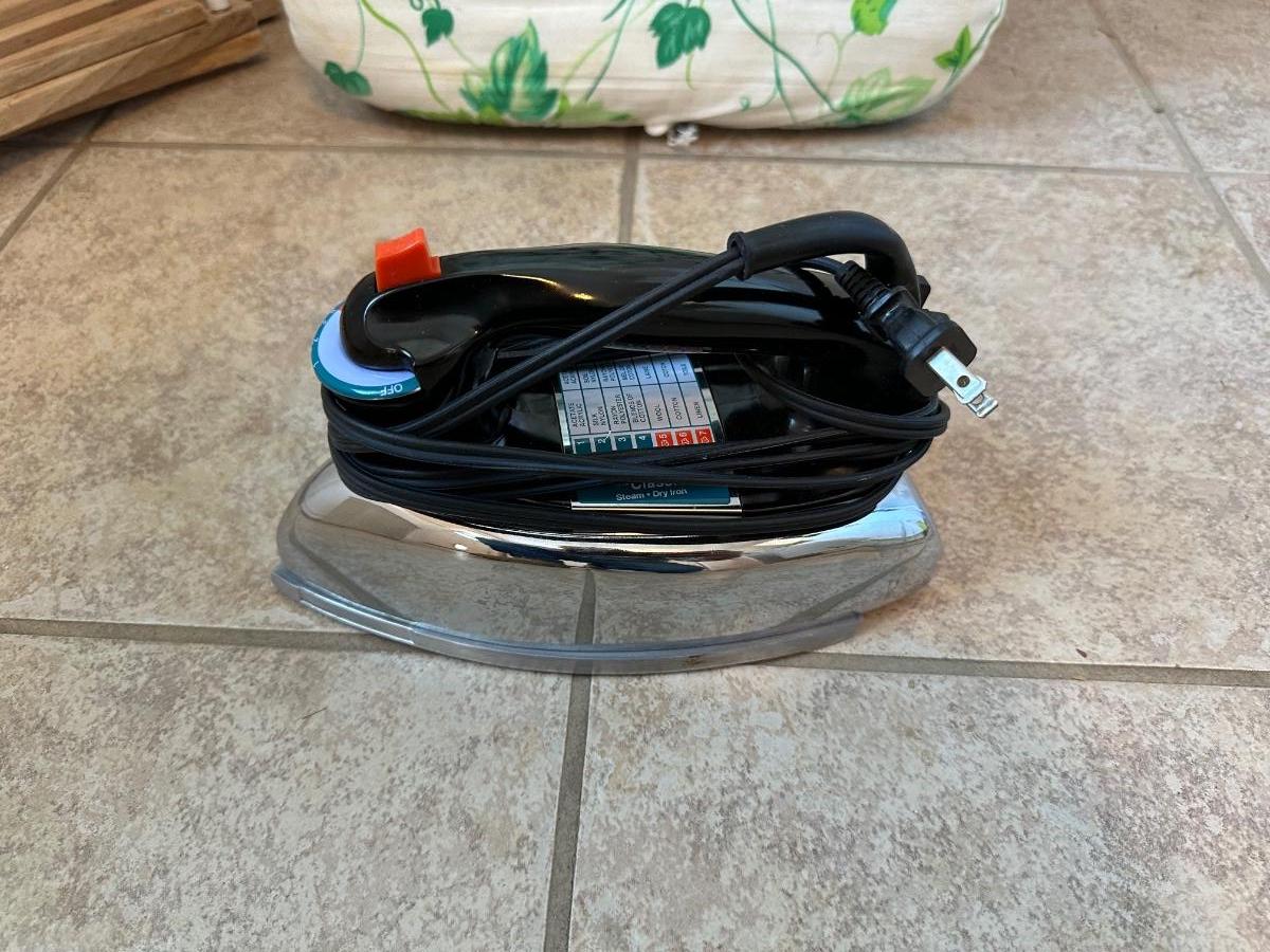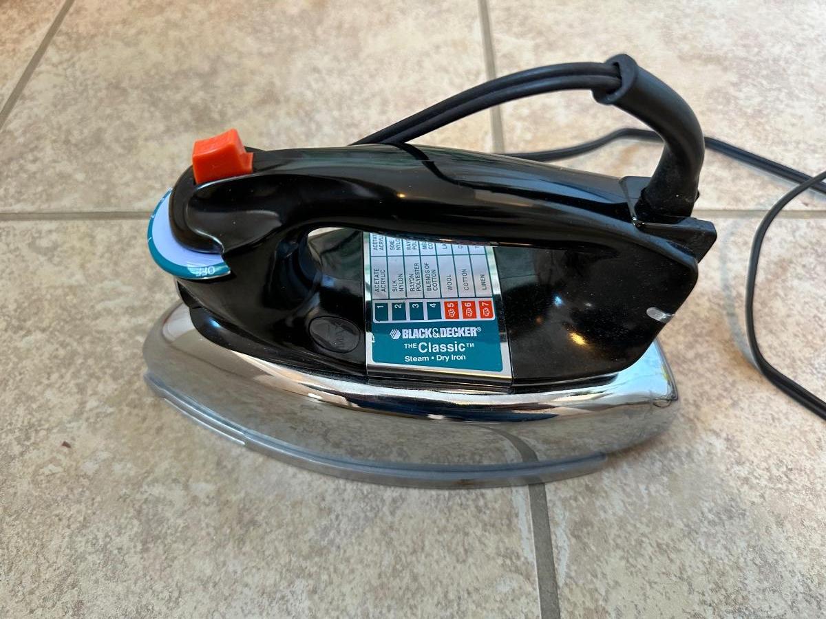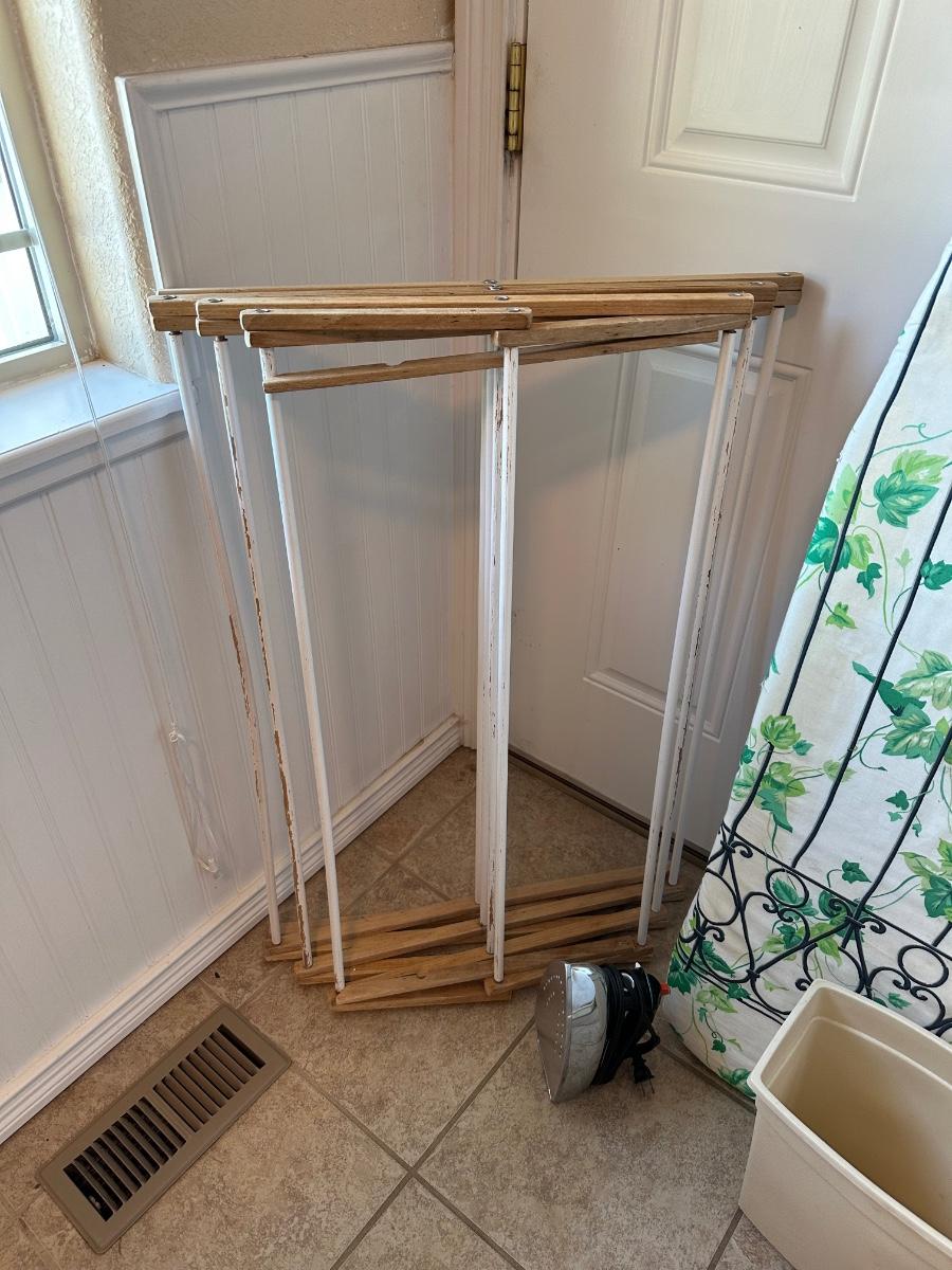 CLOTHES DRYING RACK, IRONING BOARD, BLACK & DECKER - THE CLASSIC STEAM AND DRY IRON AND WASTE BASKET