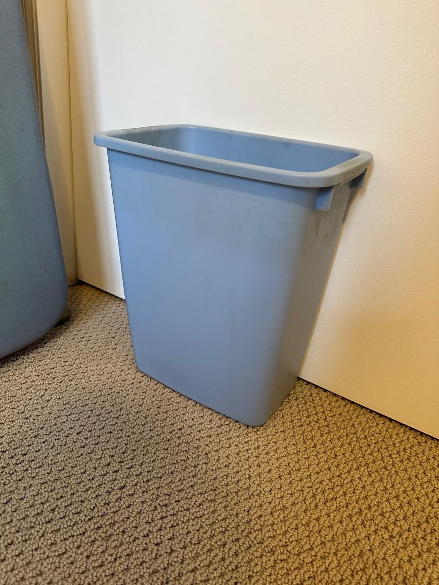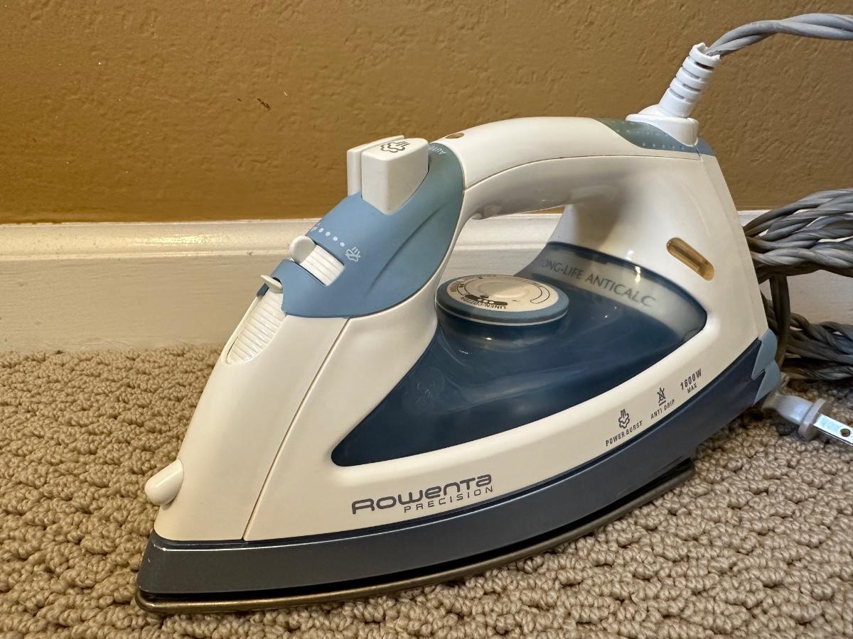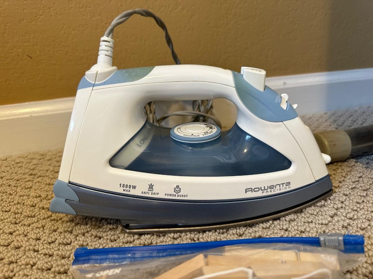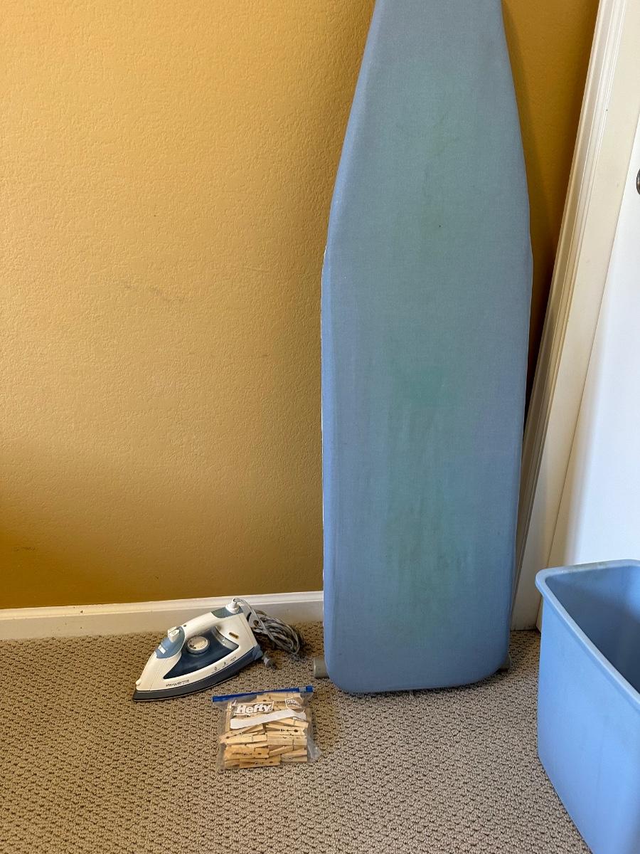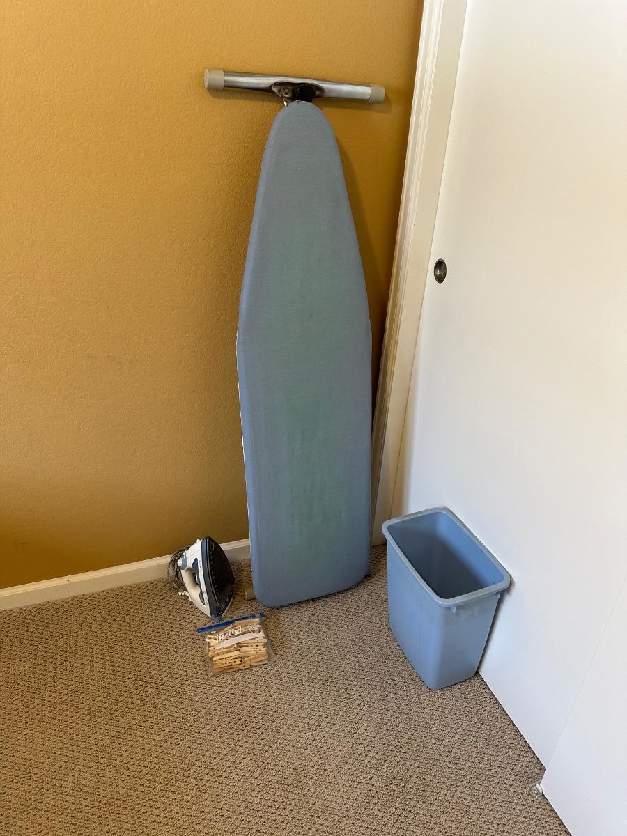 ROWENTA CLOTHES IRON, IRONING BOARD, WASTE CAN