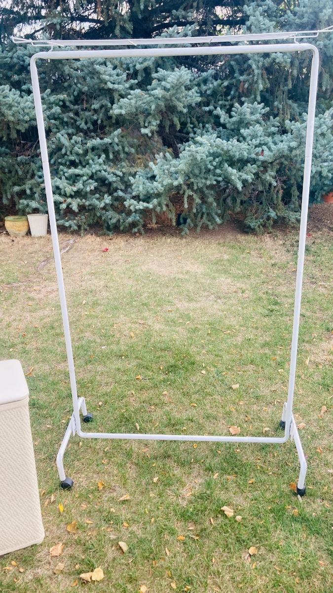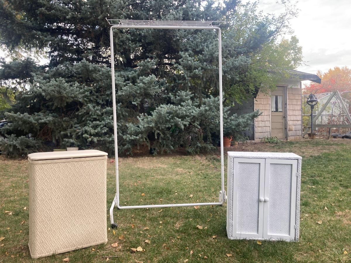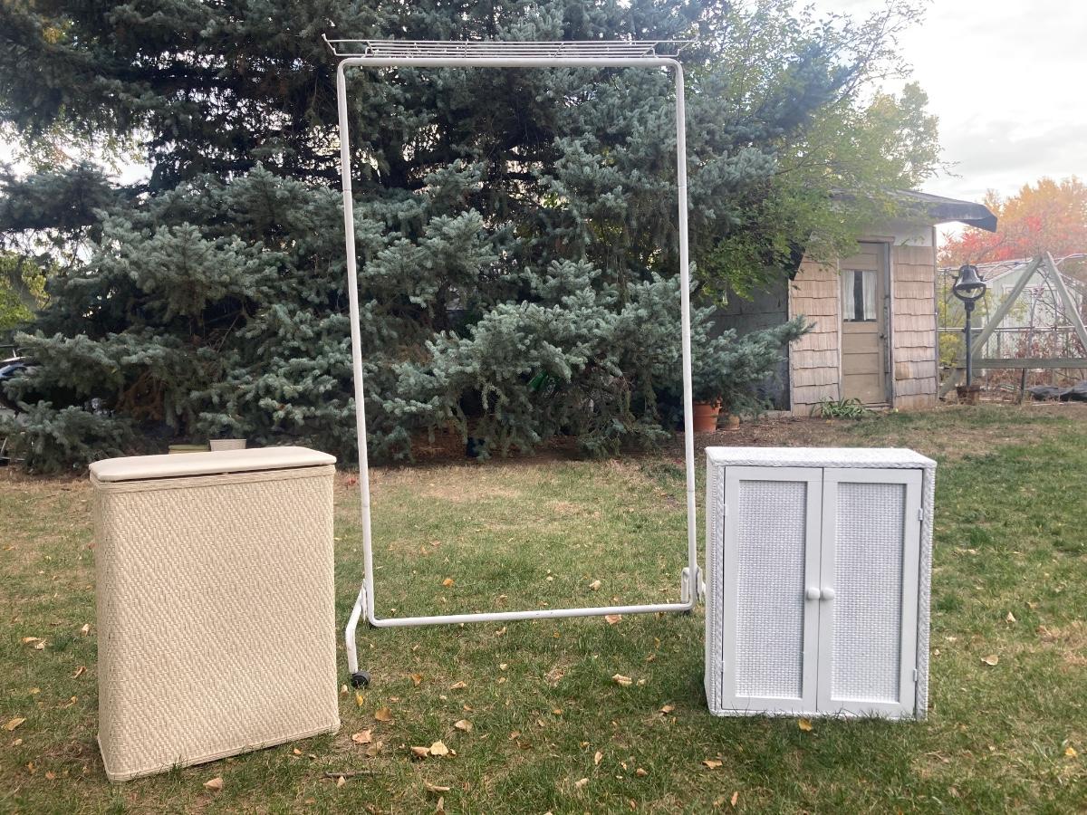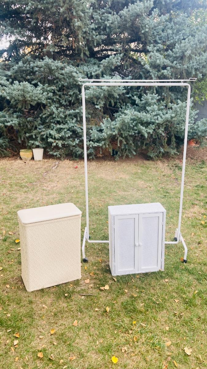 GARMENT RACK, LAUNDRY HAMPER, AND LITTLE WHITE CABINET