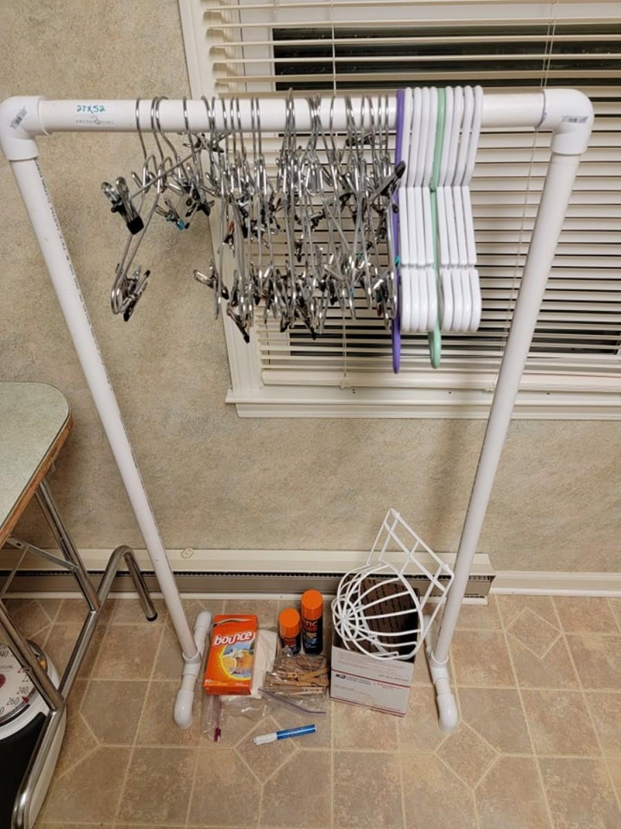 clothing rack, hangers, hat dishwater safe basket and misc laundry supplies