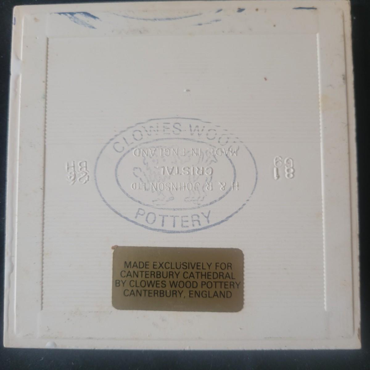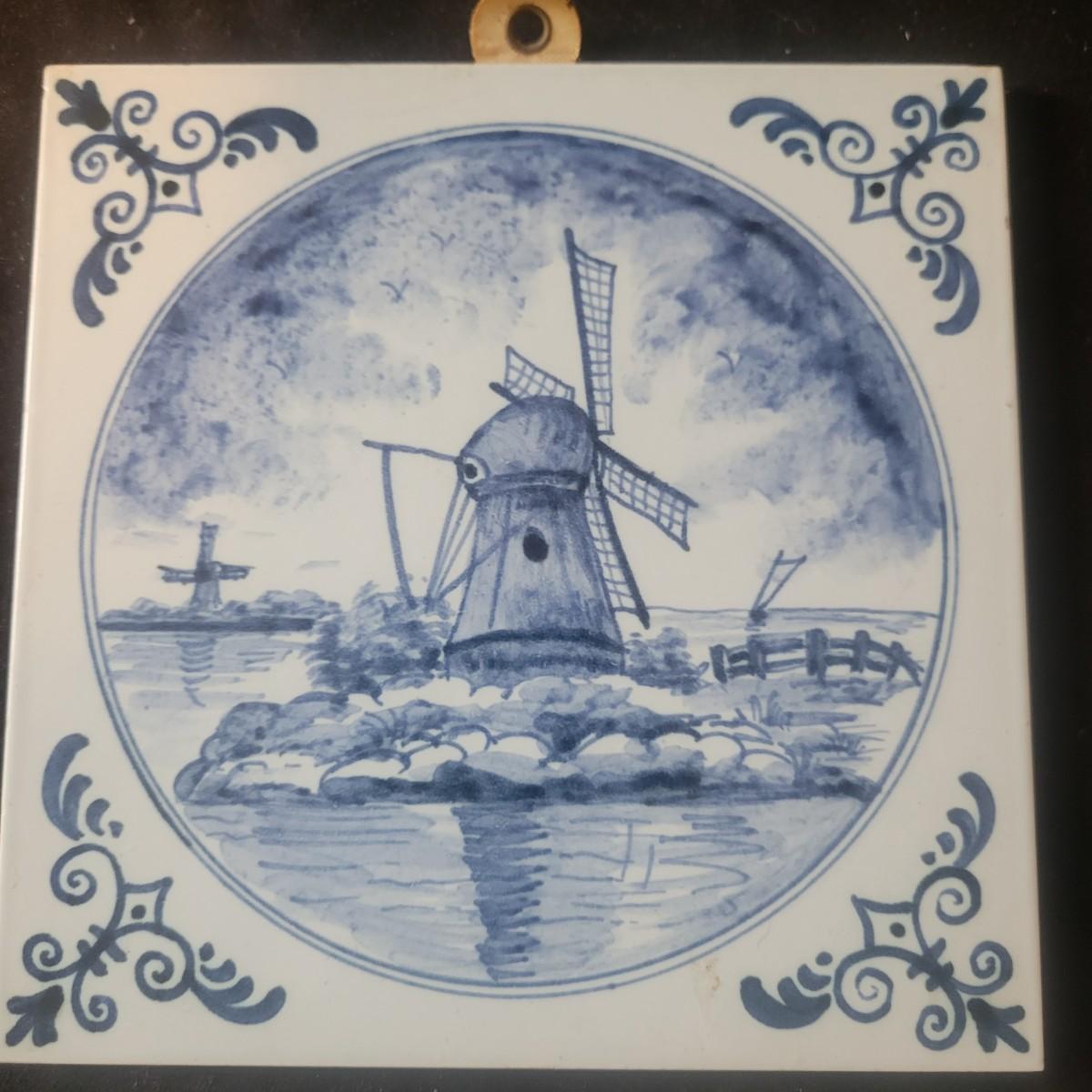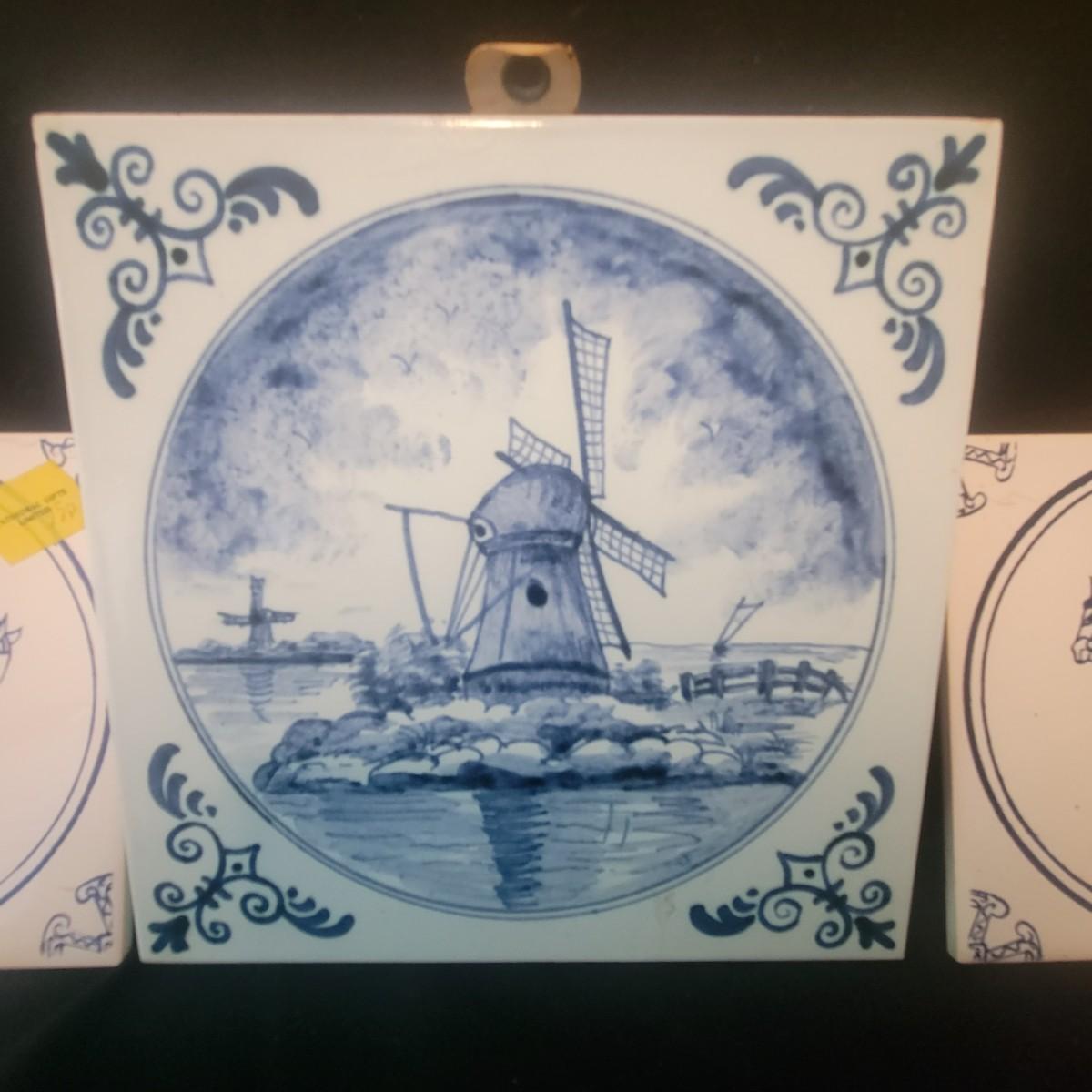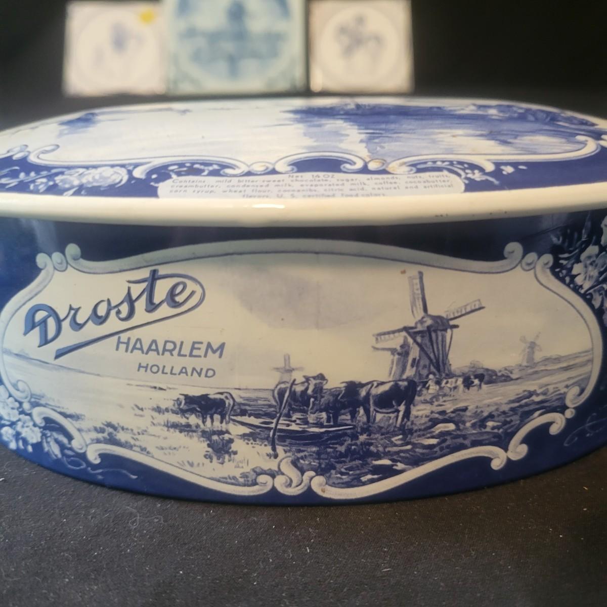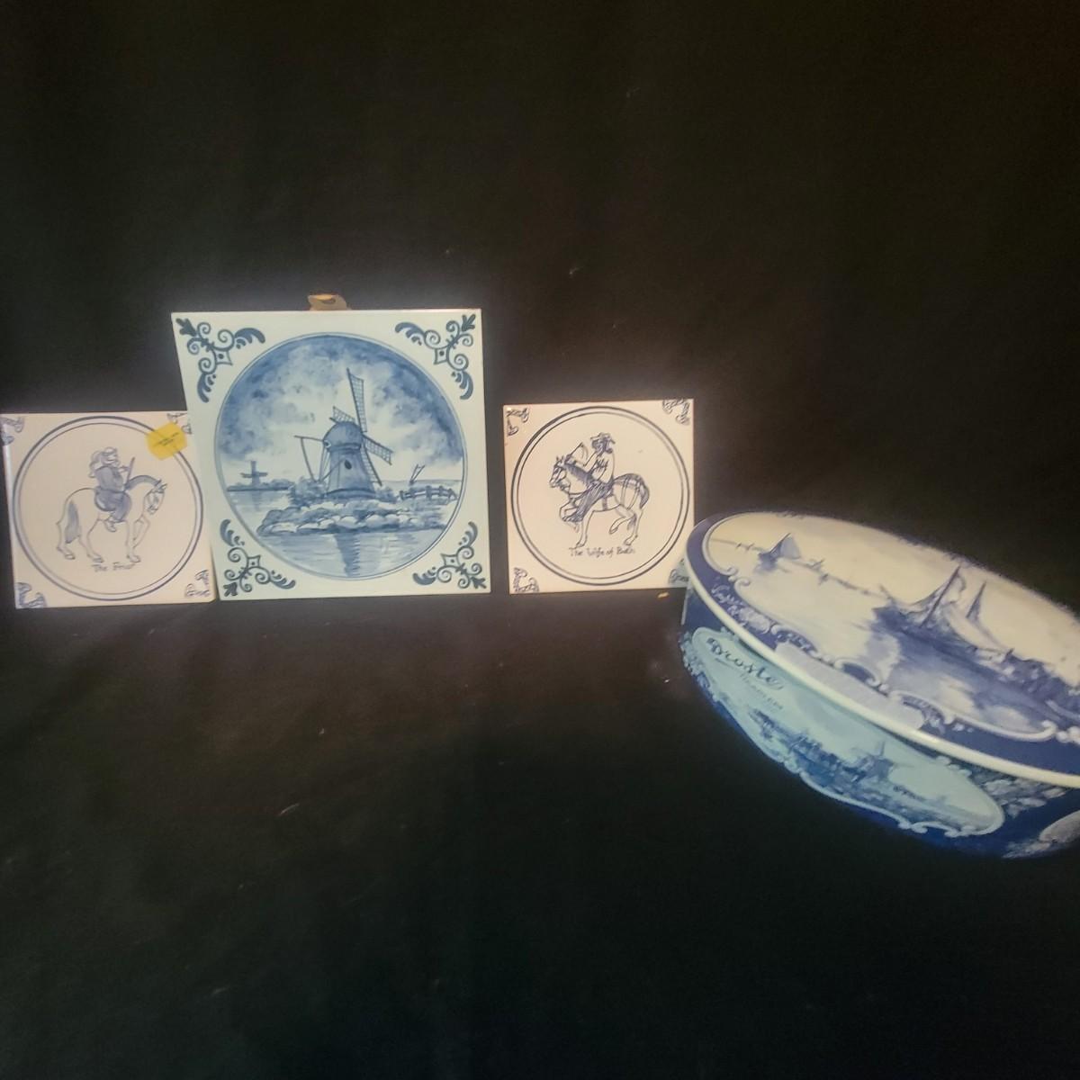 2 Clowes Wood Pottery tiles made exclusively for Canterbury Cathedral in good condition. One is the wife of bath and the other is the friar. Larger Delft tile is manufactured in Holland and depicts a windmill in good condition. Drotse tin from Holland in good condition. Tin measures approximately 7.5" x 5" x 2.75" Shipping available