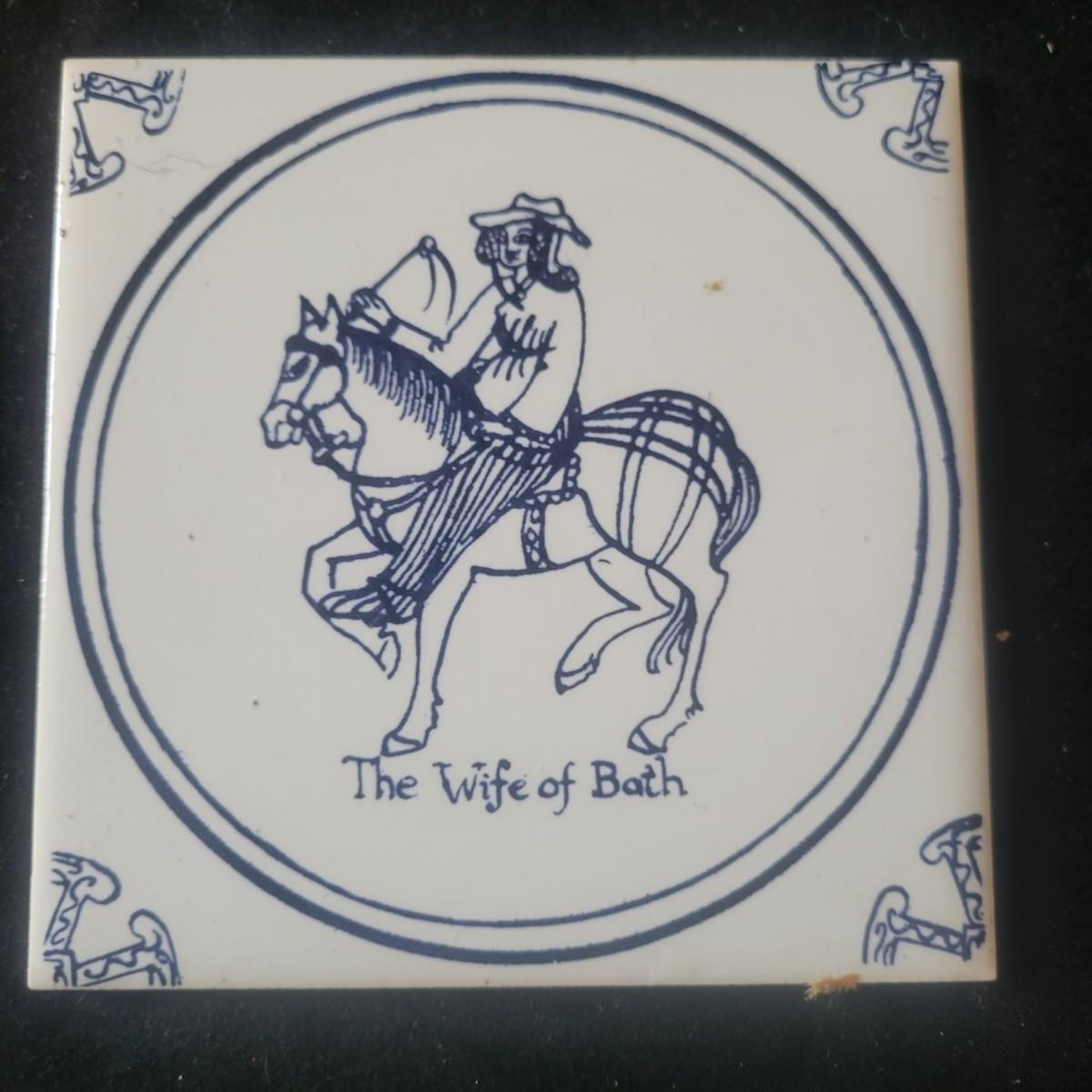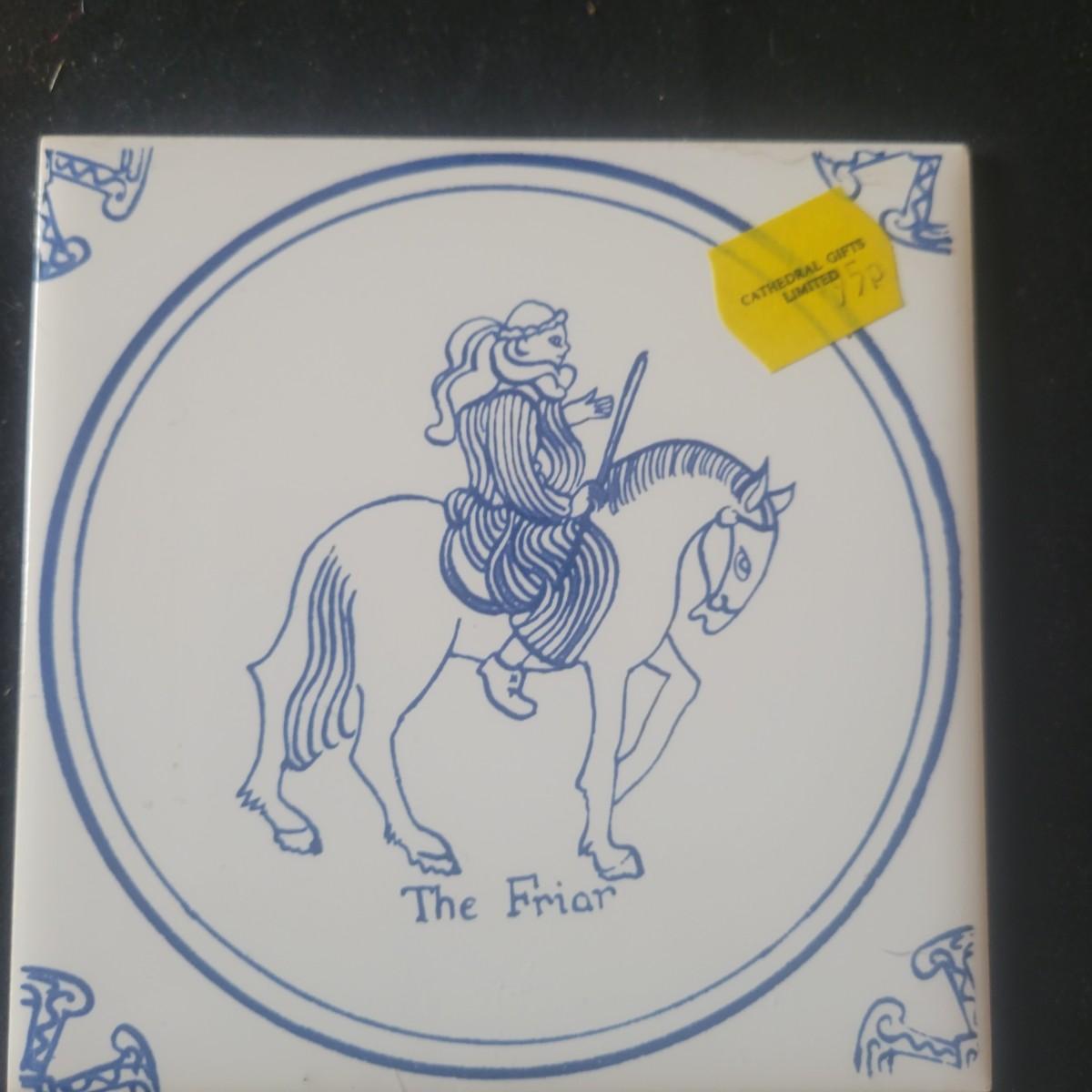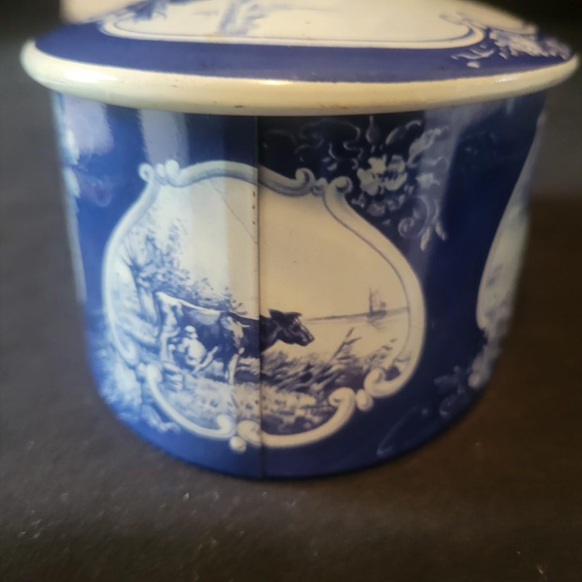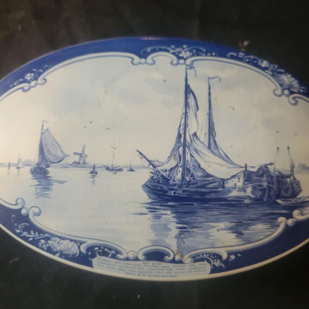 2 Clowes Wood Pottery tiles made exclusively for Canterbury Cathedral in good condition. One is the wife of bath and the other is the friar. Larger Delft tile is manufactured in Holland and depicts a windmill in good condition. Drotse tin from Holland in good condition. Tin measures approximately 7.5" x 5" x 2.75" Shipping available