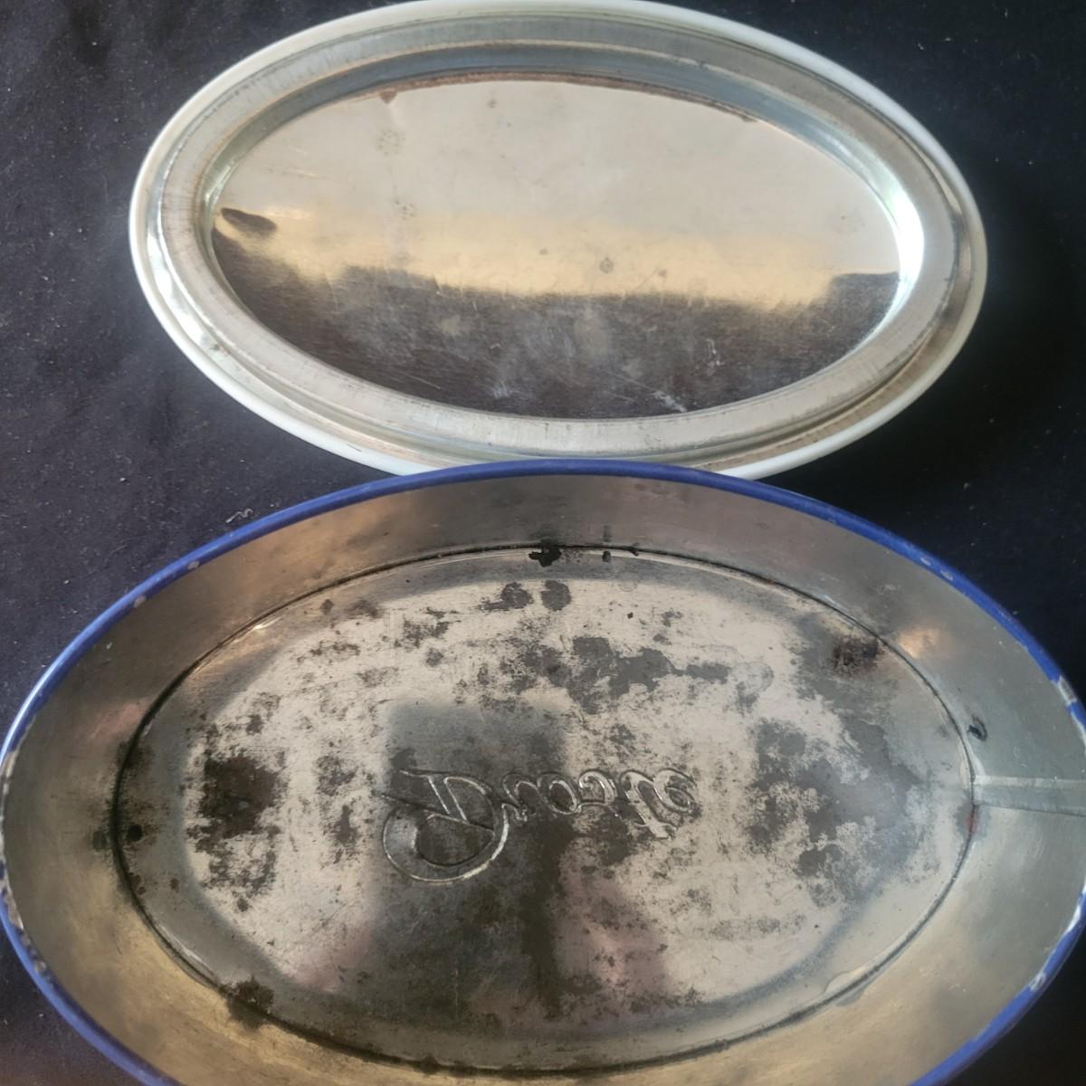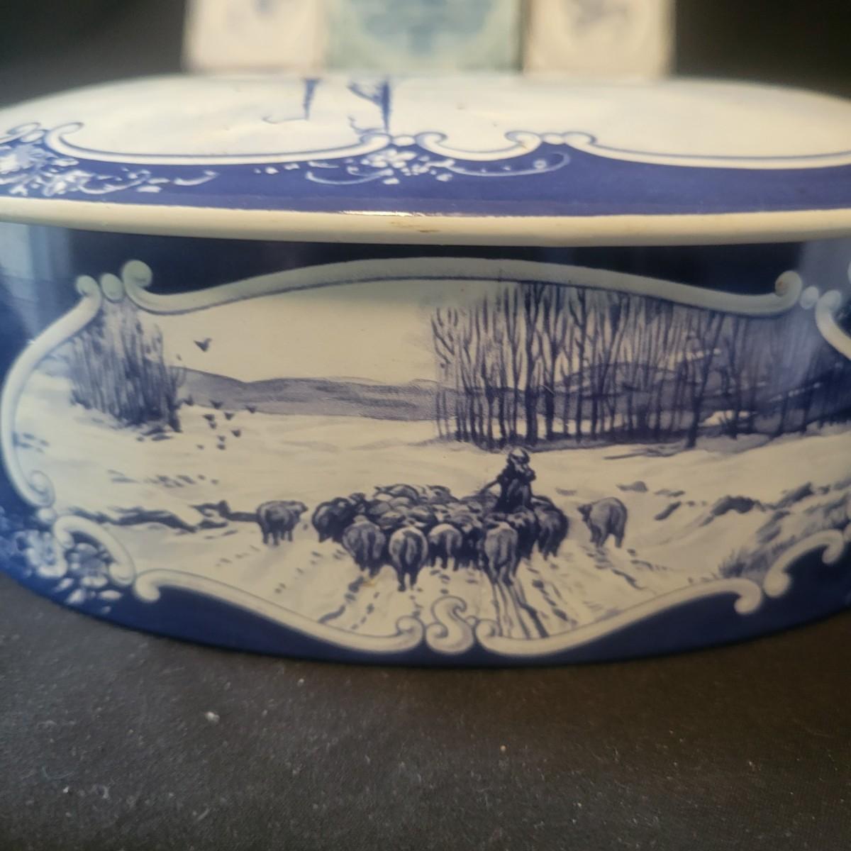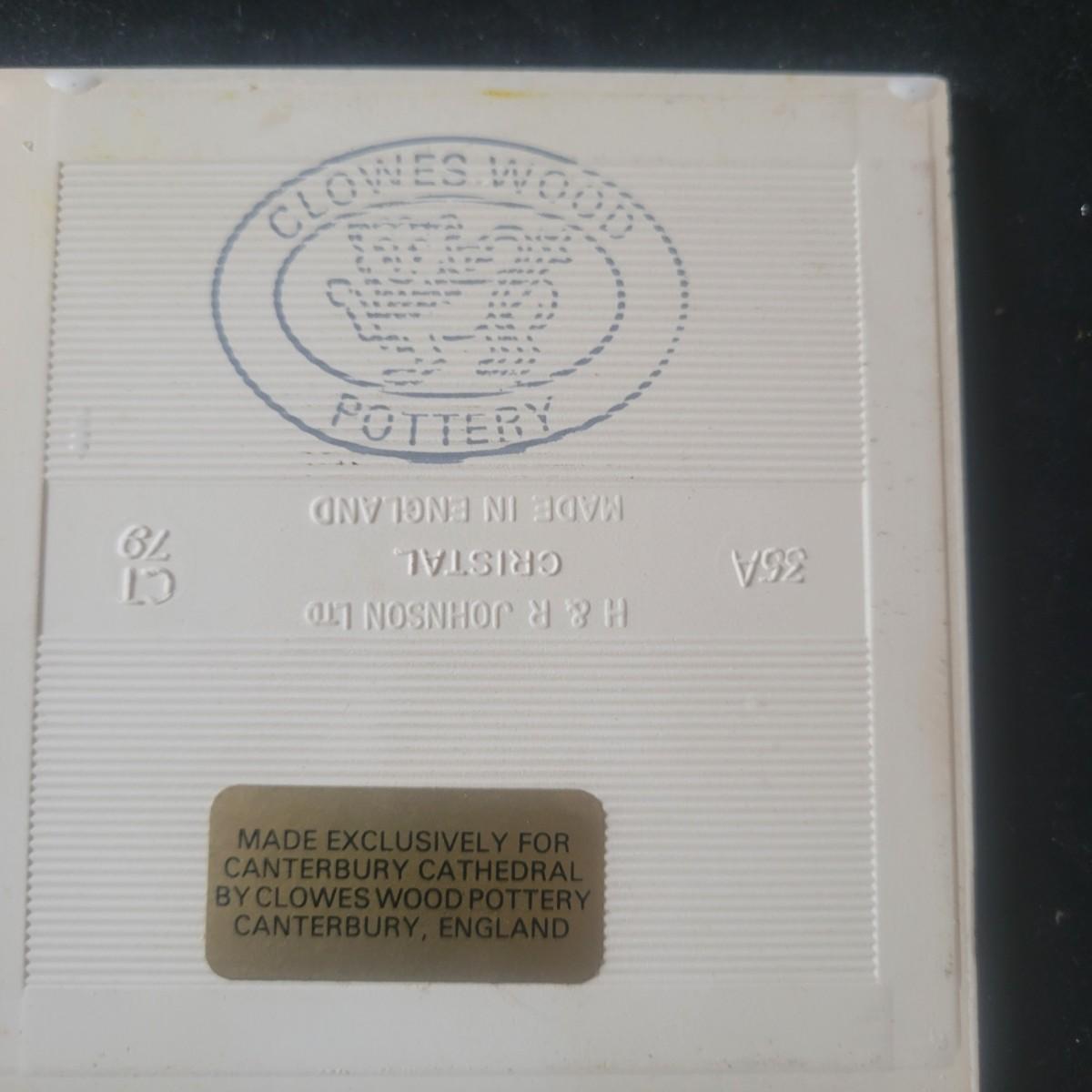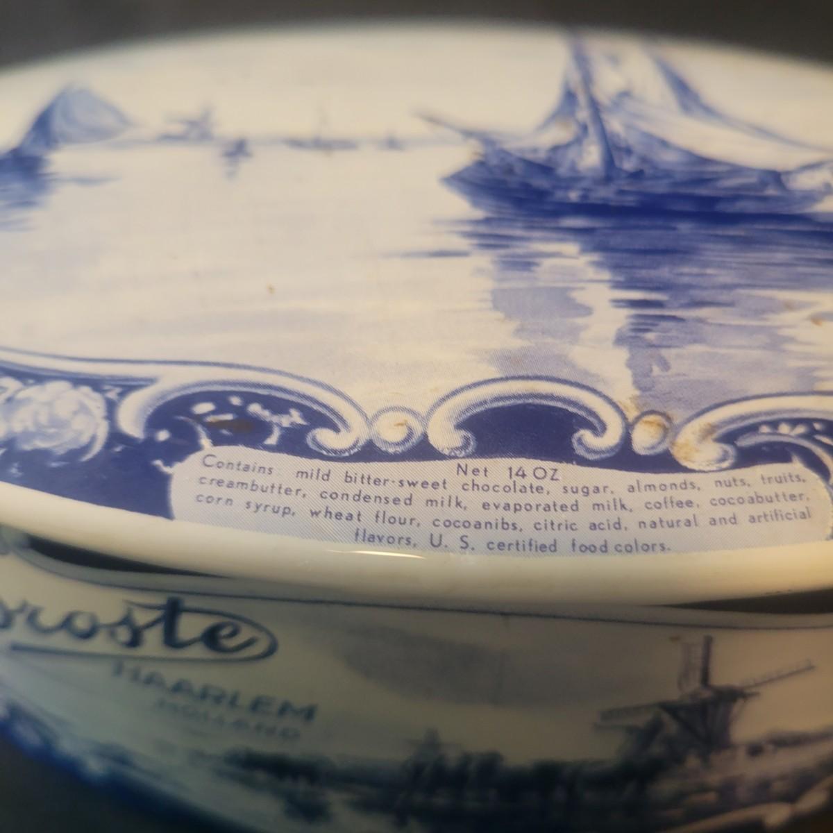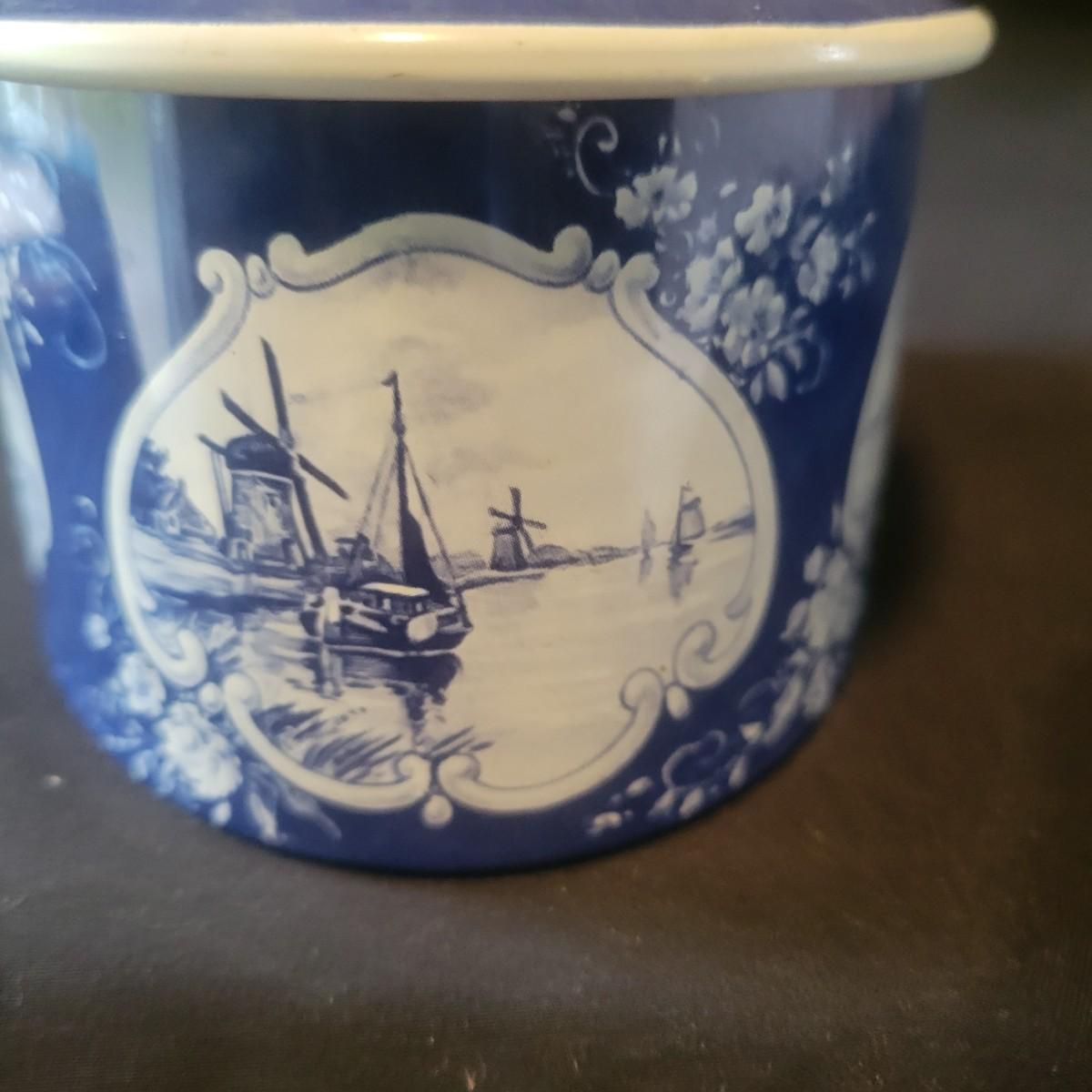 2 Clowes Wood Pottery tiles made exclusively for Canterbury Cathedral in good condition. One is the wife of bath and the other is the friar. Larger Delft tile is manufactured in Holland and depicts a windmill in good condition. Drotse tin from Holland in good condition. Tin measures approximately 7.5" x 5" x 2.75" Shipping available
