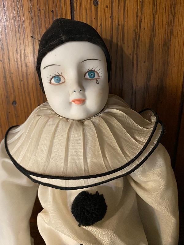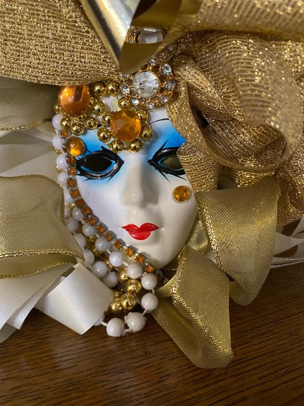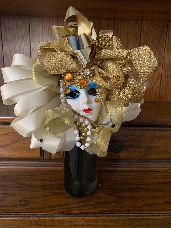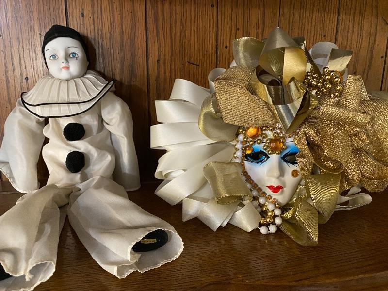 Mime Clown doll and a Masquerade Mask bottle decor. A little dusty from display. Mask is made to sit on a bottle, like wine, as seen in picture.