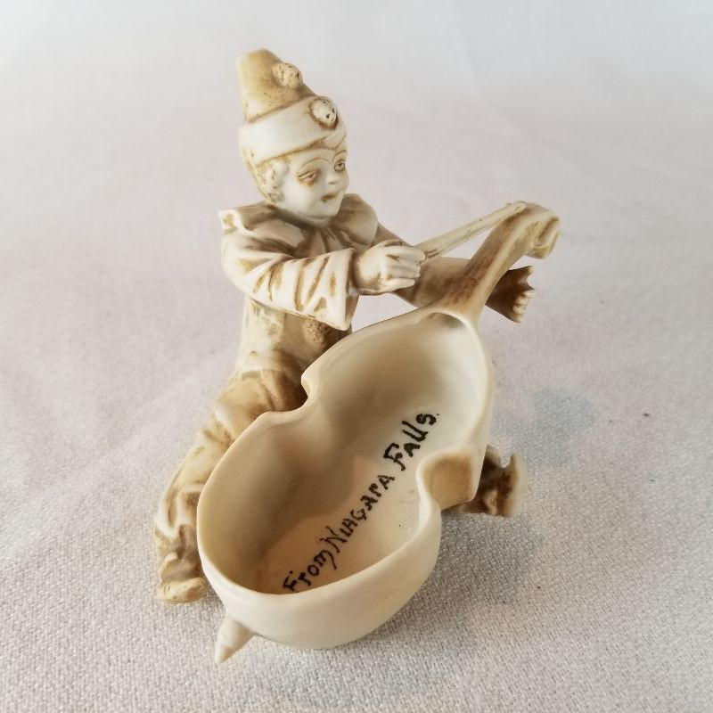 Excellent Early Niagara Falls Souvenir. Porcelain with brown glazing - satin finish. This Clown Cello player has all his fingers and toes, in very good condition, Clown's hat mimics those of entertainers of the early French circus. Some markings on back which we can't decipher.
