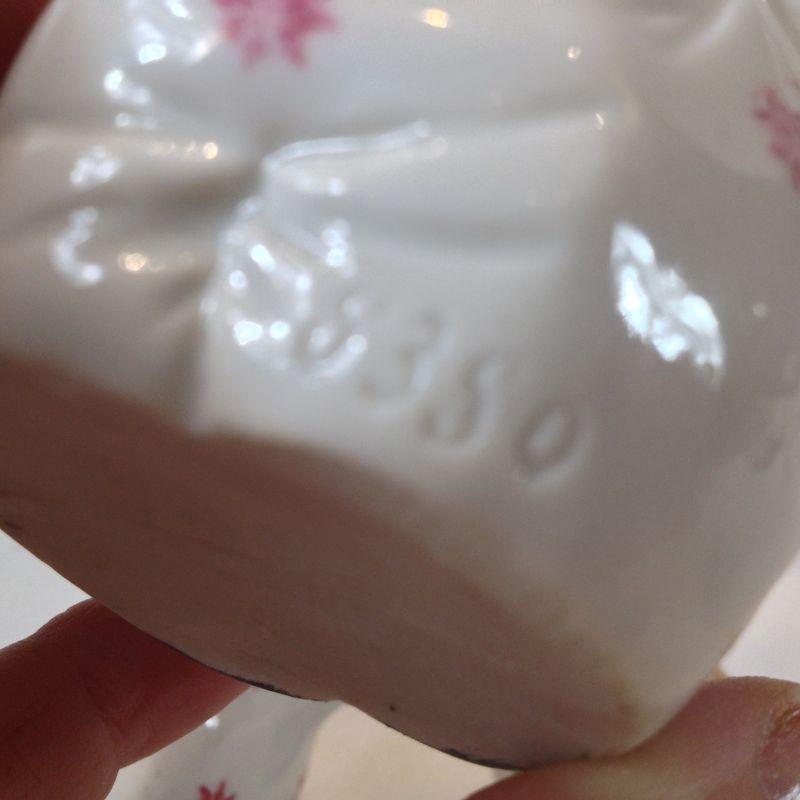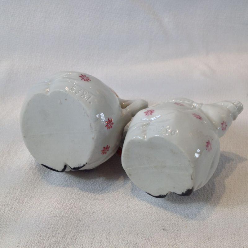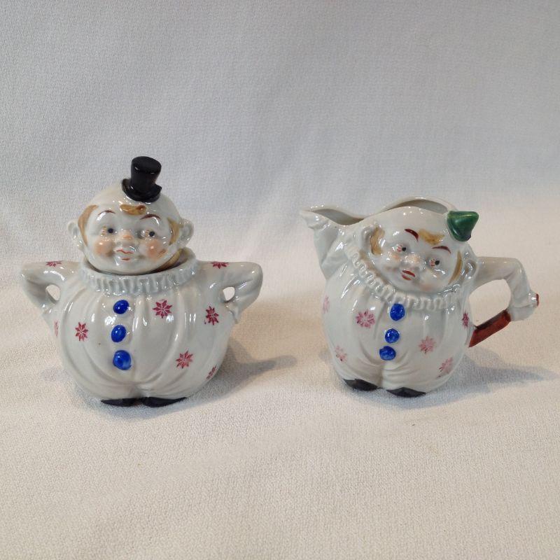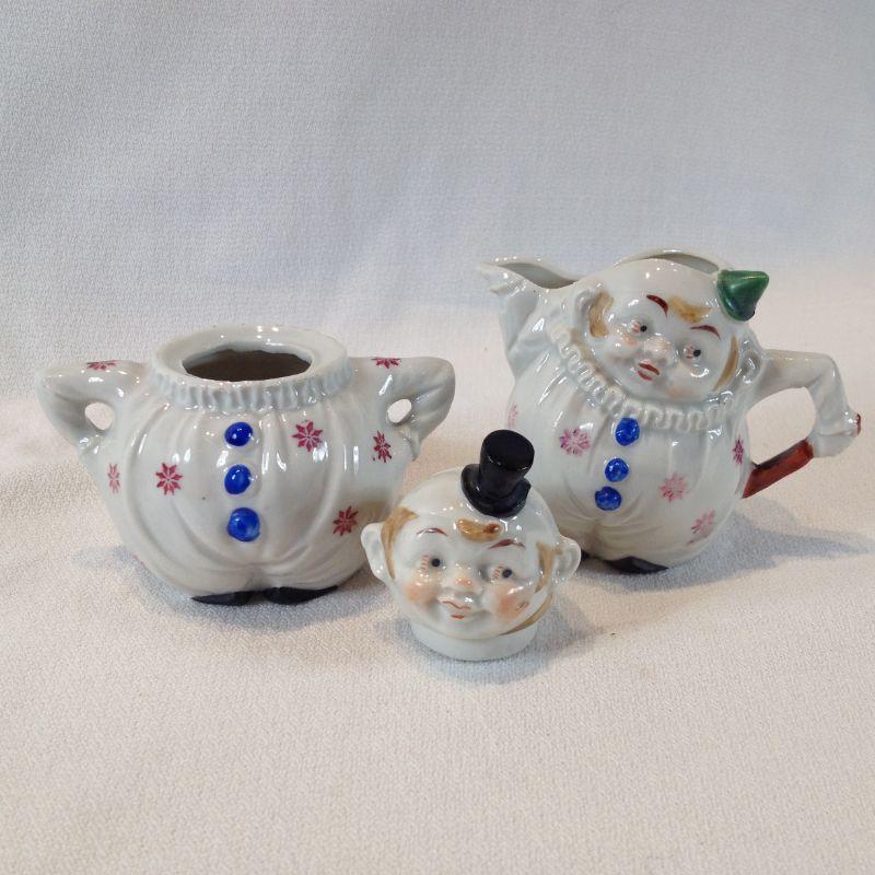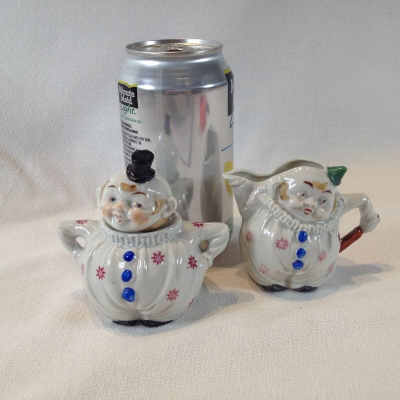 This is a miniature sugar and creamer set in a clown motif. Marked with indented number 8387 on pitcher and number 8350 on creamer, no other maker's marks. In very good condition. Would be fun for a child's tea party. Or perfect for vintage porcelain display.