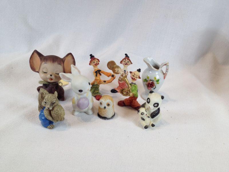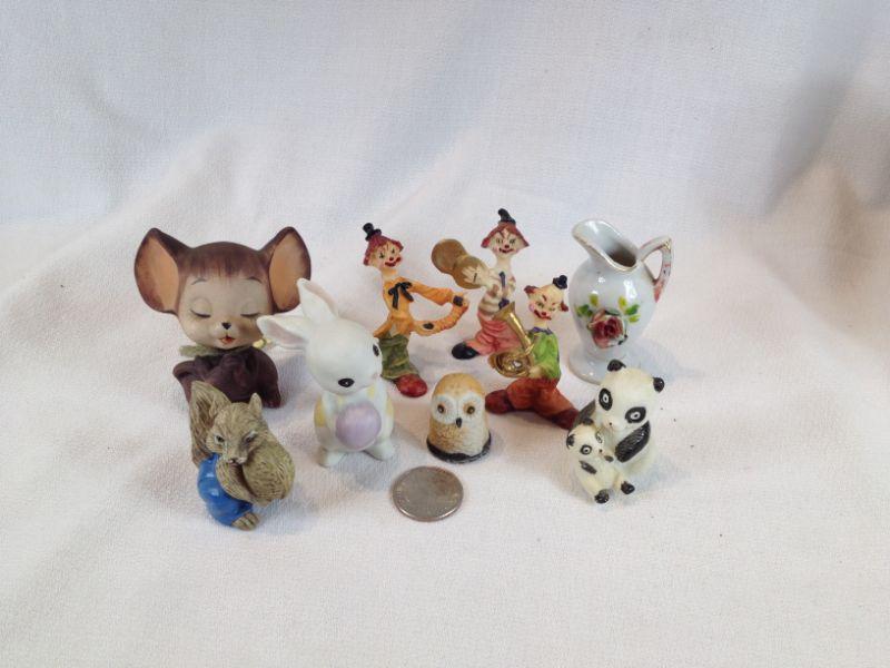 This is a large grouping of 9 adorable items from a miniature display case. Most are china except for the 3 clowns which are resin. All are in very good condition.