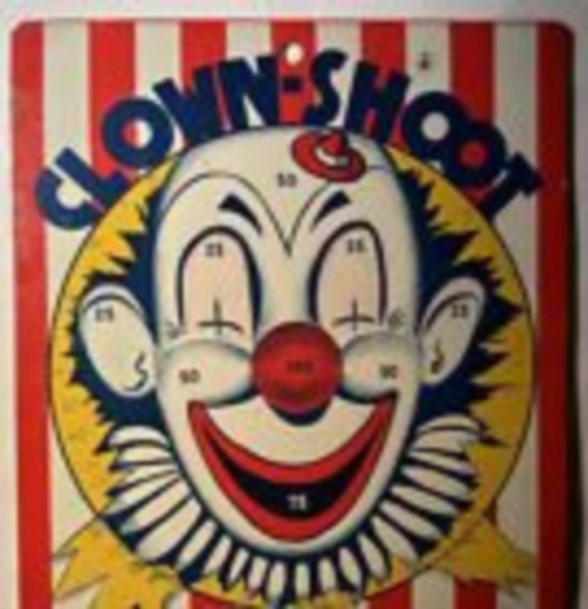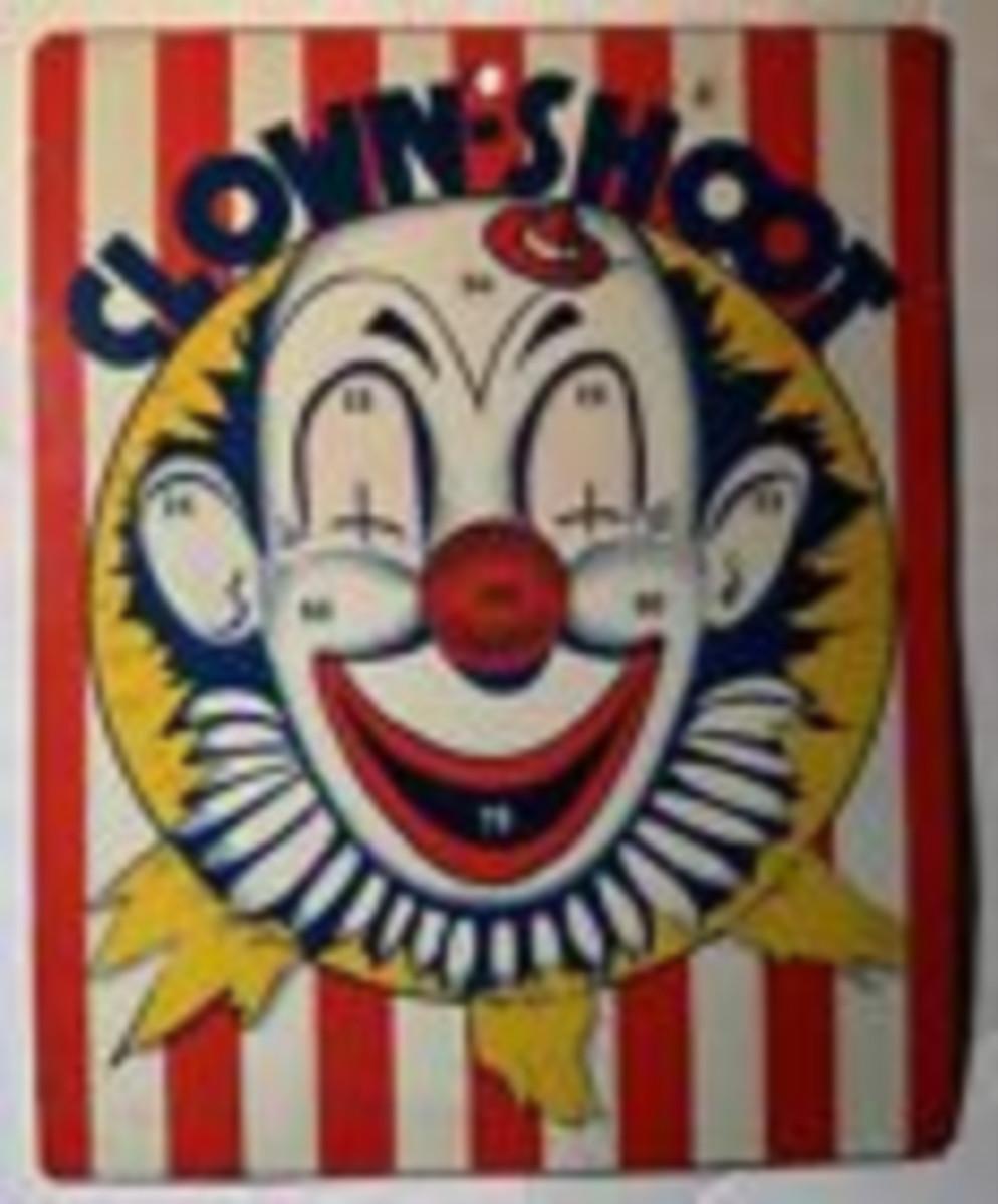 Great graphics on this double-sided CLOWN-SHOOT magnetic dart board...BASEBALL on the reverse...15 x 12"..Tin litho..Slight oxidation patch on one side..Light overall age and use wear...Circa 1950 from the bar-Zim Toy Mfg Company of New York.