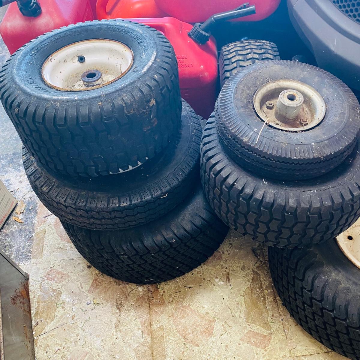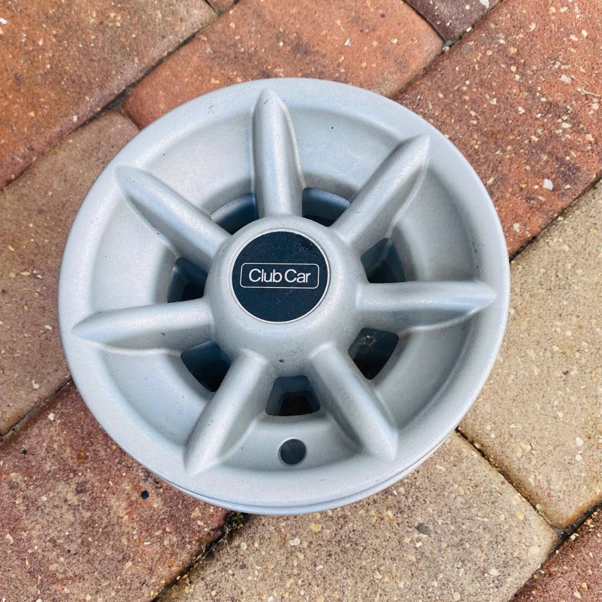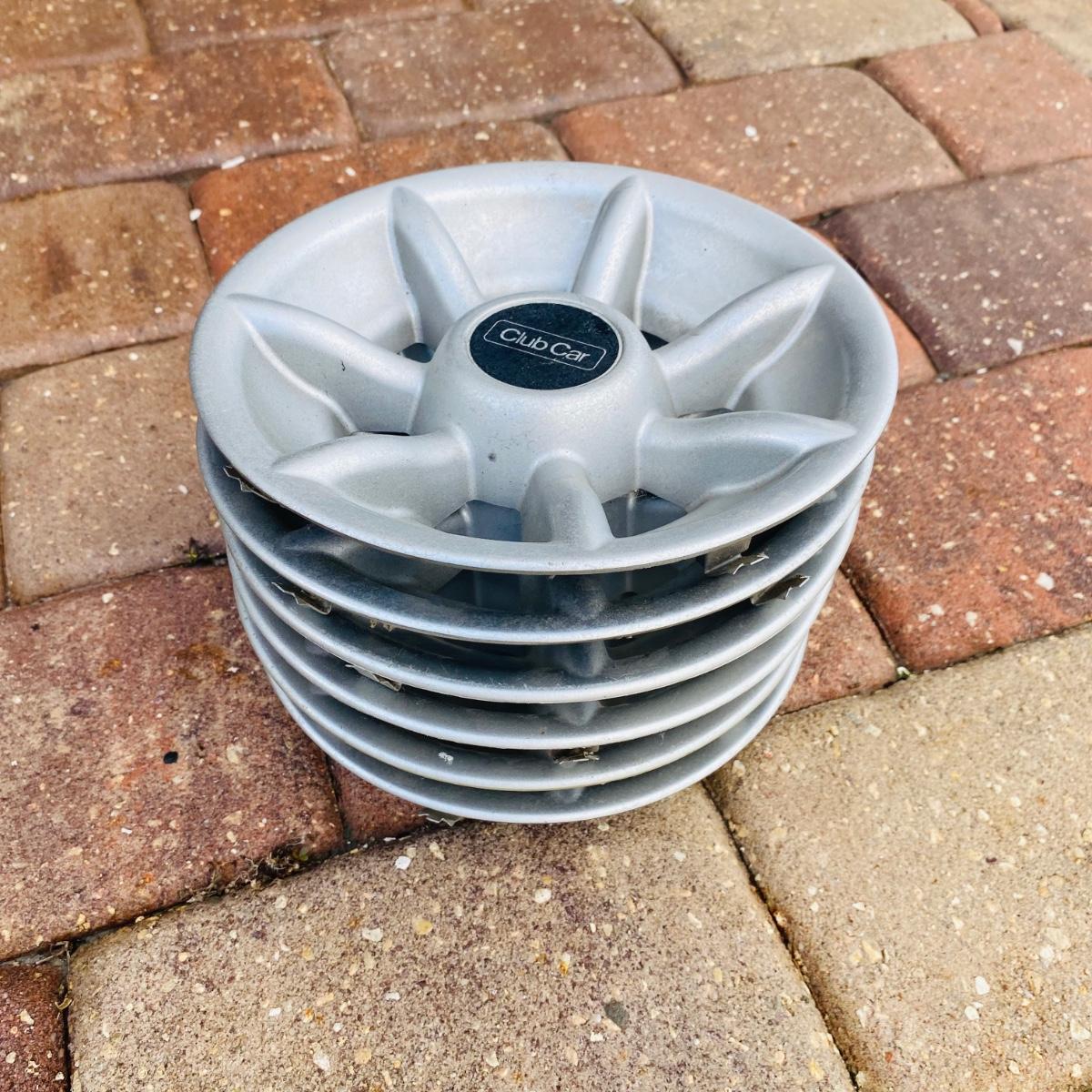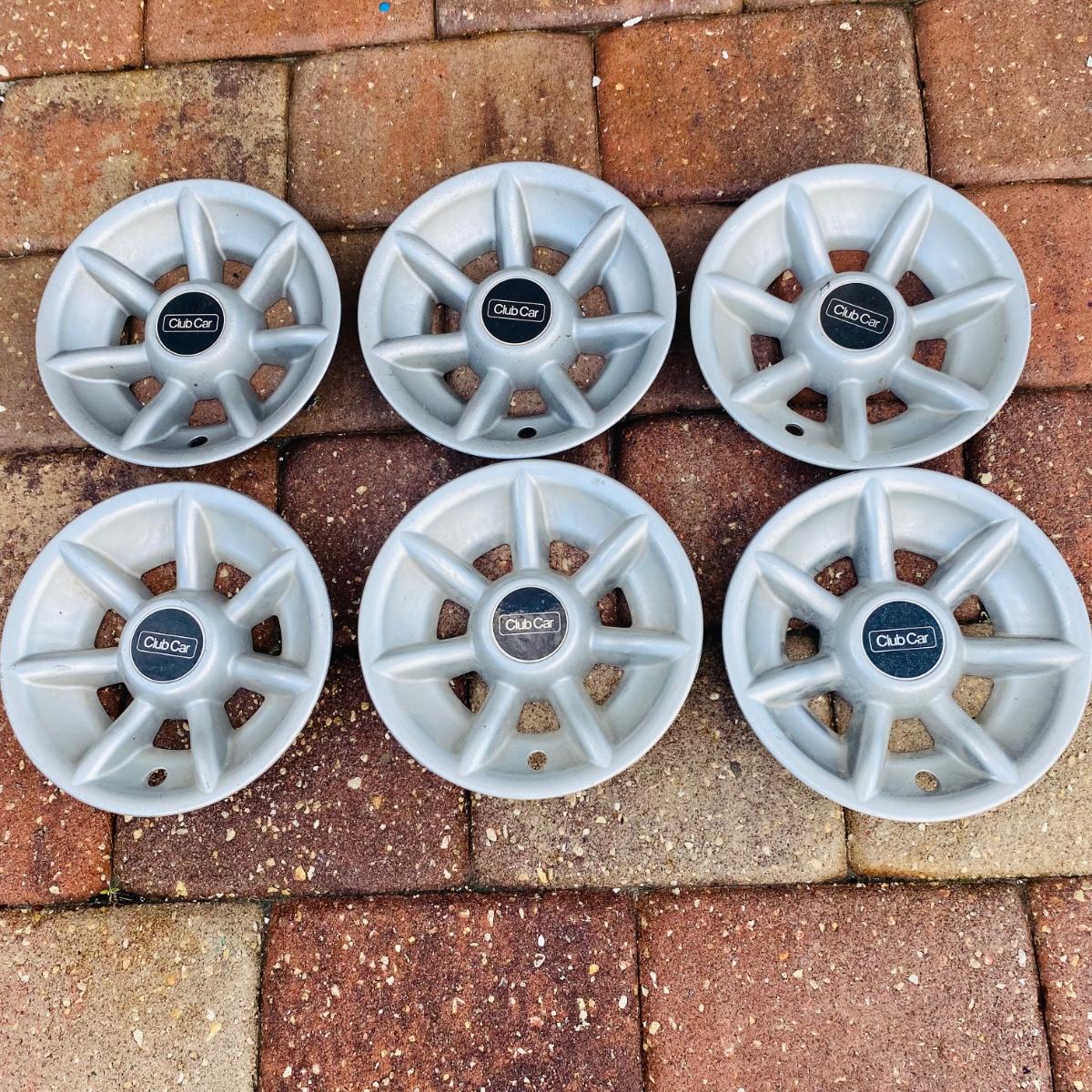 Six hubcaps for Club Car Golf Cart.. Measures 8.25”D. Also includes six various sized used tires.