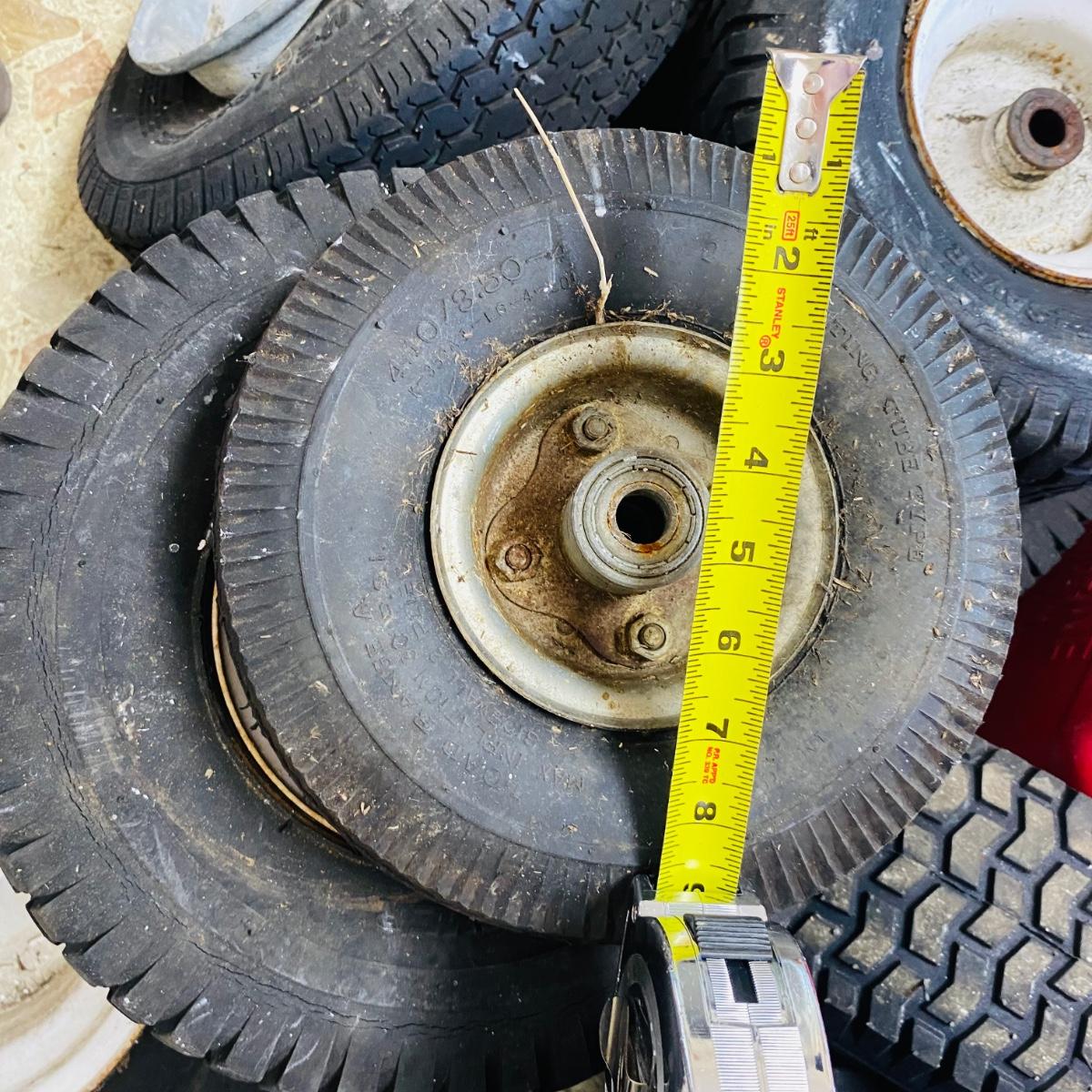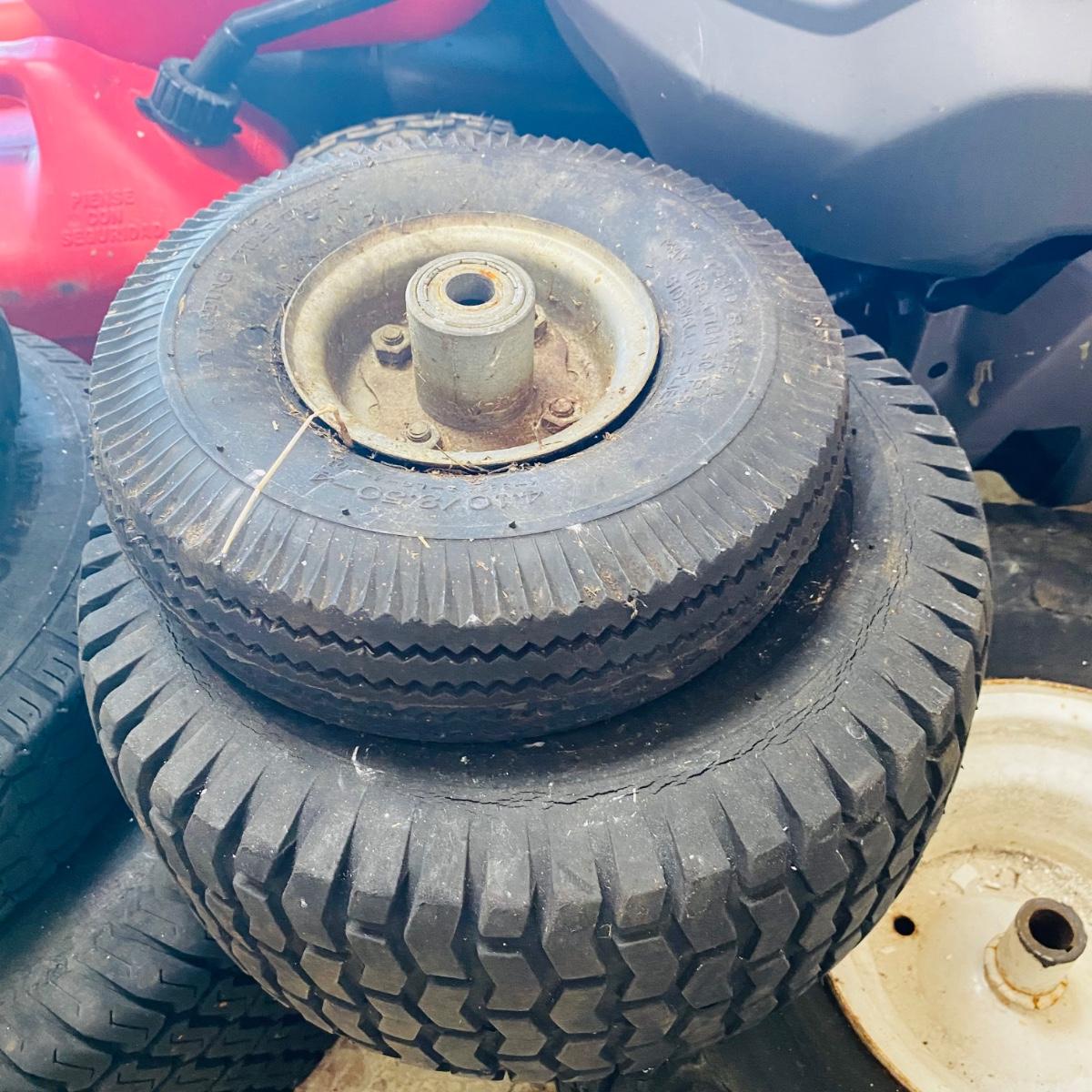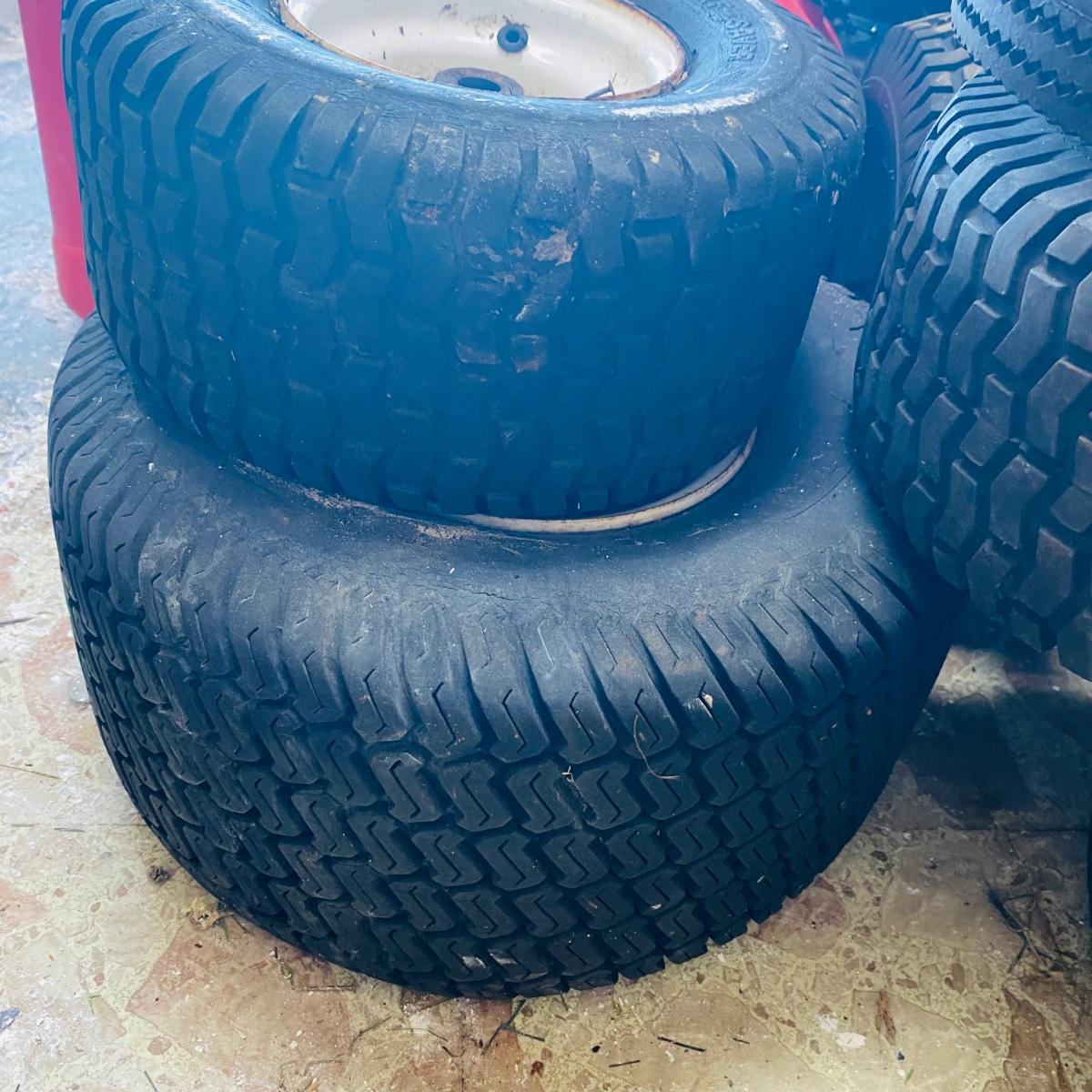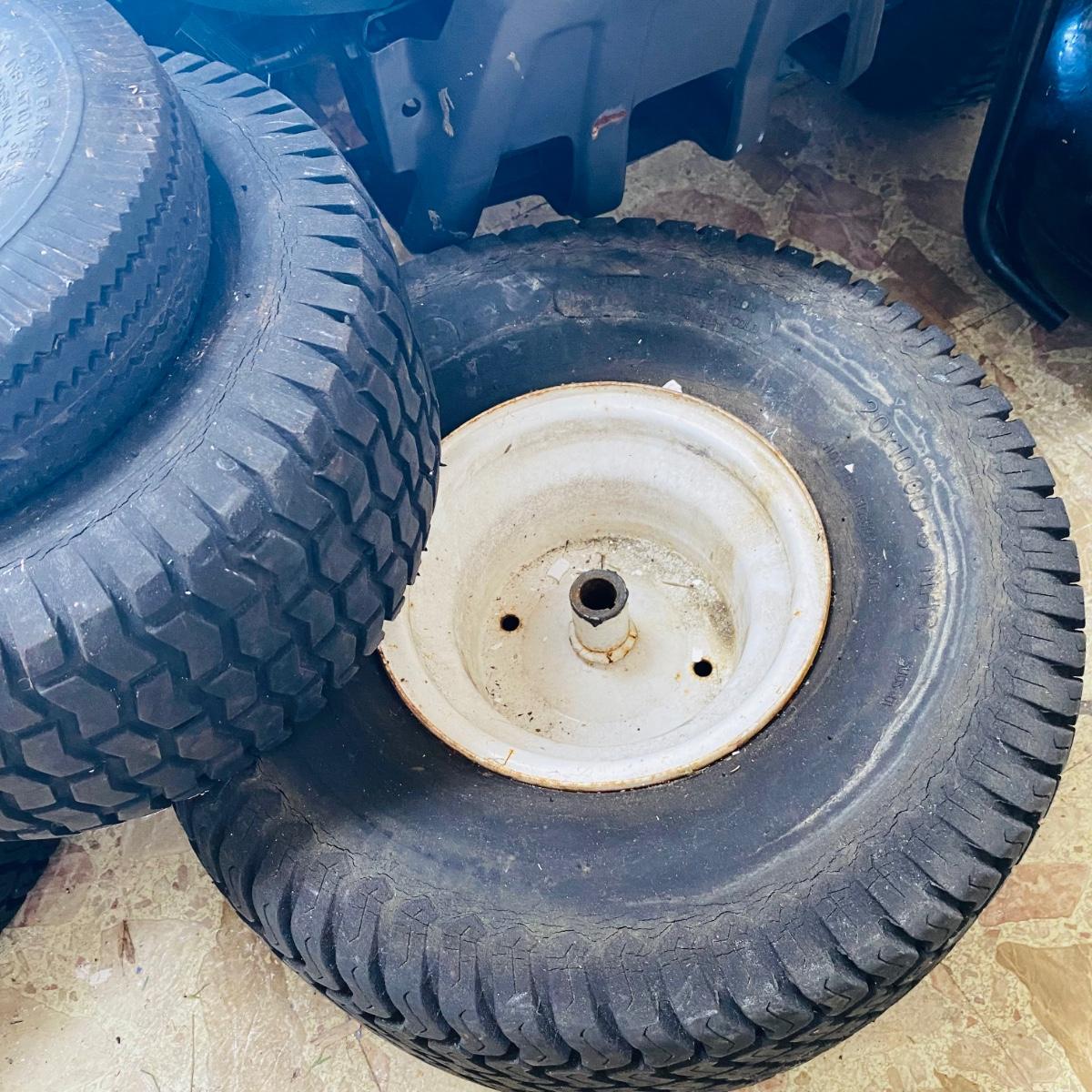 Six hubcaps for Club Car Golf Cart.. Measures 8.25”D. Also includes six various sized used tires.
