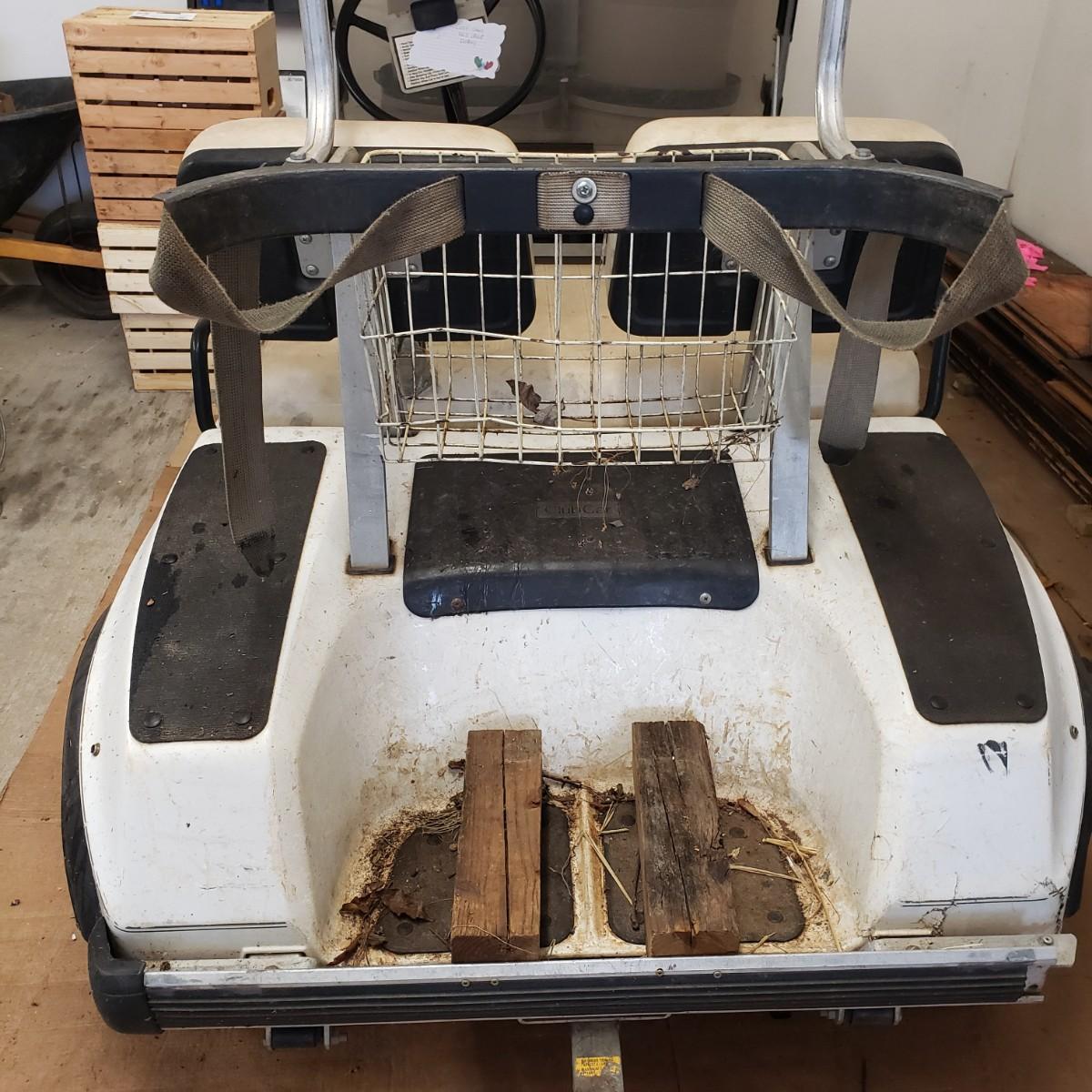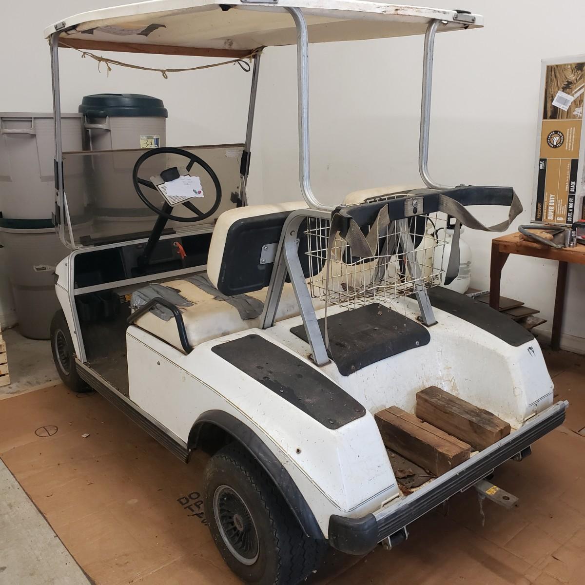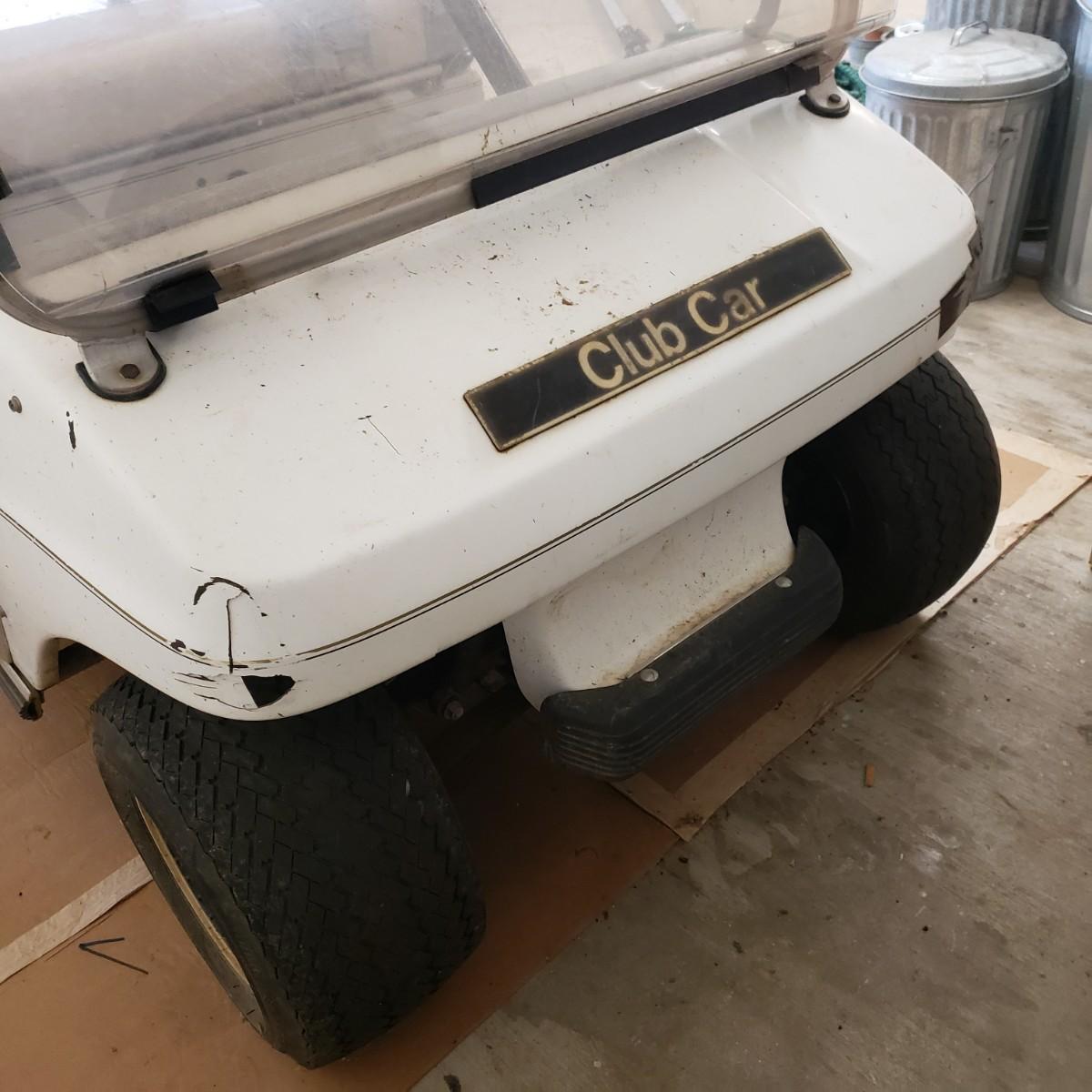 This is a Club Cart golf cart. The cart has room for two people and clubs or tools in the back. The previous owner used it for gardening purposes. The seat is duck taped. The cart does not start, as appears to need a battery per client. It is a gas operated cart. We could not find a serial/VIN number on the cart.