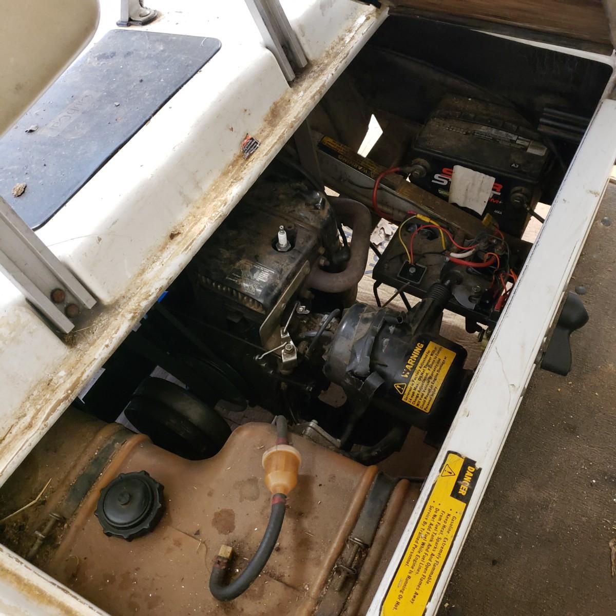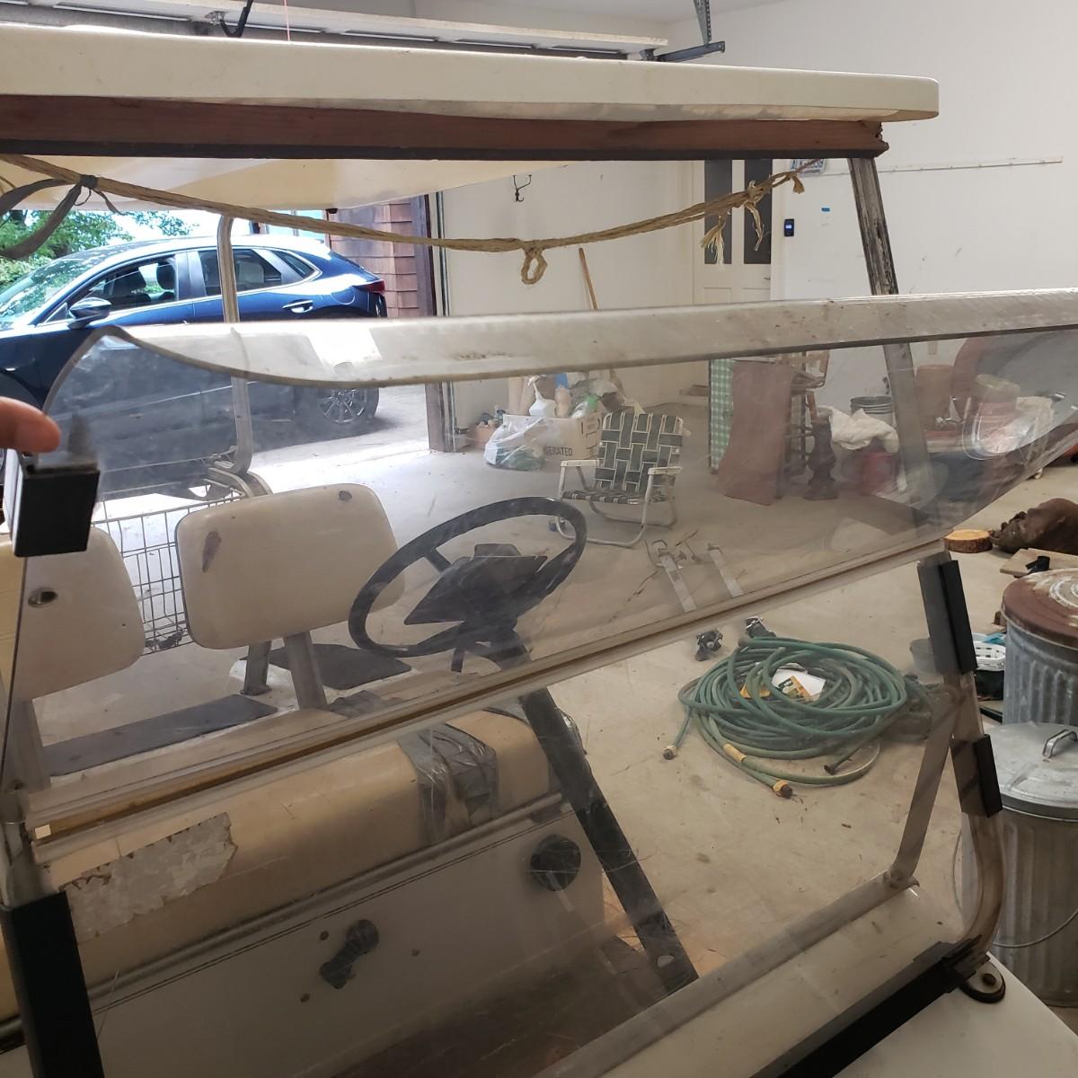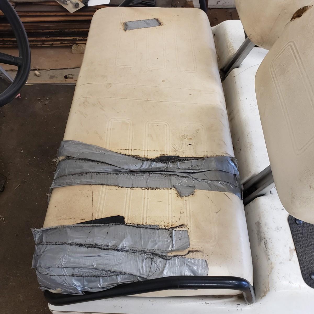 This is a Club Cart golf cart. The cart has room for two people and clubs or tools in the back. The previous owner used it for gardening purposes. The seat is duck taped. The cart does not start, as appears to need a battery per client. It is a gas operated cart. We could not find a serial/VIN number on the cart.