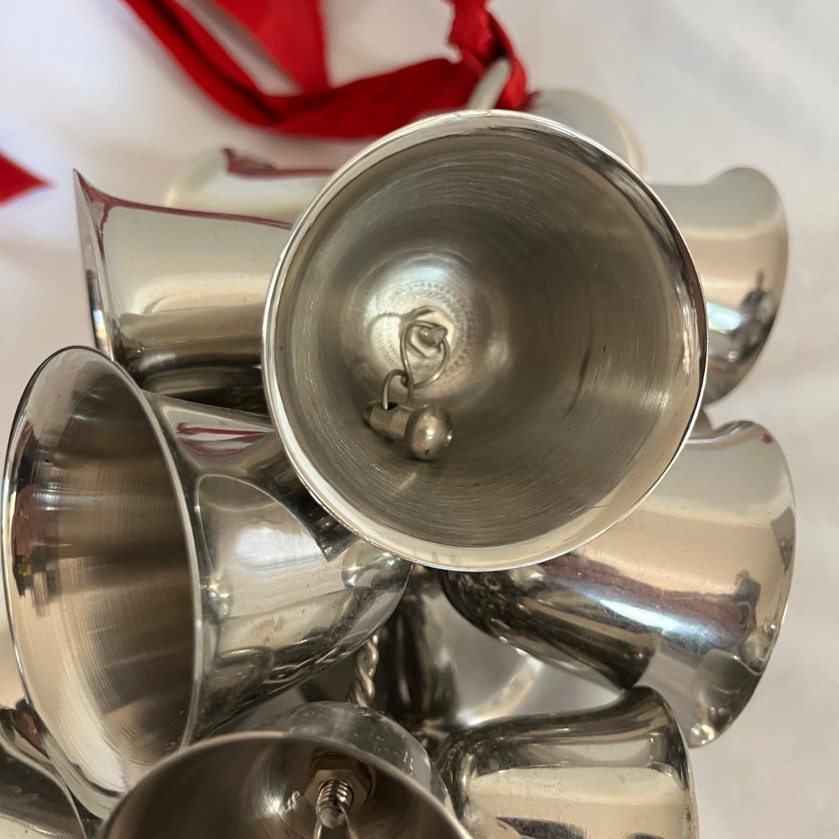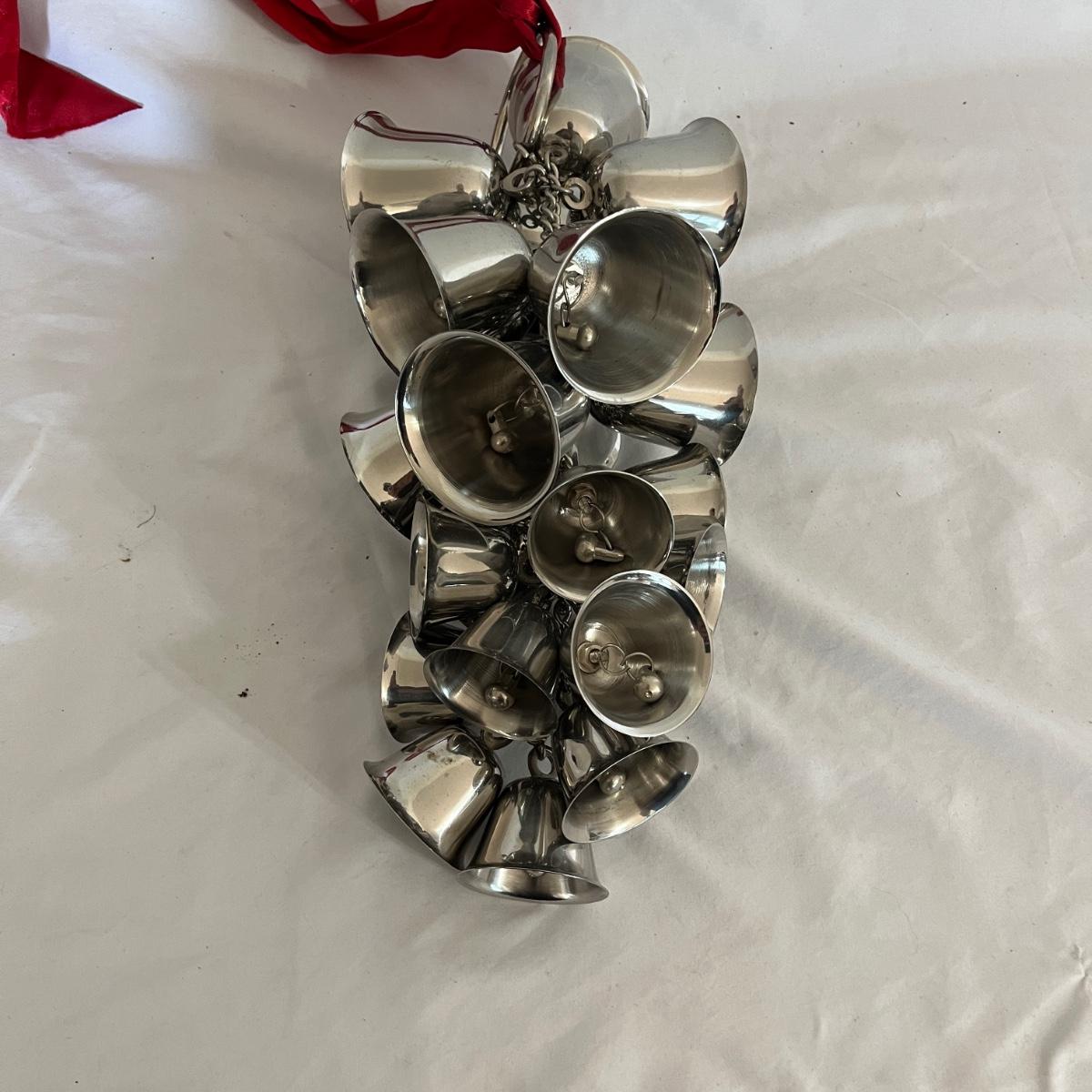 Lot includes a cluster of over 20 metal bells. Cluster measures 6”D x 14”H not counting red ribbon.