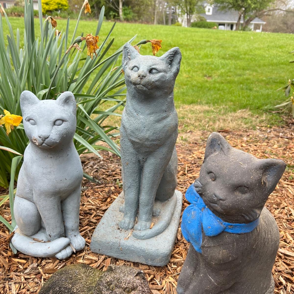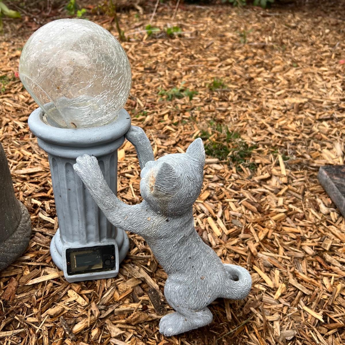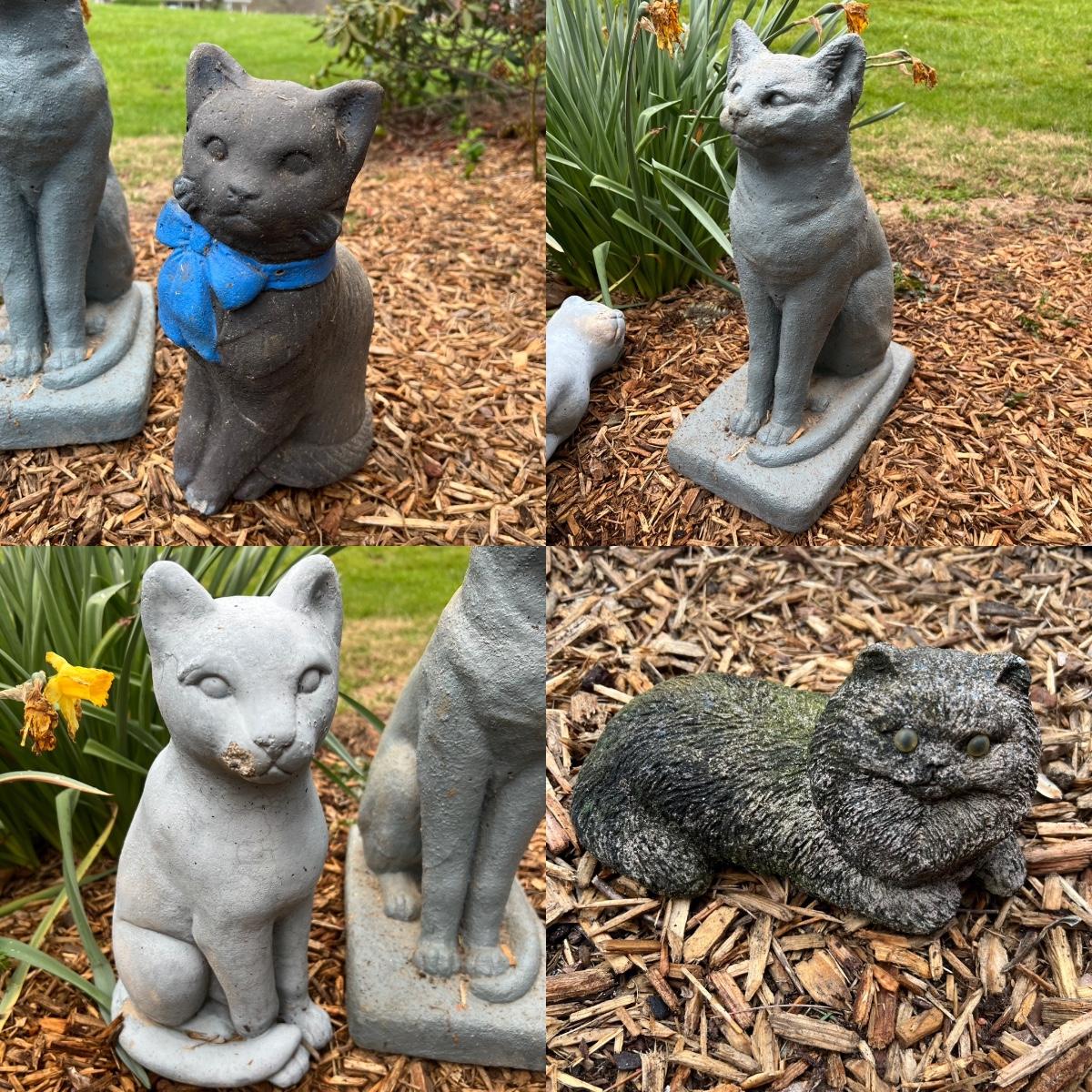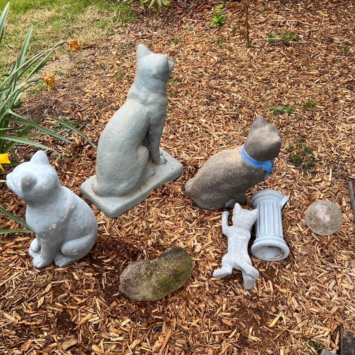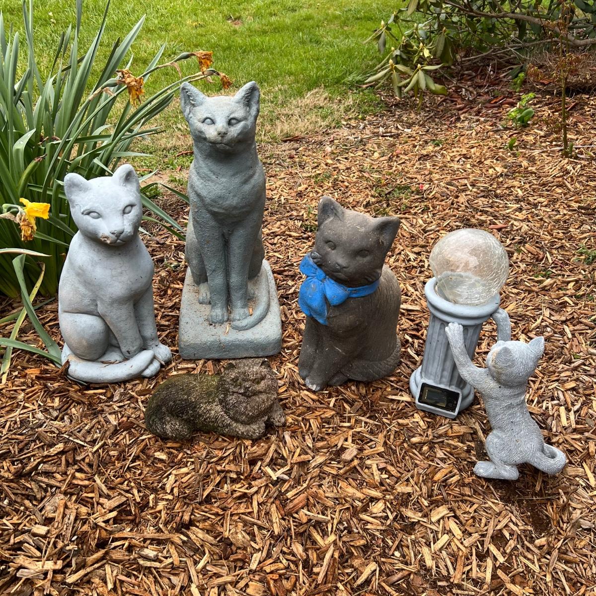 Five cat statues includes four that are cement and the fifth one being plastic. The plastic cat stands against a plastic pillar with a glass globe top; there is a solar panel which appears to no longer work. The four cement statues are heavy. There are a few chips, etc shown in images.