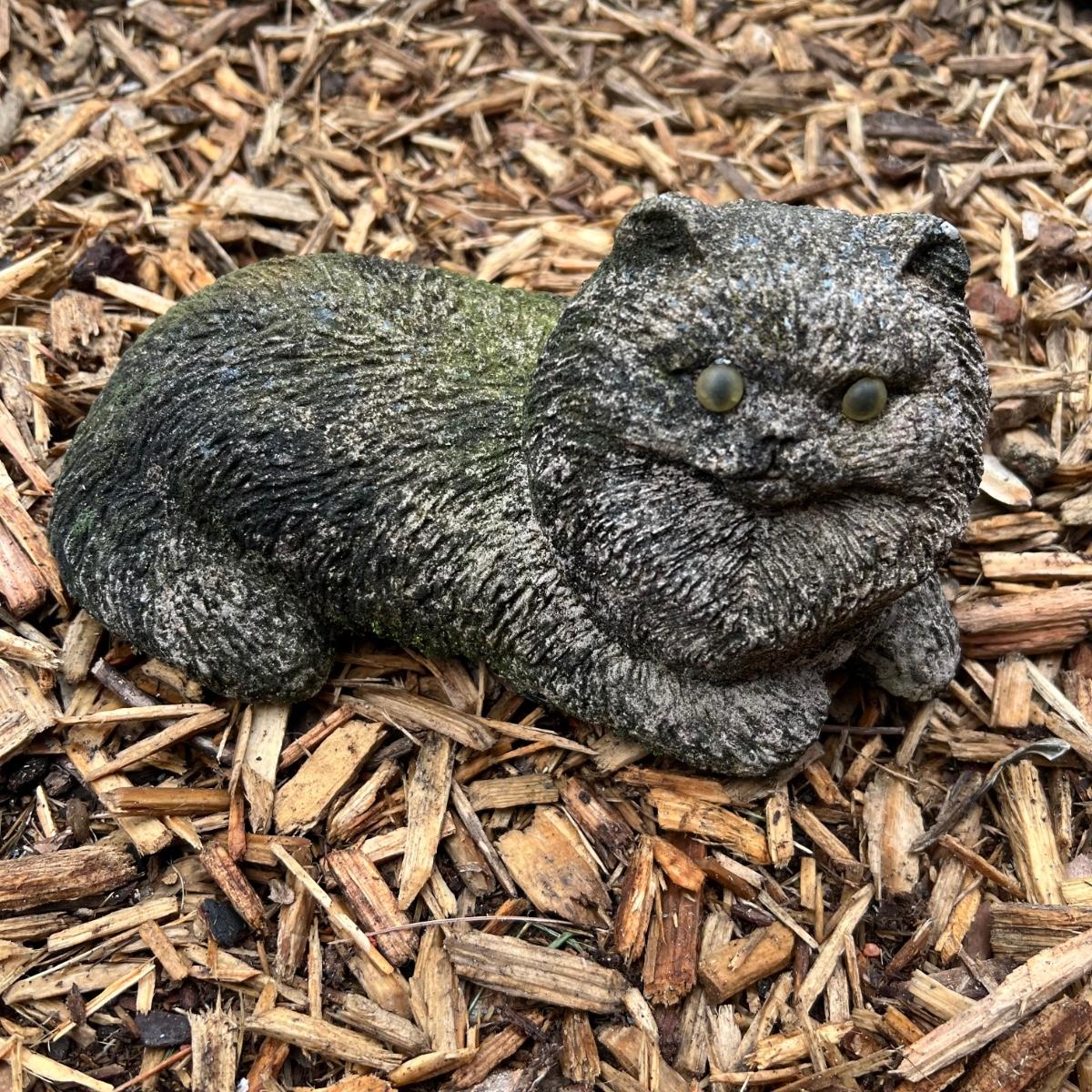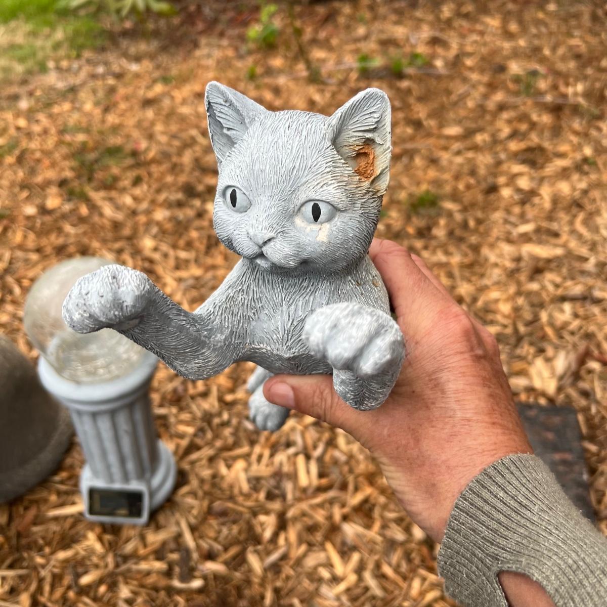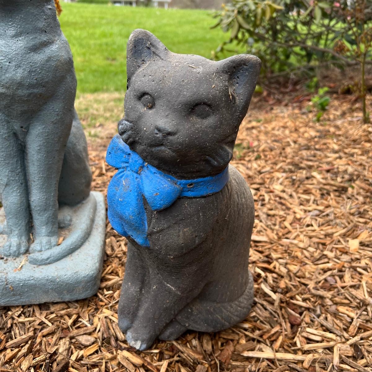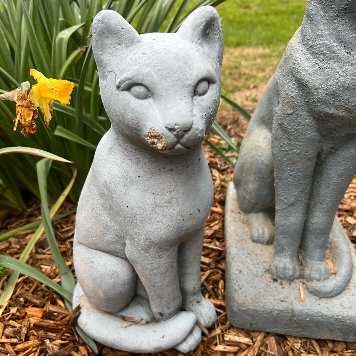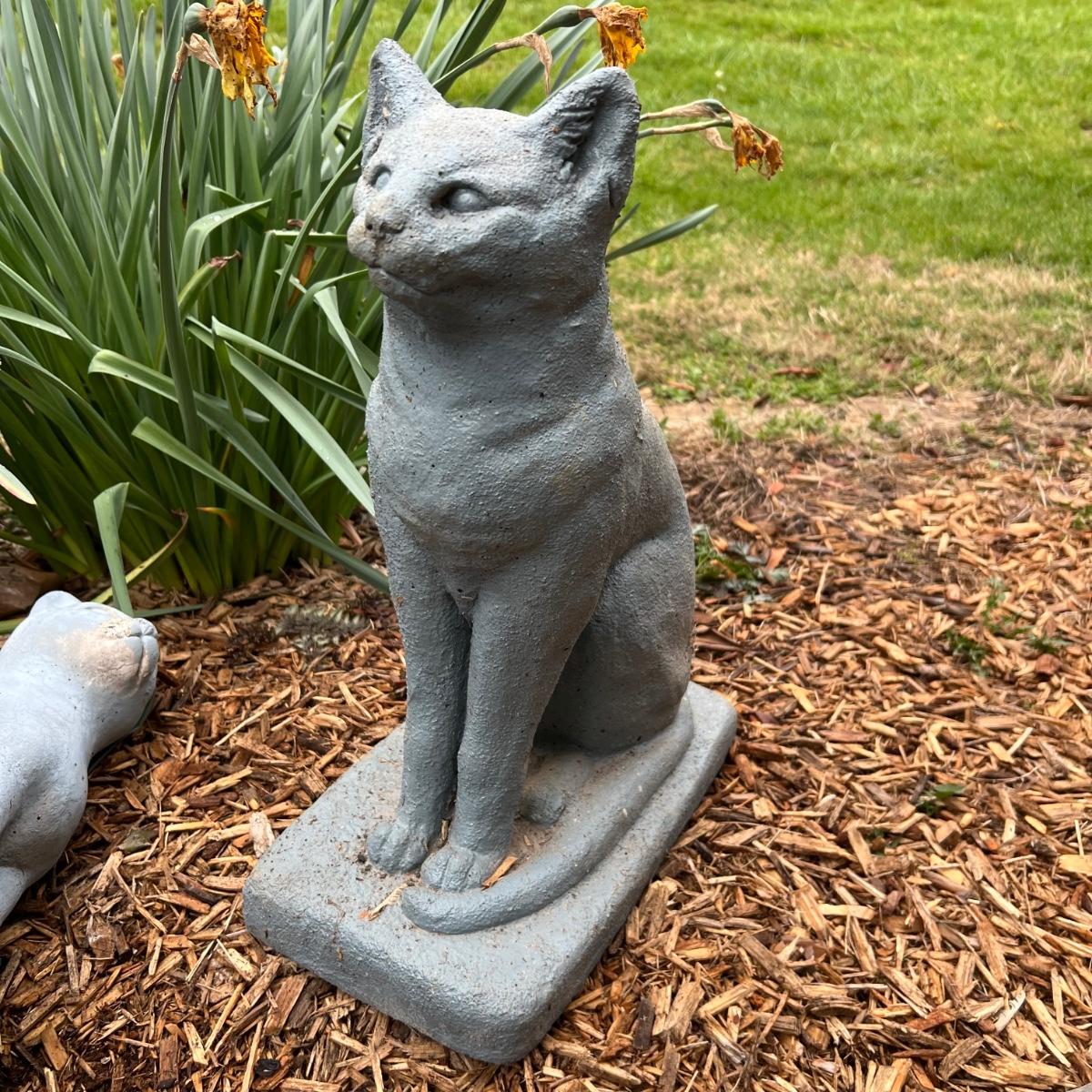 Five cat statues includes four that are cement and the fifth one being plastic. The plastic cat stands against a plastic pillar with a glass globe top; there is a solar panel which appears to no longer work. The four cement statues are heavy. There are a few chips, etc shown in images.