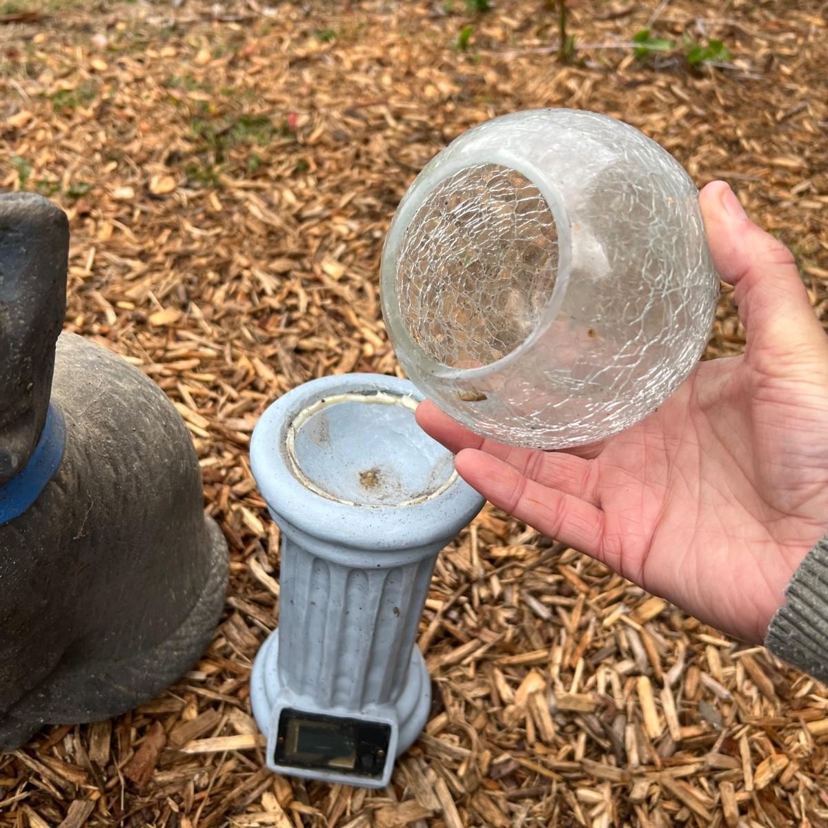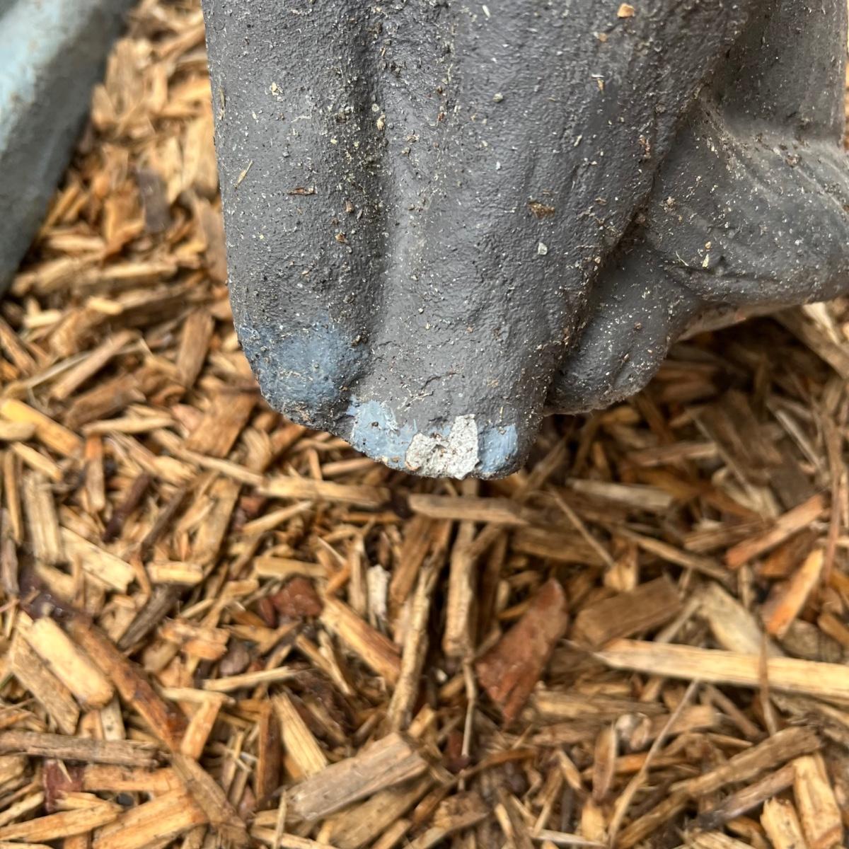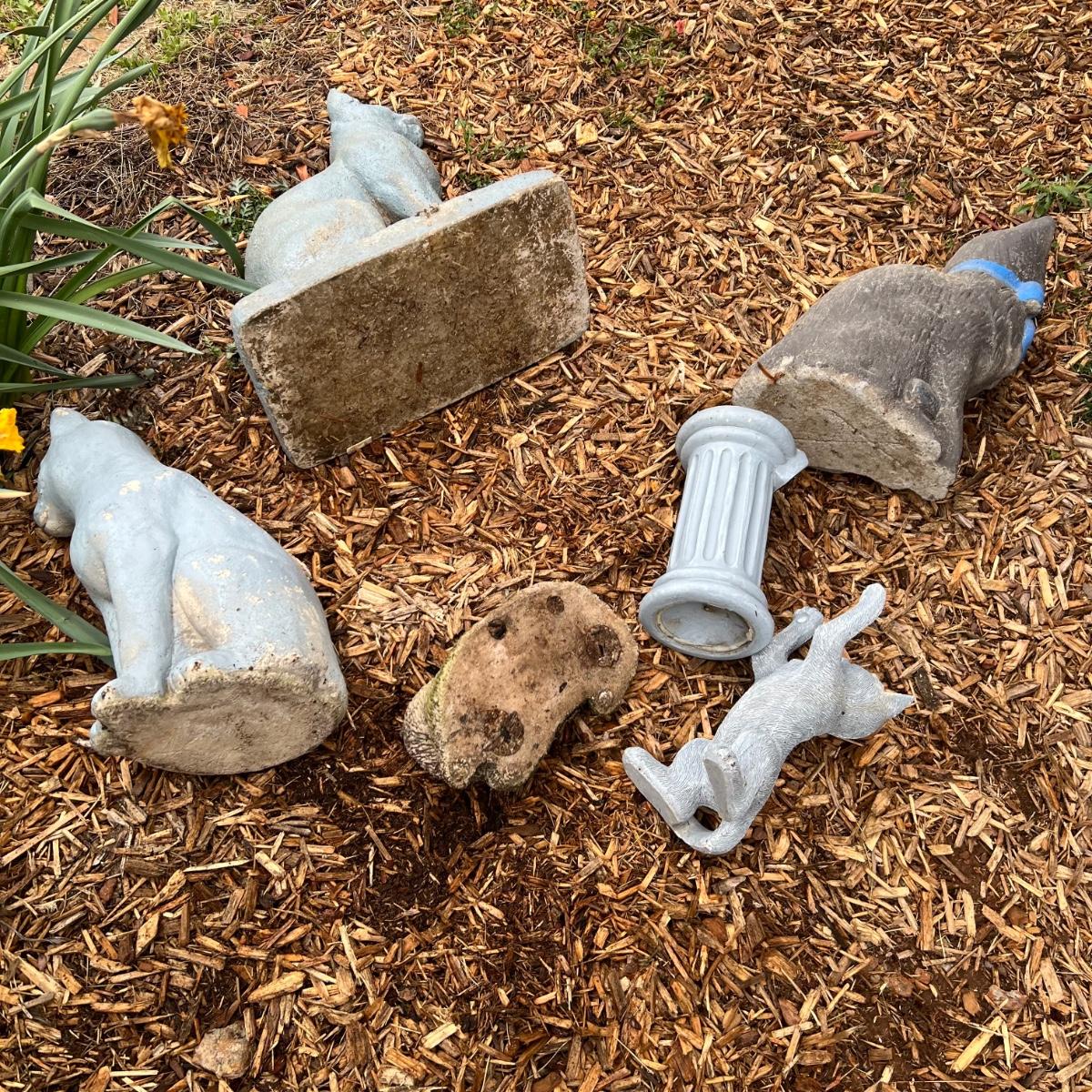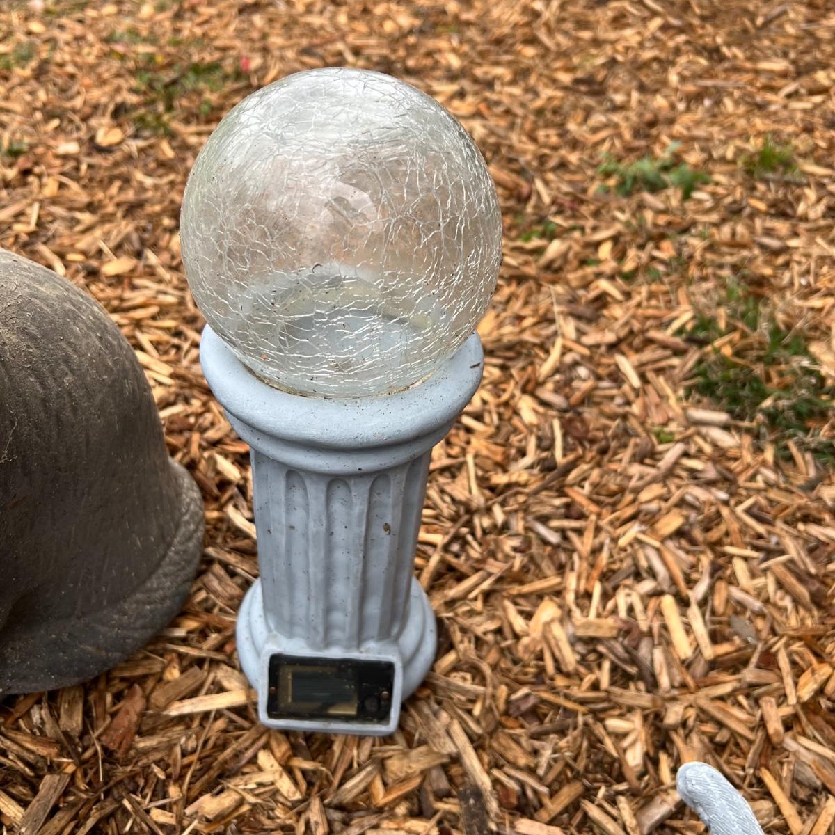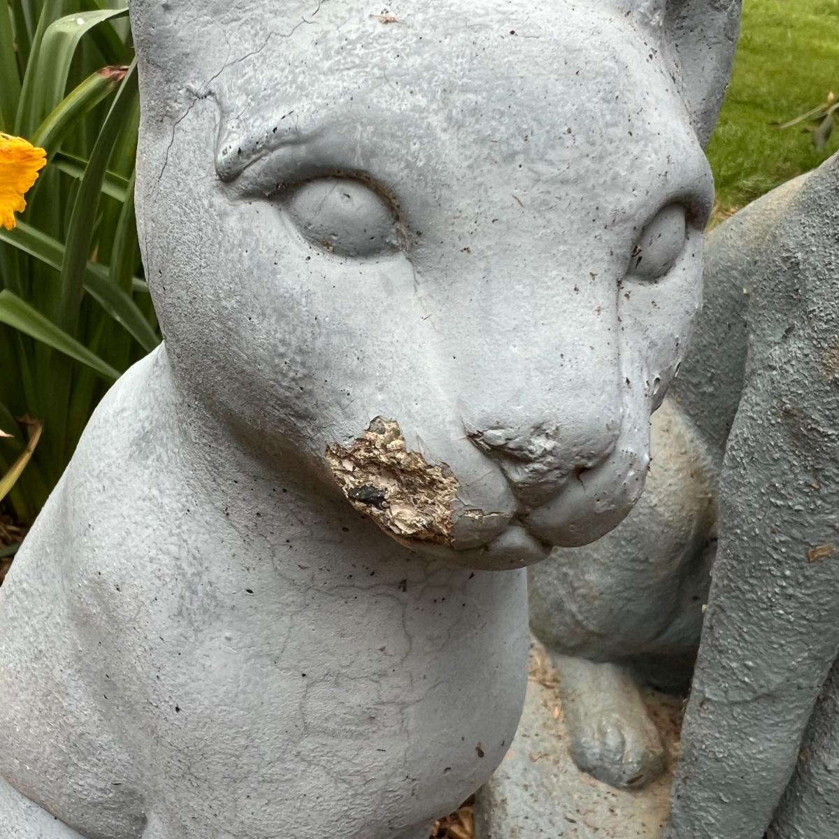 Five cat statues includes four that are cement and the fifth one being plastic. The plastic cat stands against a plastic pillar with a glass globe top; there is a solar panel which appears to no longer work. The four cement statues are heavy. There are a few chips, etc shown in images.