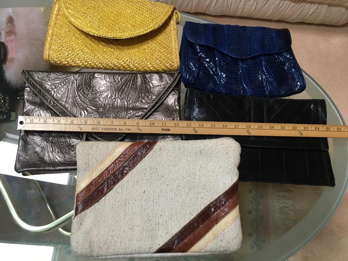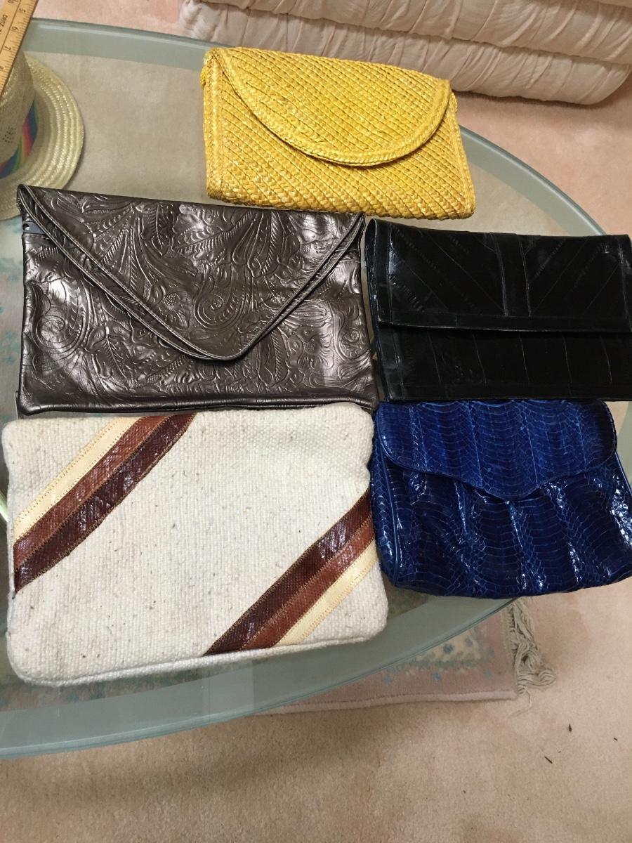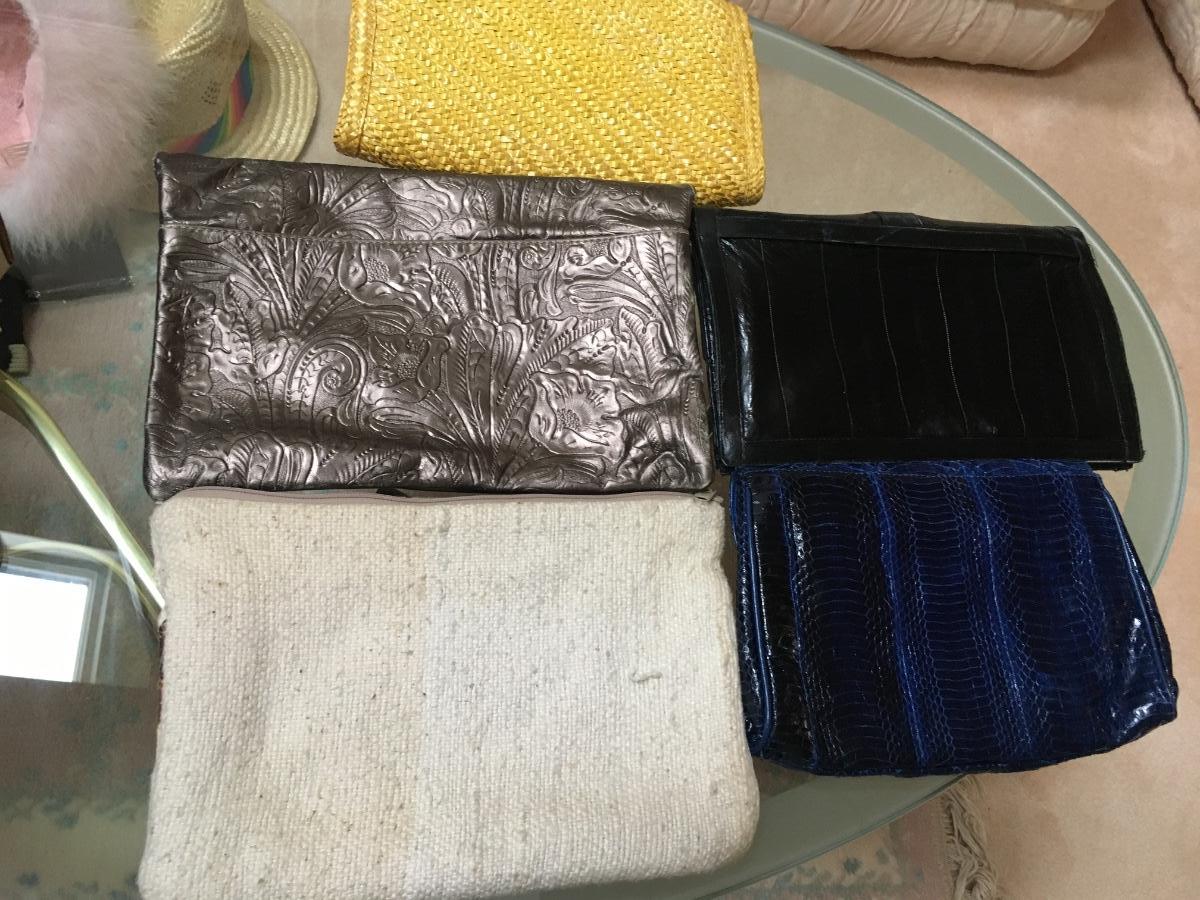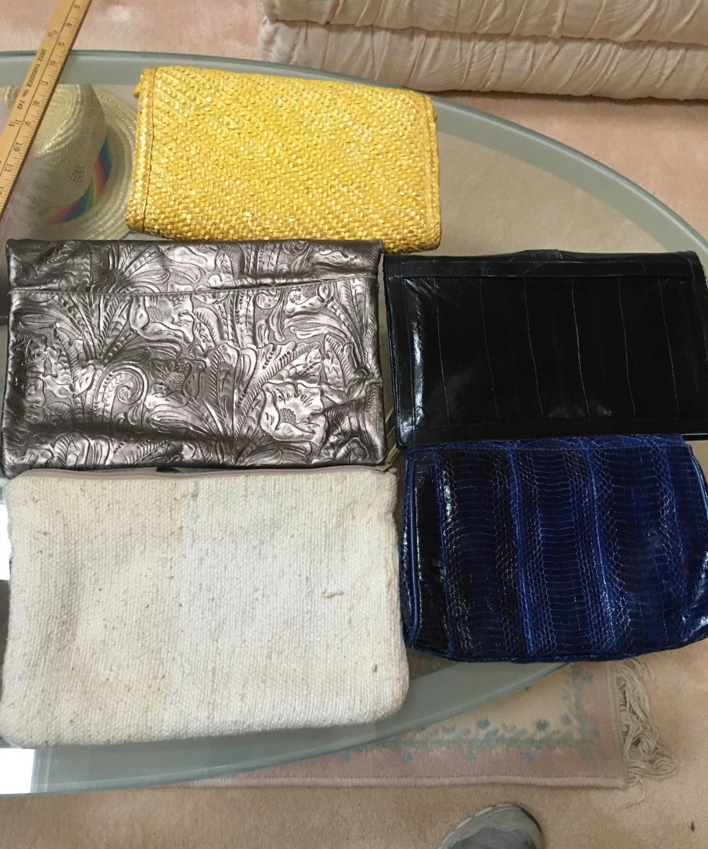 Group of 5 assorted clutches: straw, leather, cloth. Label in only blue one. Overall very good condition except some wear on cloth one.