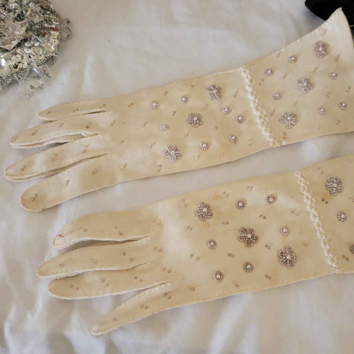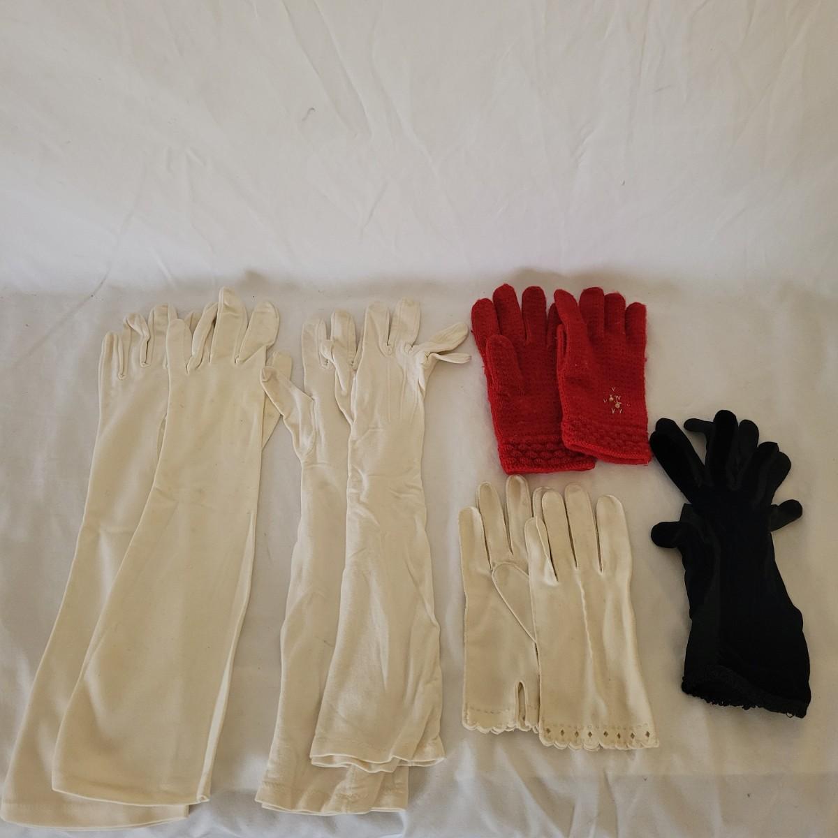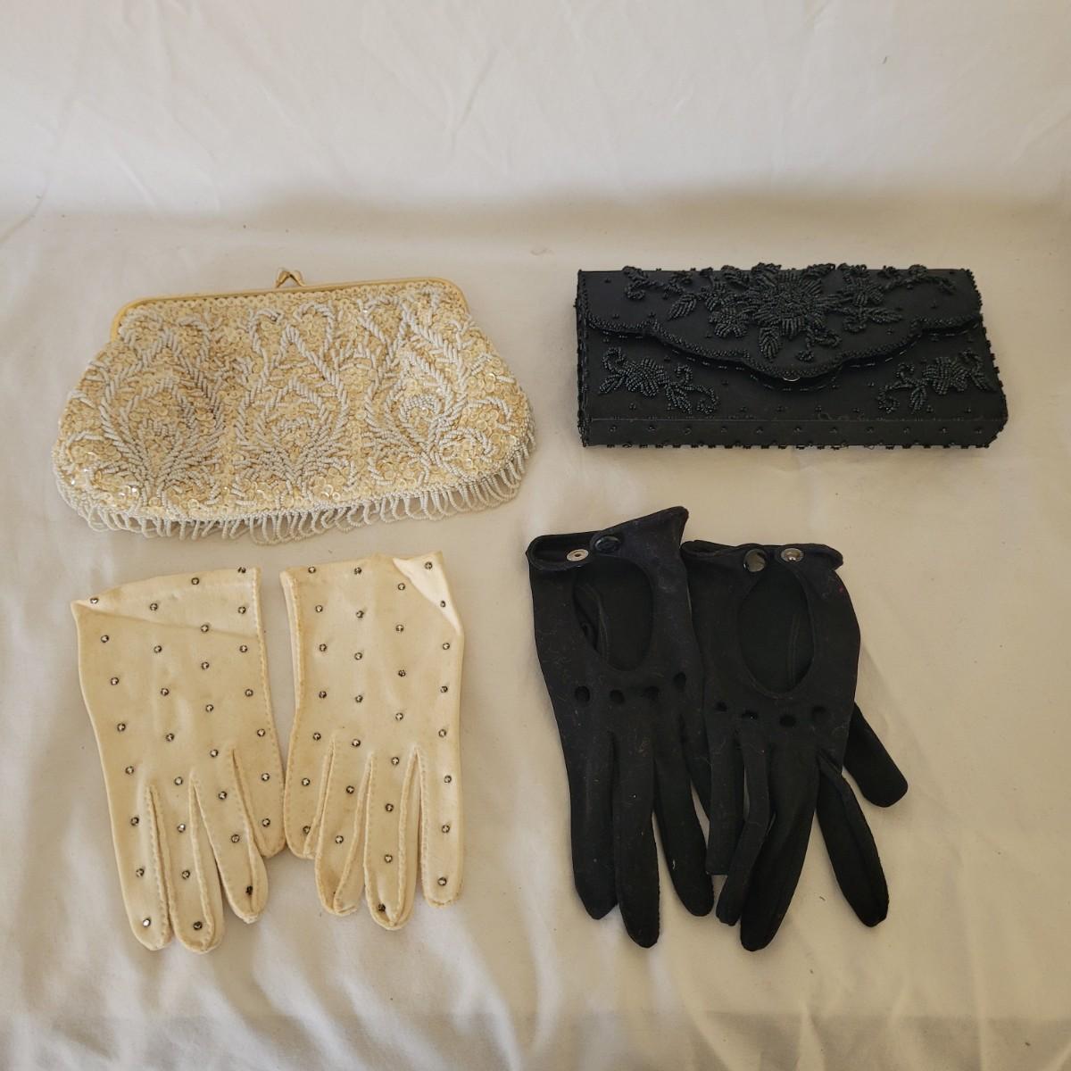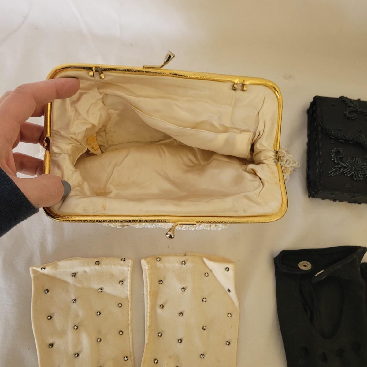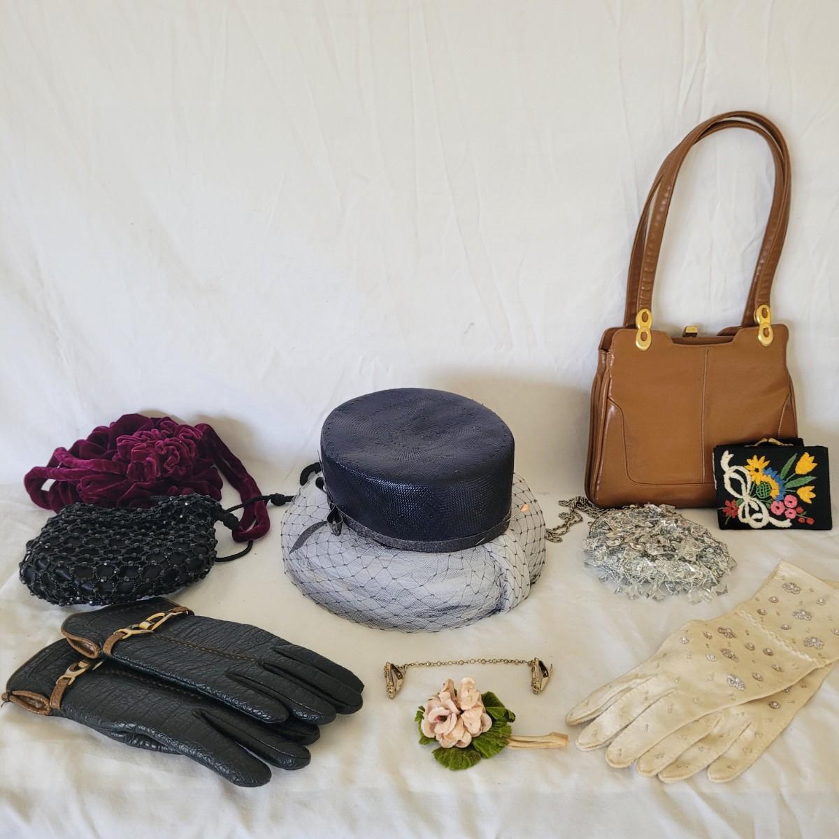 This collection of fashion accessories includes beaded clutches, a small brown faux leather handbag, a variety of fashion gloves and a vintage pillbox style hat. Some gloves have heavier staining (see photos). Brown handbag measures approximately 9” x 7.” Shipping available.