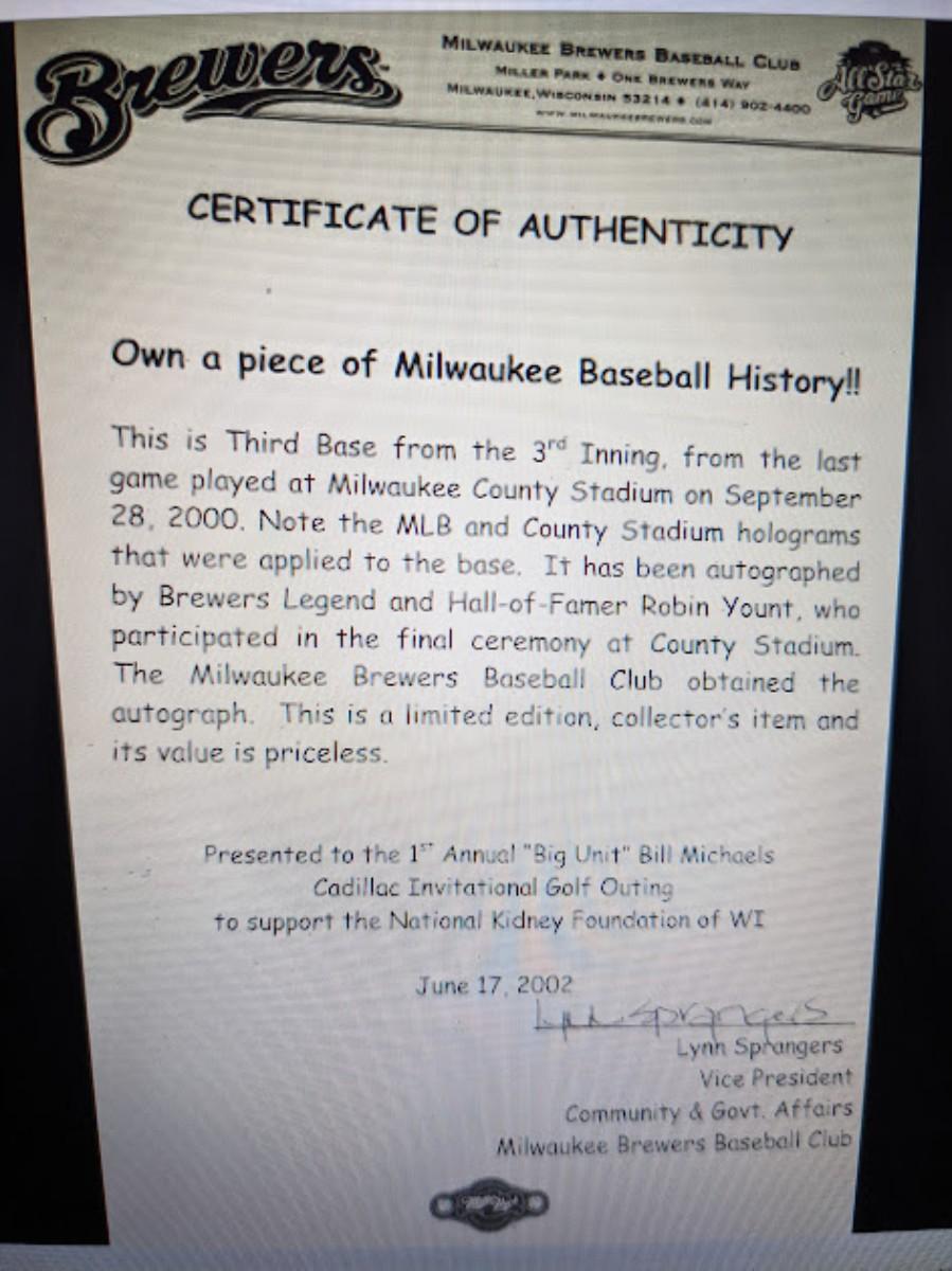 COA Robin Yount Autographed 3rd Base from the Last Game Played MKE County Stadium
