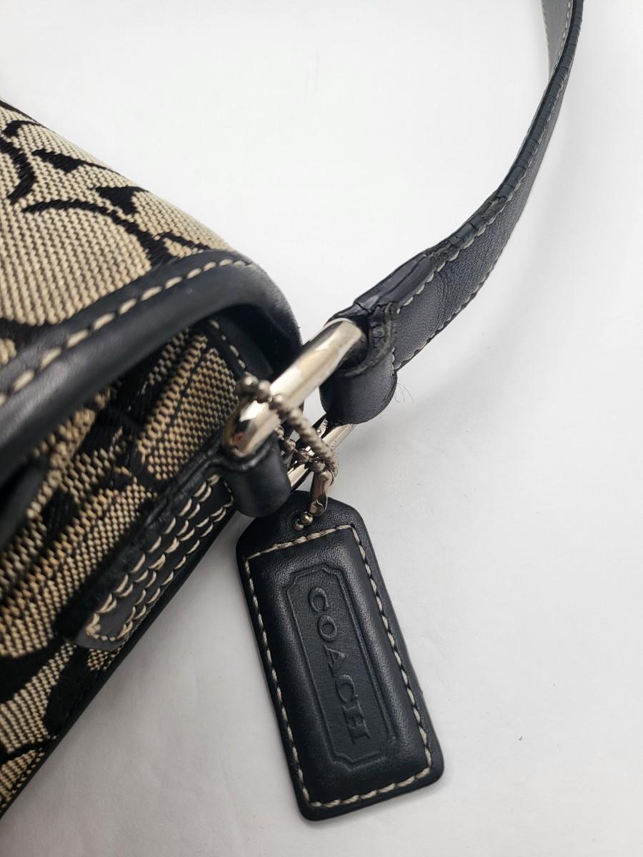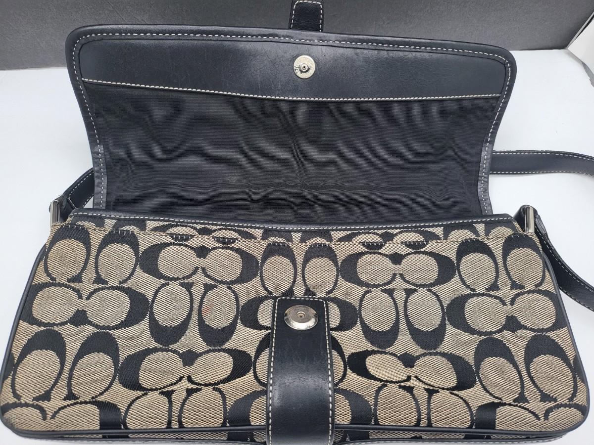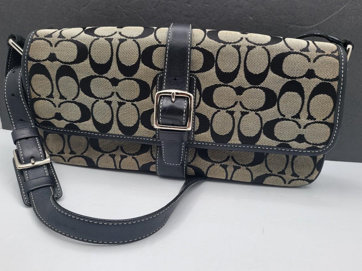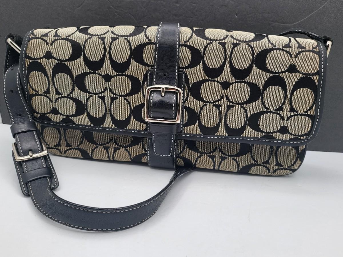 Beige & black signature Coach baguette. Magnetic snap closure, fold over flap with buckle accent. Signature canvas exterior, leather trim, and leather shoulder strap. Measures 11.5" long x 6" tall x 2" deep. Coach hang tag. No. C2K-6040. Good, pre-owned condition.