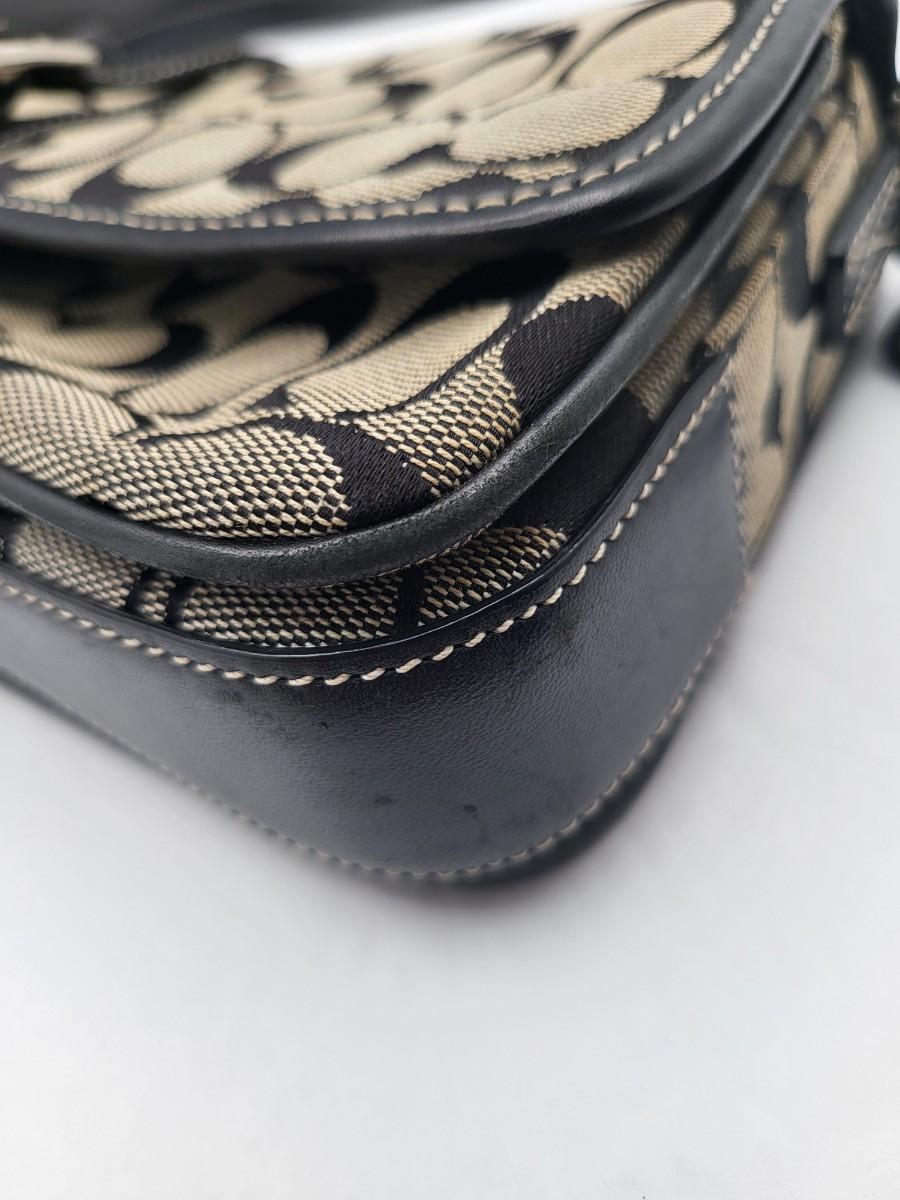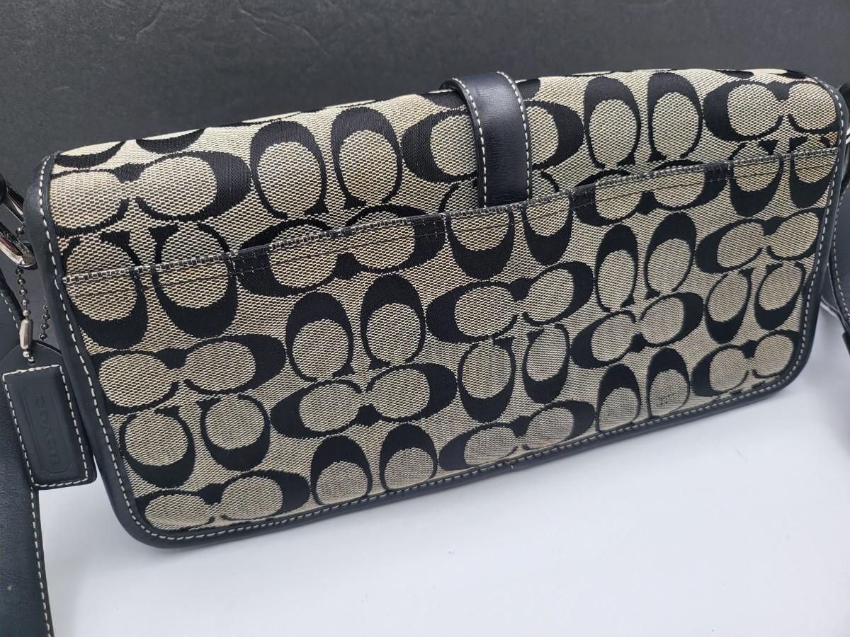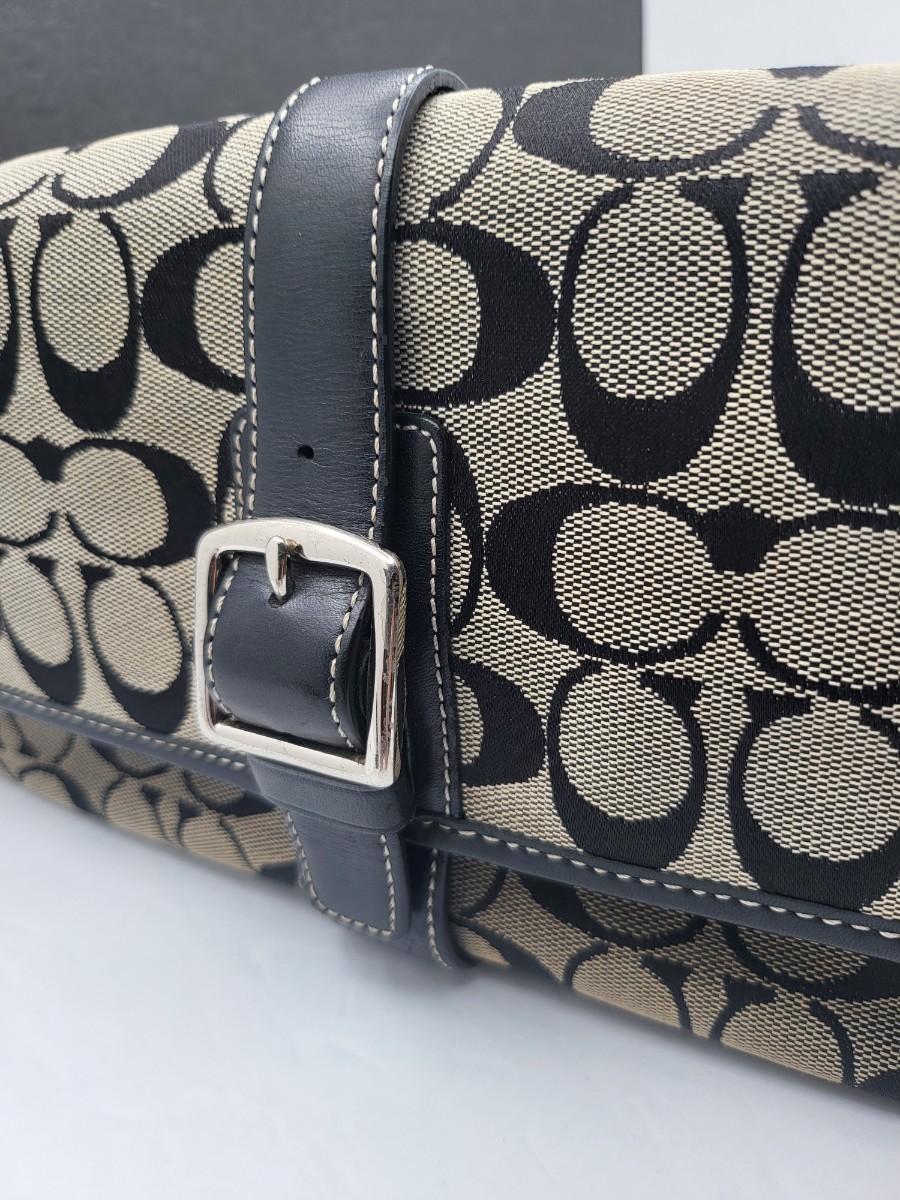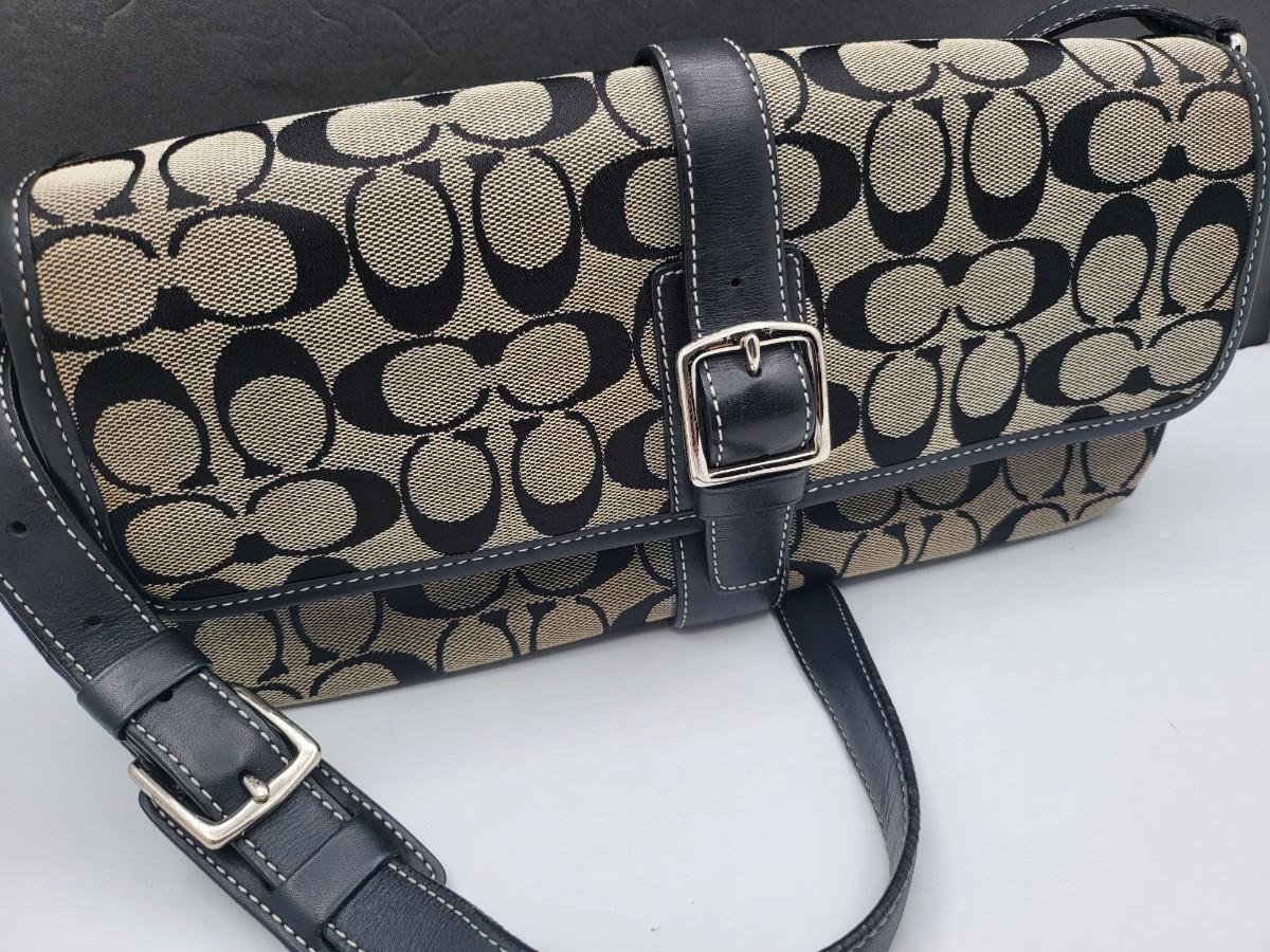 Beige & black signature Coach baguette. Magnetic snap closure, fold over flap with buckle accent. Signature canvas exterior, leather trim, and leather shoulder strap. Measures 11.5" long x 6" tall x 2" deep. Coach hang tag. No. C2K-6040. Good, pre-owned condition.