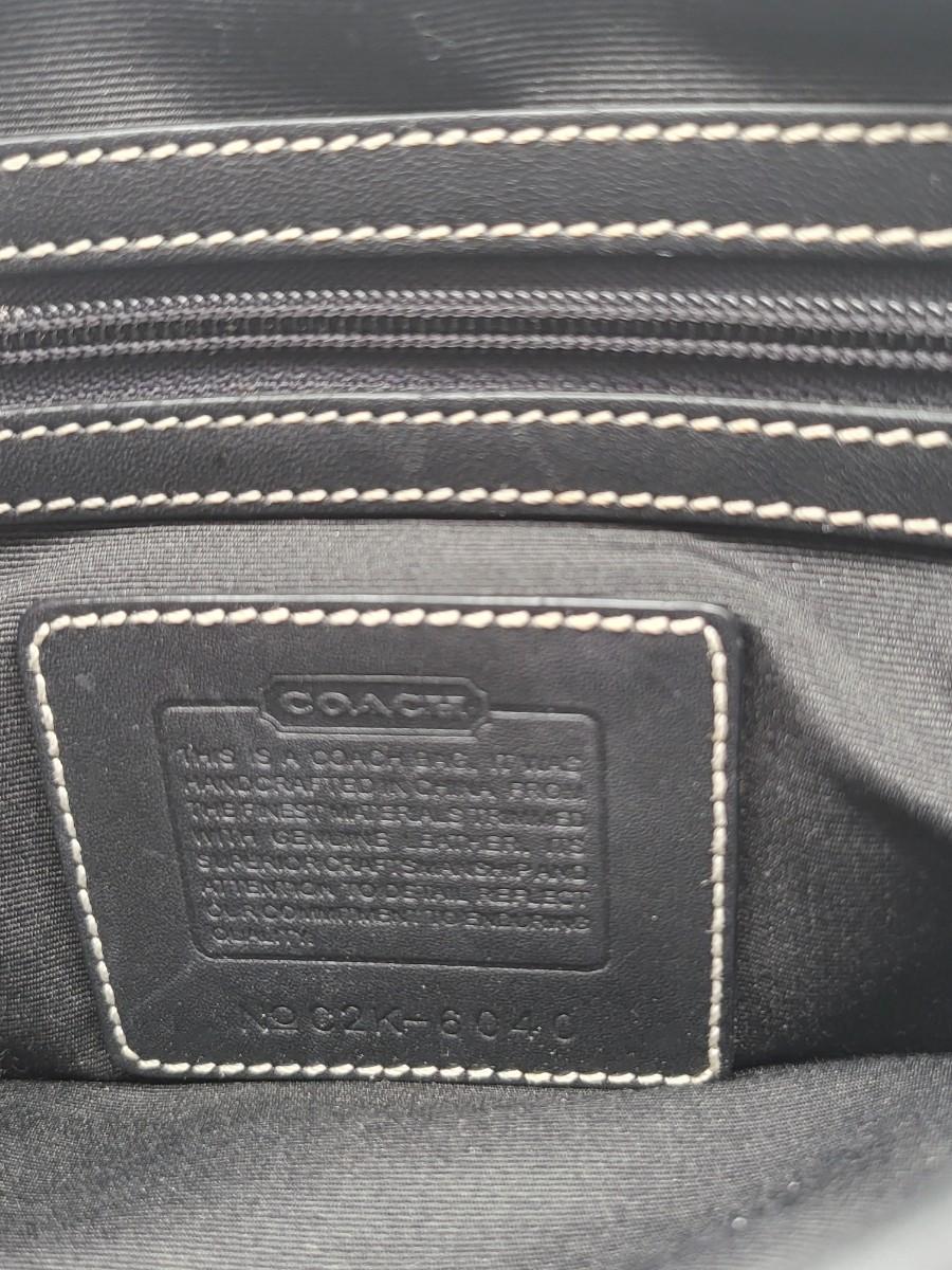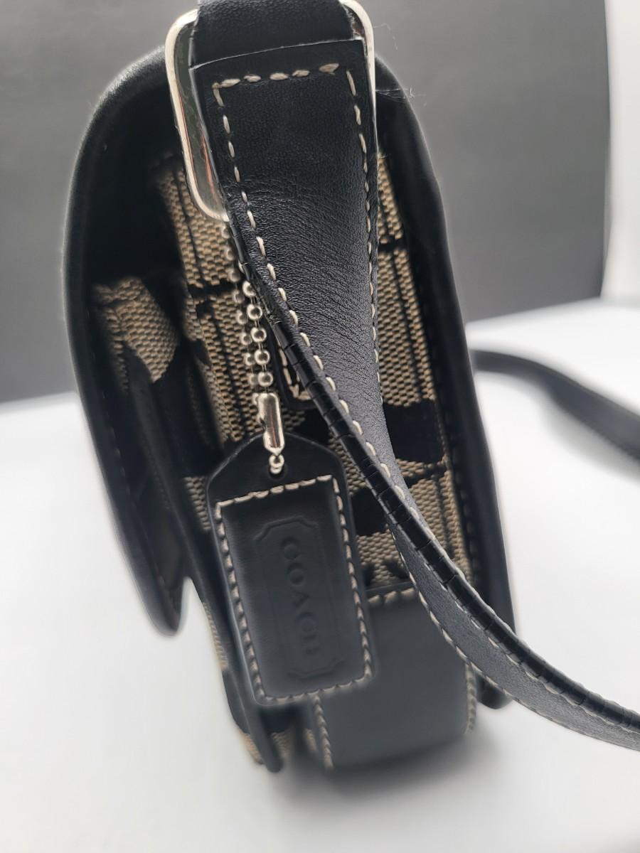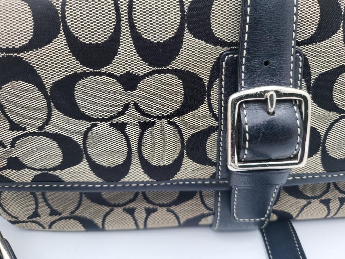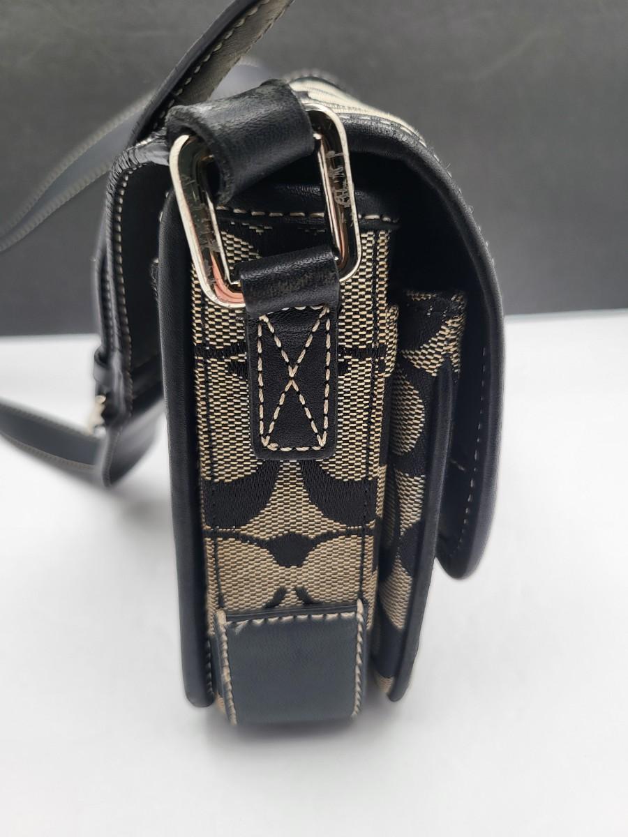 Beige & black signature Coach baguette. Magnetic snap closure, fold over flap with buckle accent. Signature canvas exterior, leather trim, and leather shoulder strap. Measures 11.5" long x 6" tall x 2" deep. Coach hang tag. No. C2K-6040. Good, pre-owned condition.