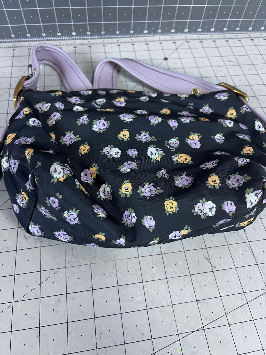 From COACH New York here is a shoulder bag with a black floral print. Exterior clasped pouches. Zip top..approx. 9 x 8" with a 10" drop adjustable strap. Some soiling on bottom of fabric interior. Otherwise light use.