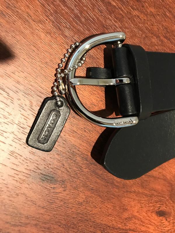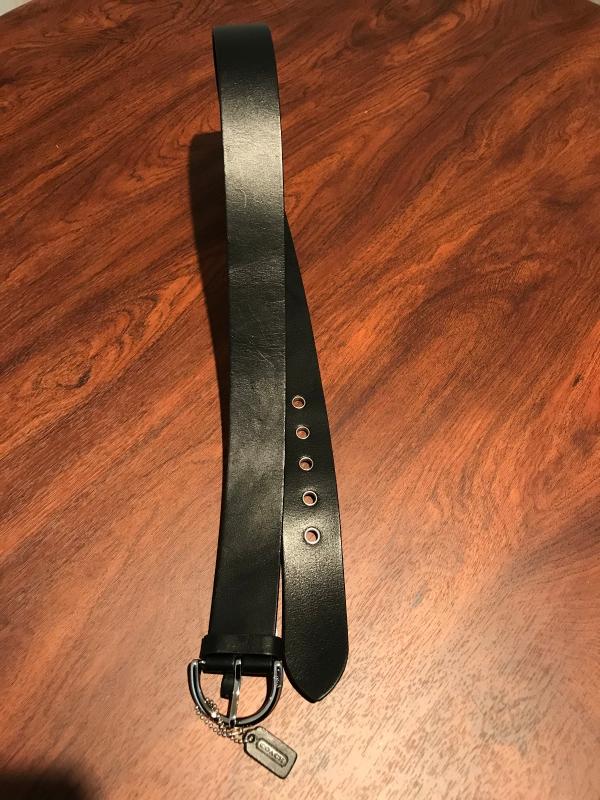 Coach black leather belt with brass buckle and grommets. New condition with tag. 41" L
