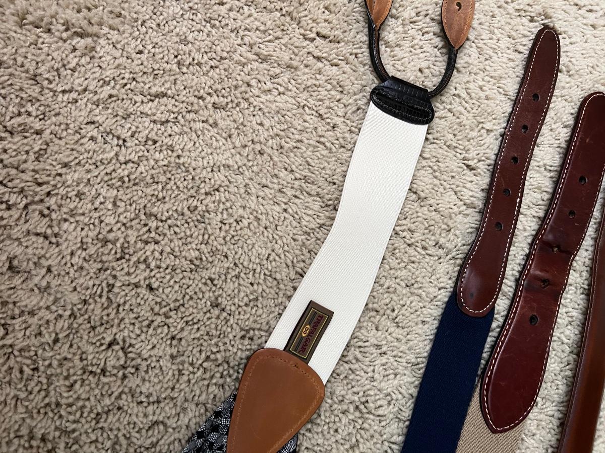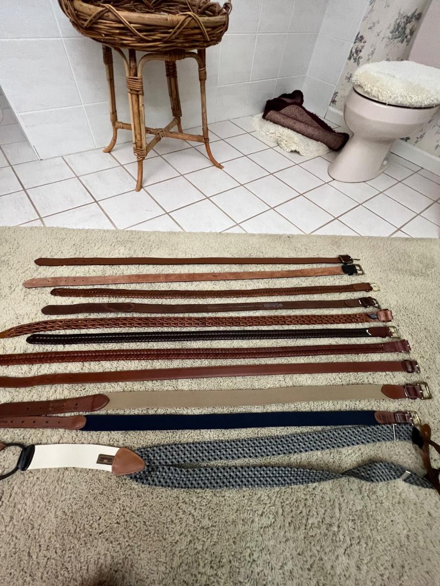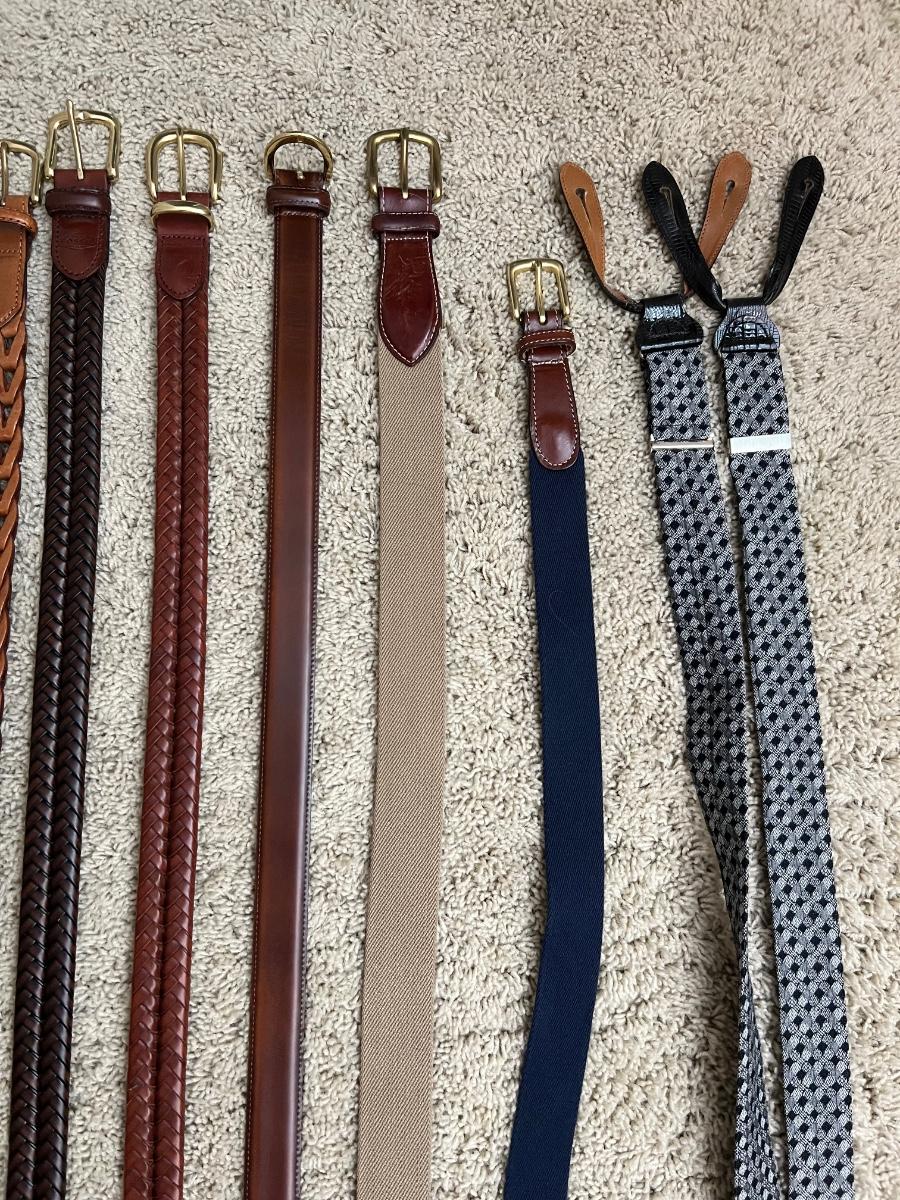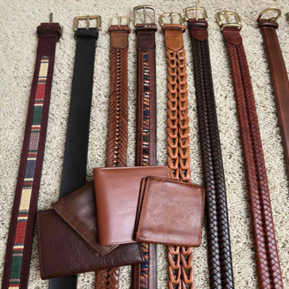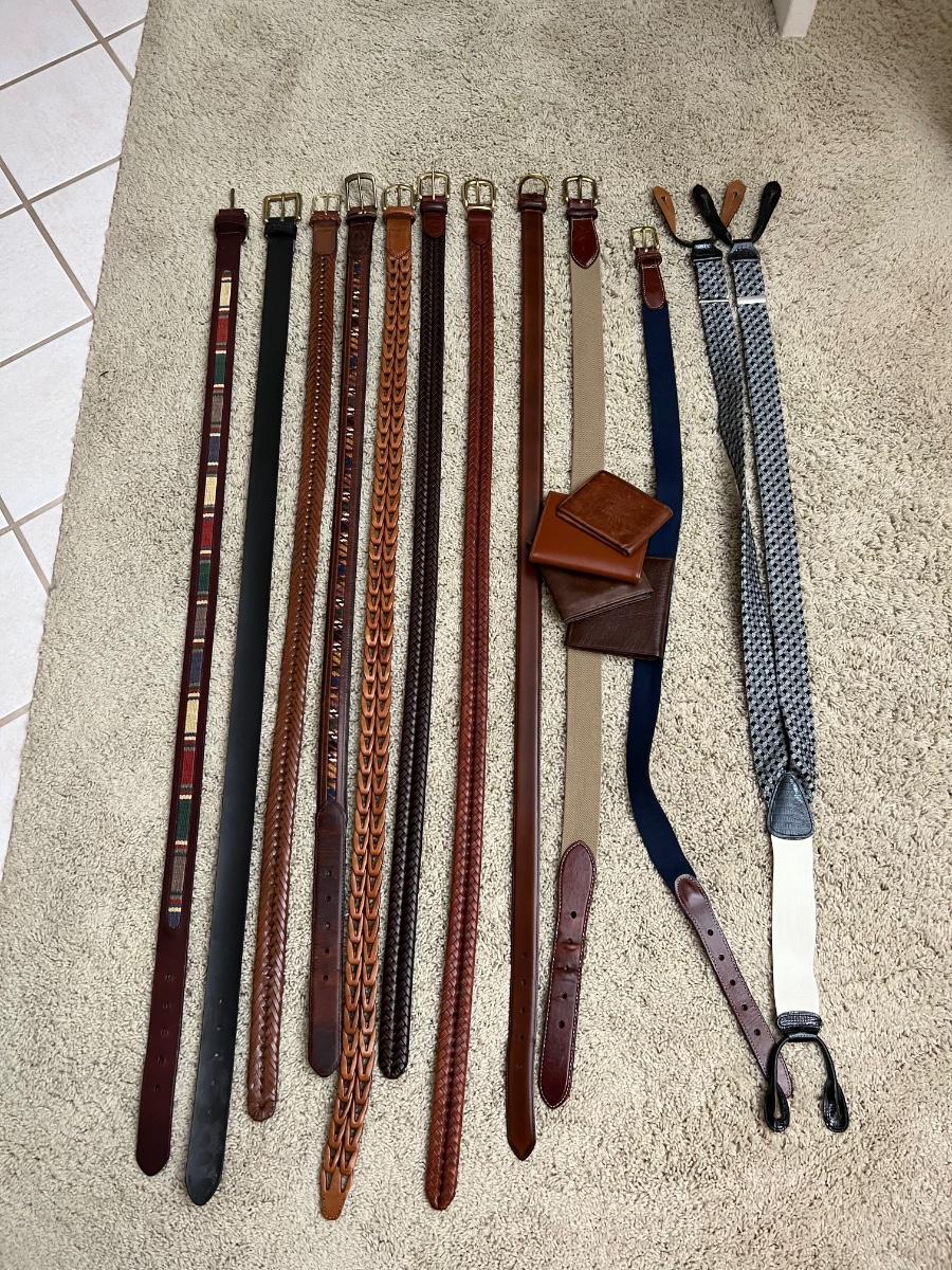 Ten belts are mostly genuine leather, see images for sizes, brands and material. A pair of suspenders from Trafalgar and four leather wallets are also included.