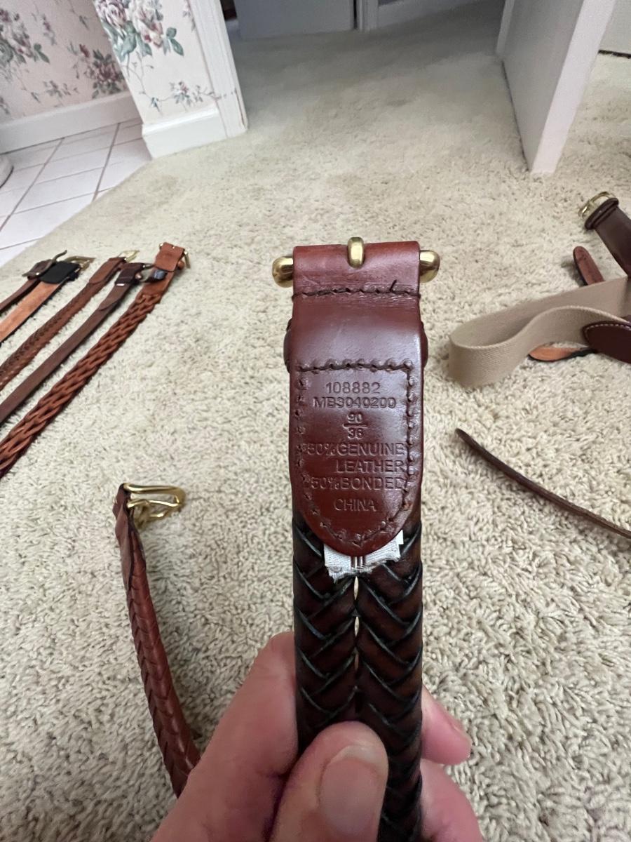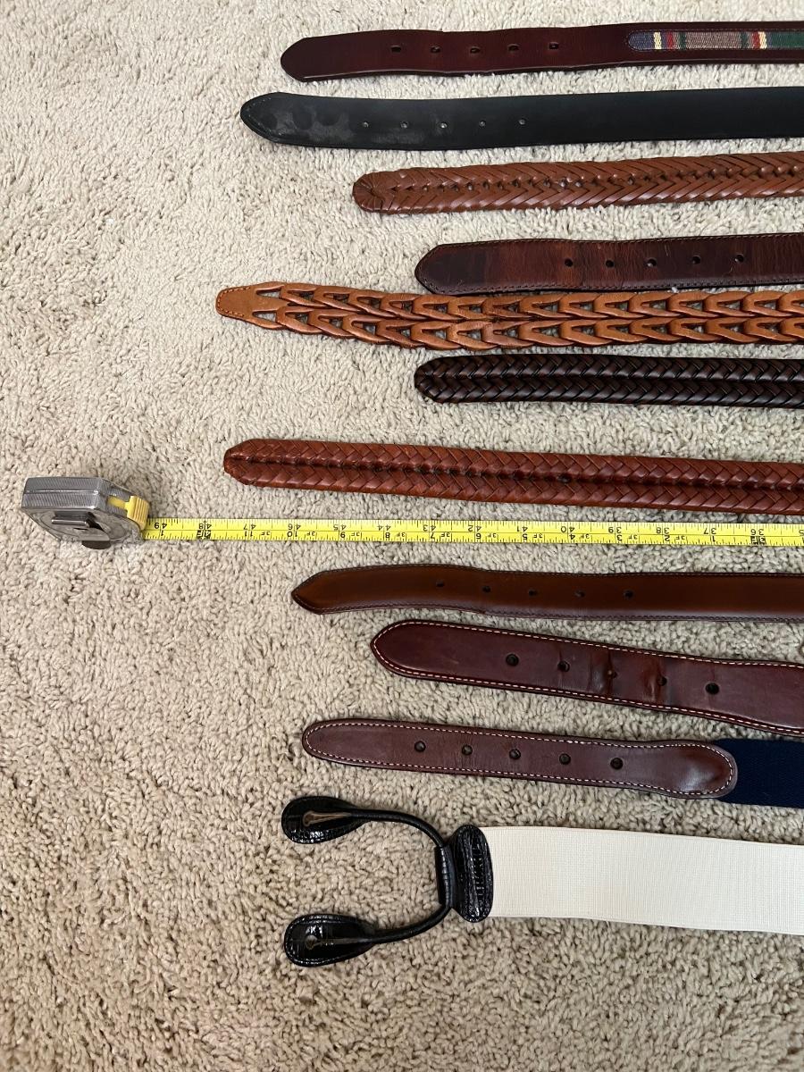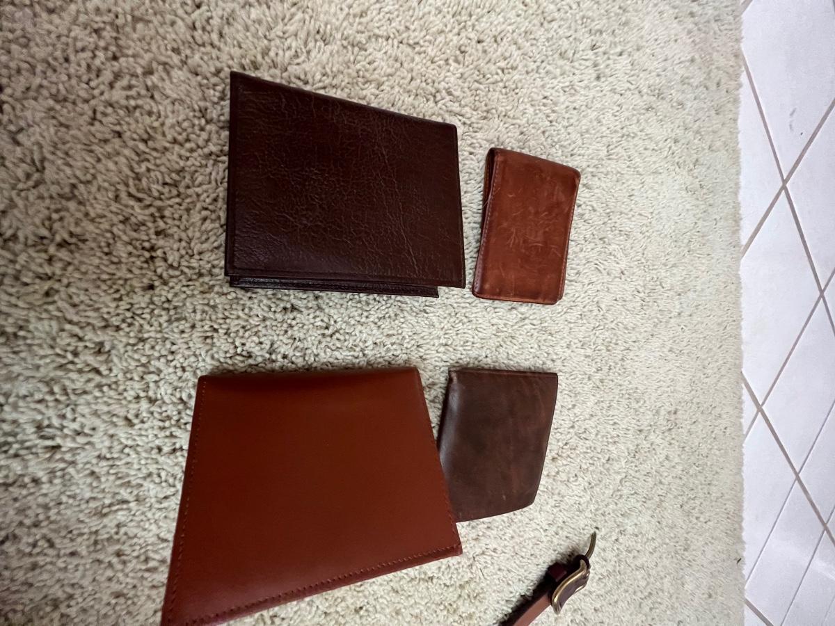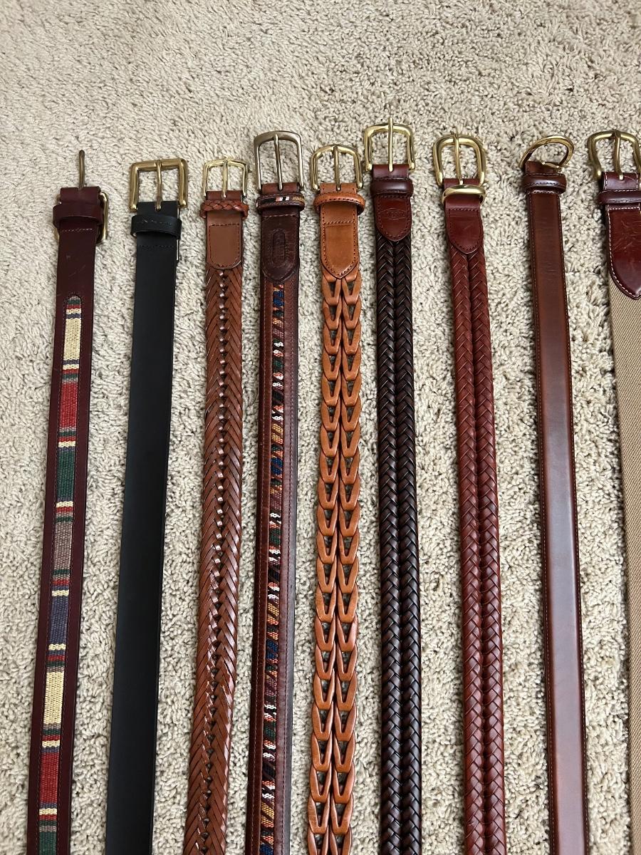 Ten belts are mostly genuine leather, see images for sizes, brands and material. A pair of suspenders from Trafalgar and four leather wallets are also included.