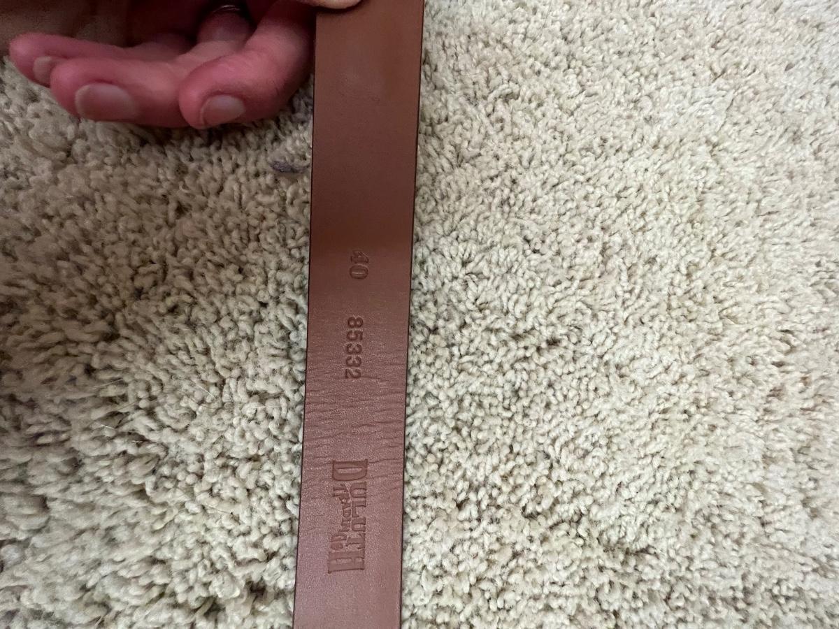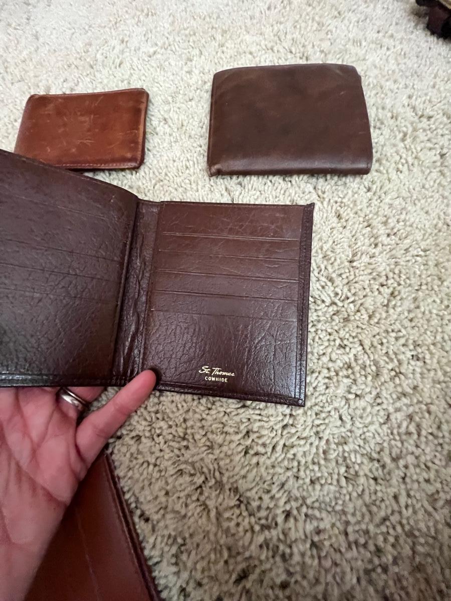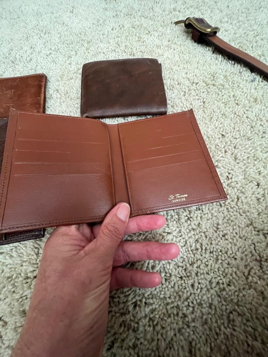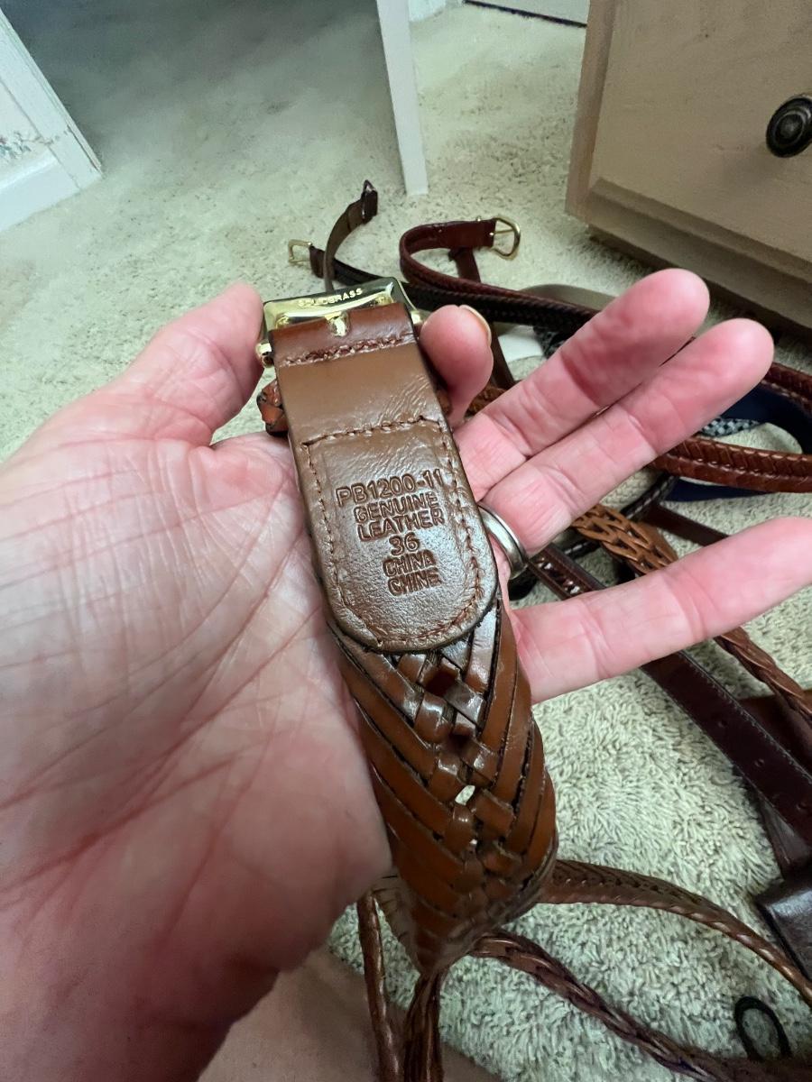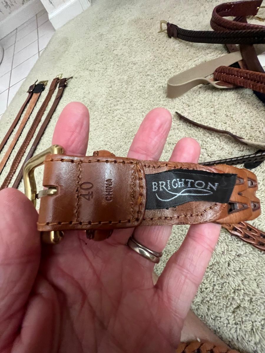 Ten belts are mostly genuine leather, see images for sizes, brands and material. A pair of suspenders from Trafalgar and four leather wallets are also included.