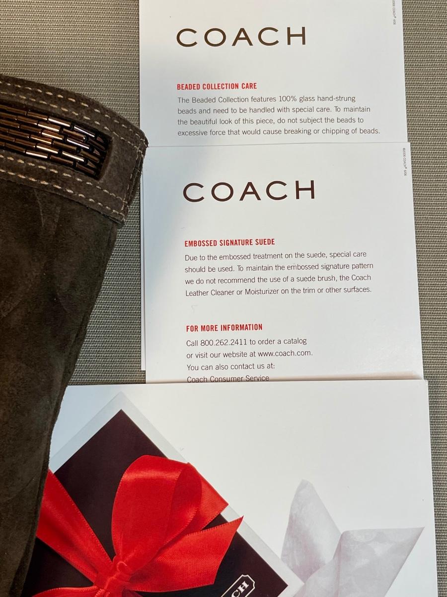 New without tag but has dust cover and papers. Dark brown colored suede with bronze glass bugle beaded trim. Excellent condition. Original retail over $300.