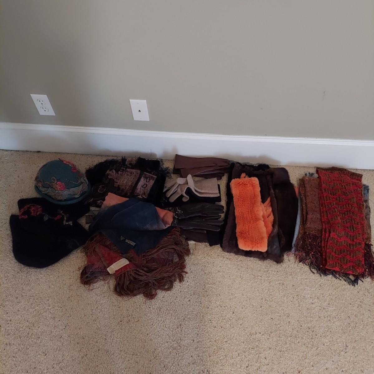Lot includes several scarves in various materials, six pairs of gloves and three felted wool hats. Please see photos for brands, materials and further details. Shipping available.