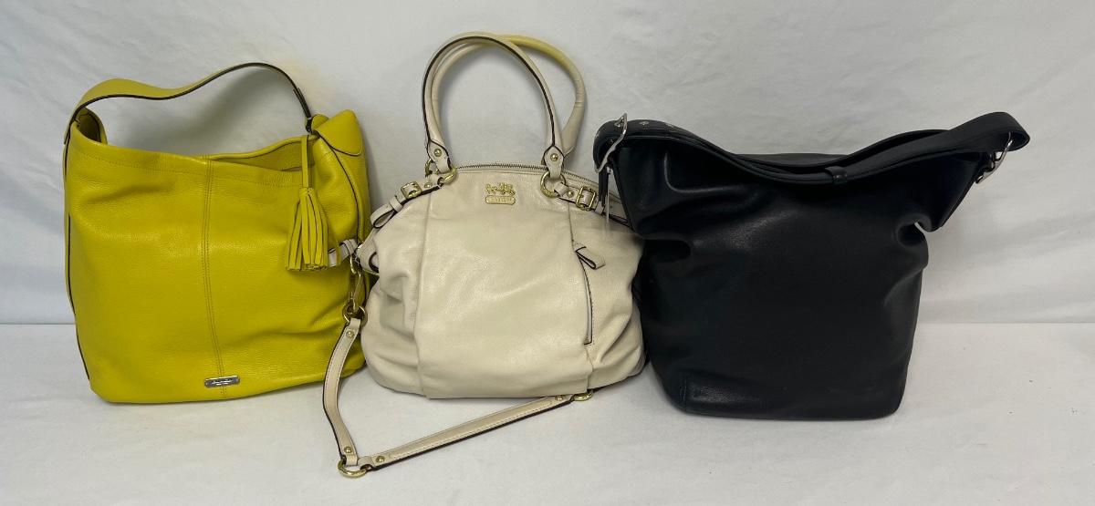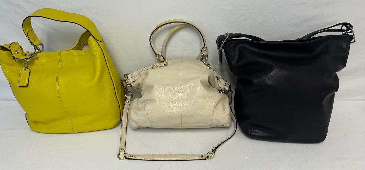 Three bags: D25-9151, M1380-F23309, and H1260-18641. One bag appears to be unused, with tags inside. Others are gently used, and one has staining on the handles (pictured). Shipping dimensions: 23" x 17" x 12". [LA]
