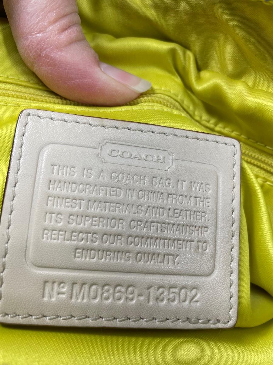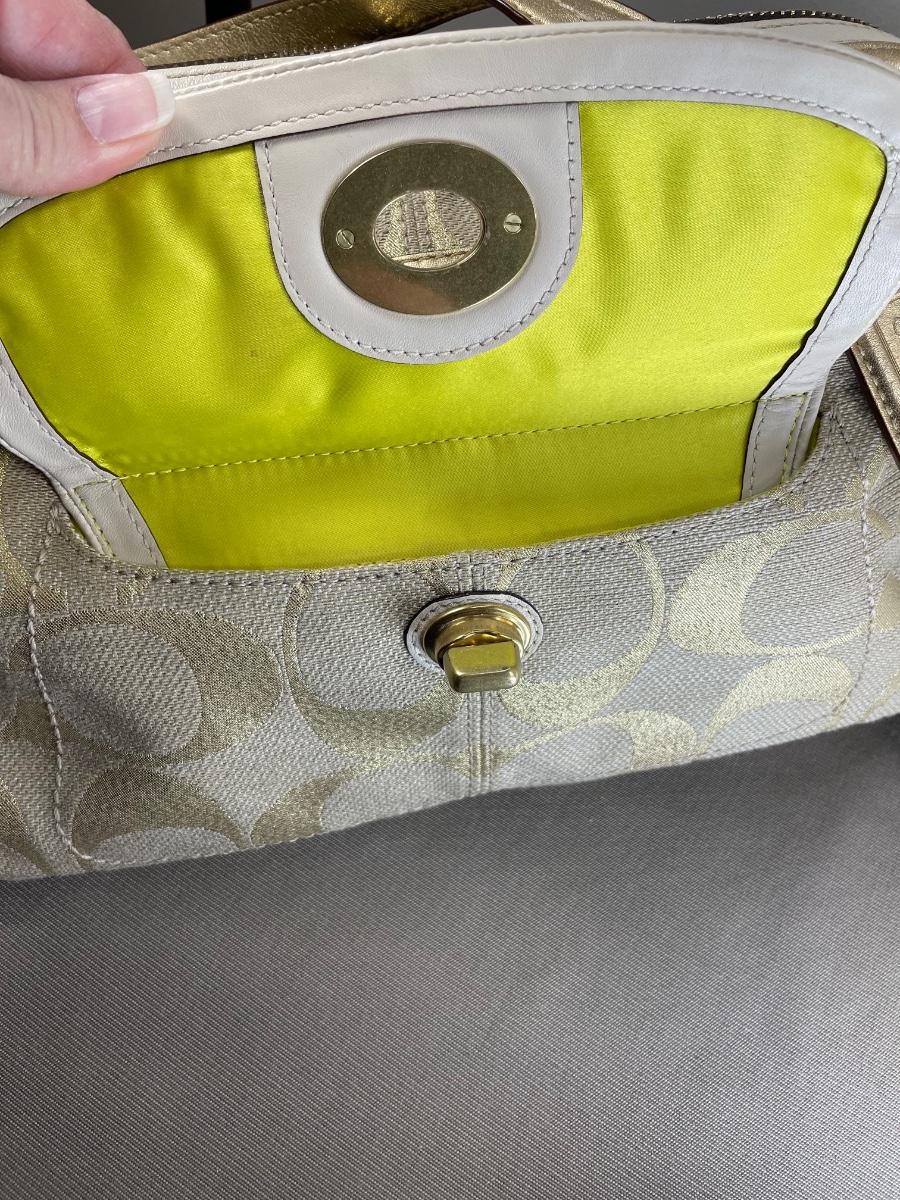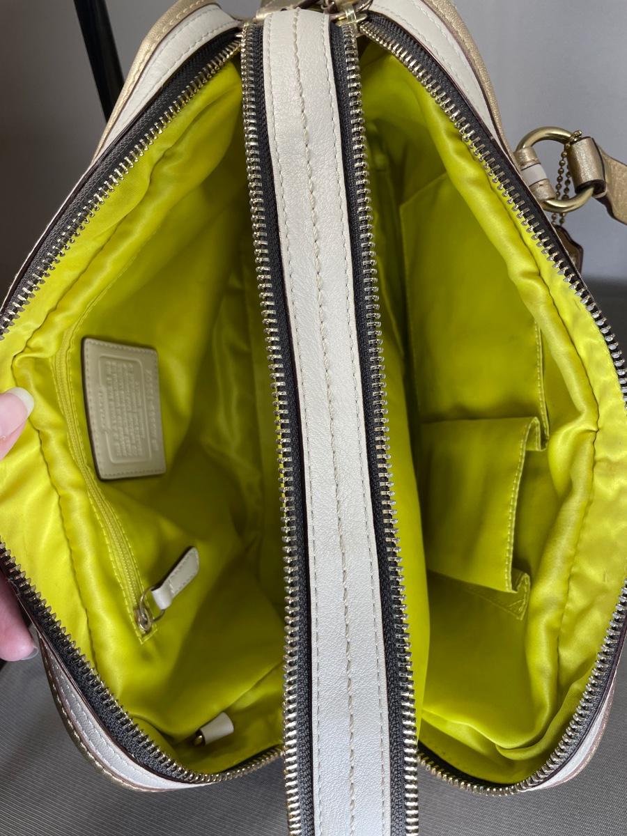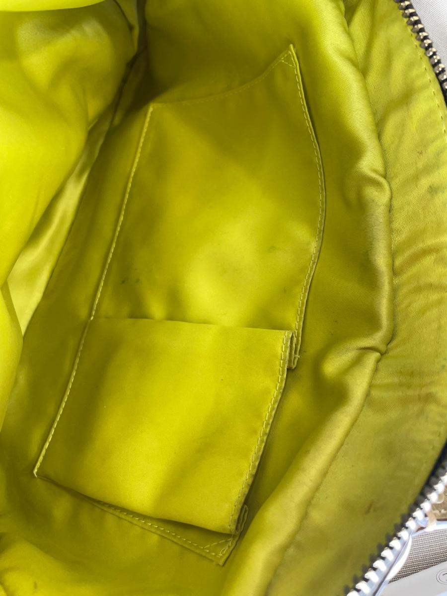 Chartreuse satin lining. Fabric/trim in excellent condition .Few marks on interior and some corrosion on the zipper pull jump rings.