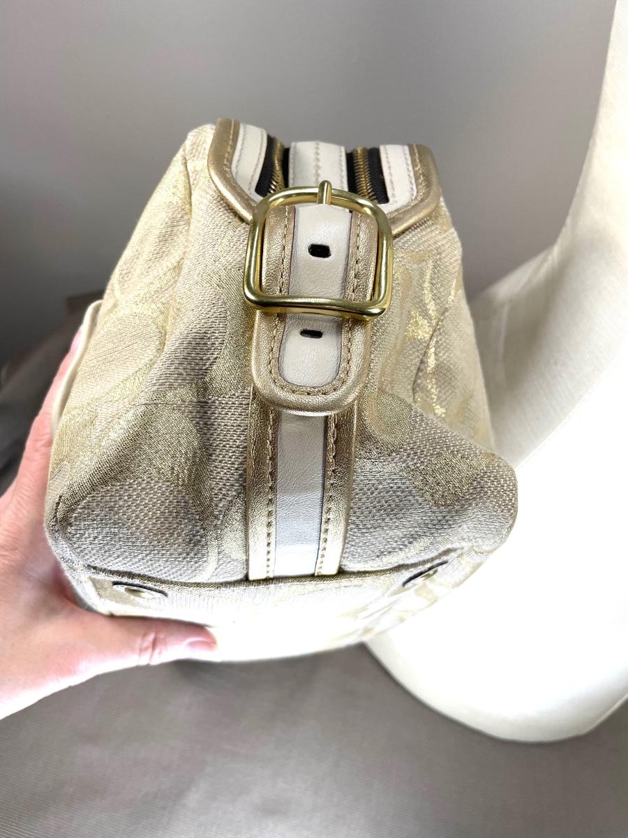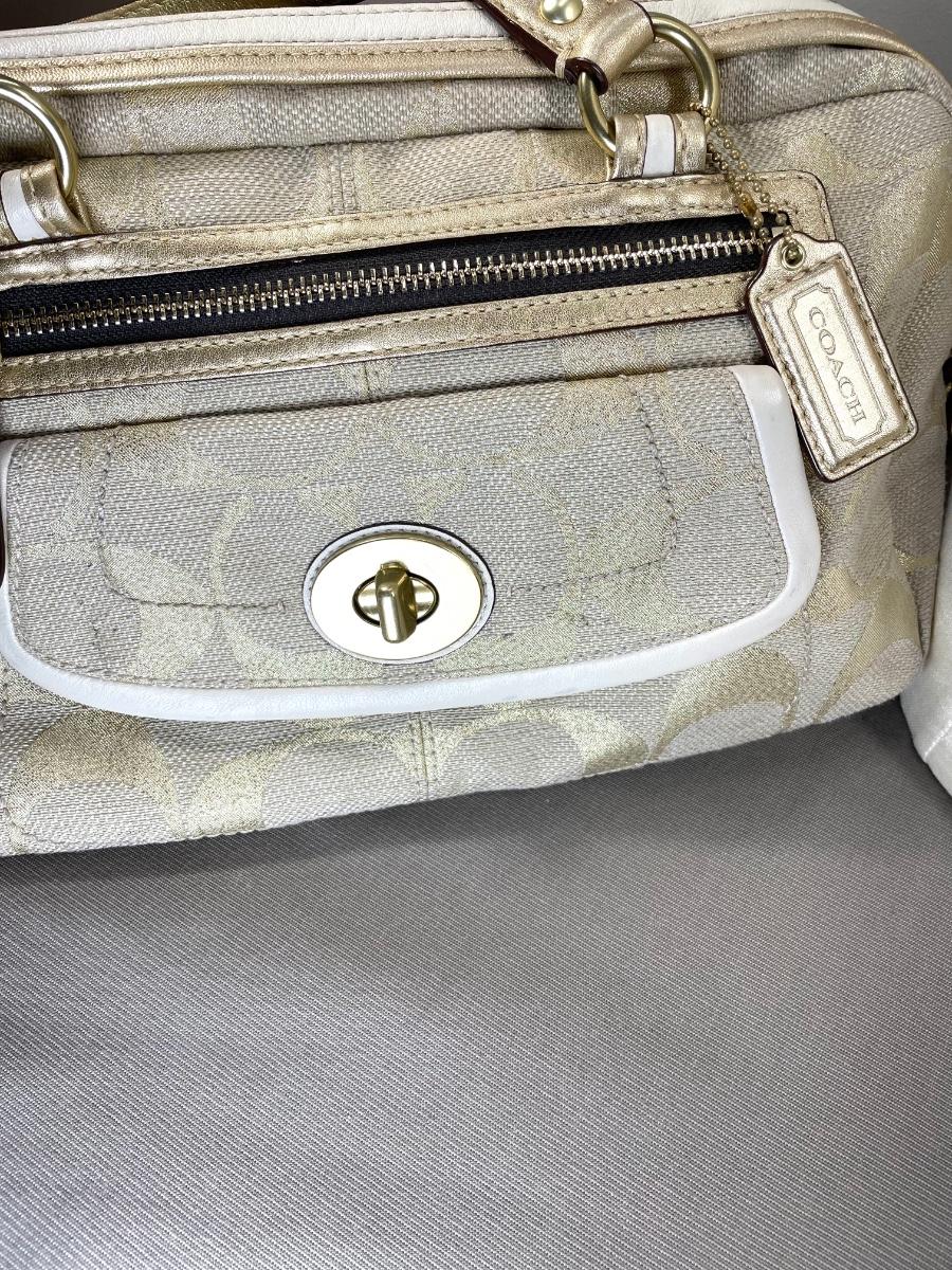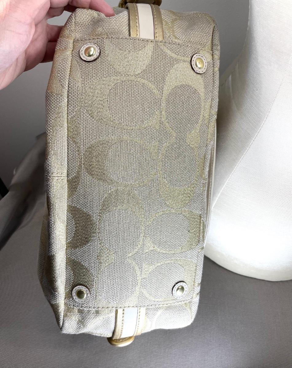 Chartreuse satin lining. Fabric/trim in excellent condition .Few marks on interior and some corrosion on the zipper pull jump rings.