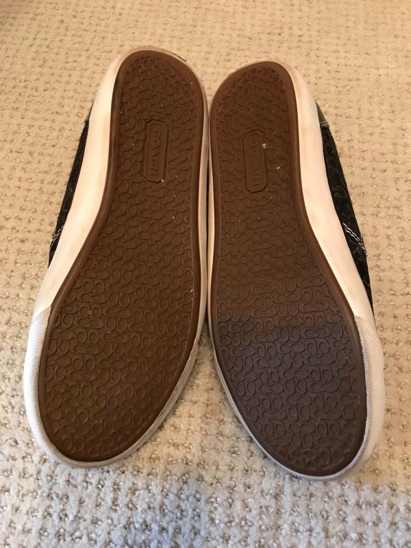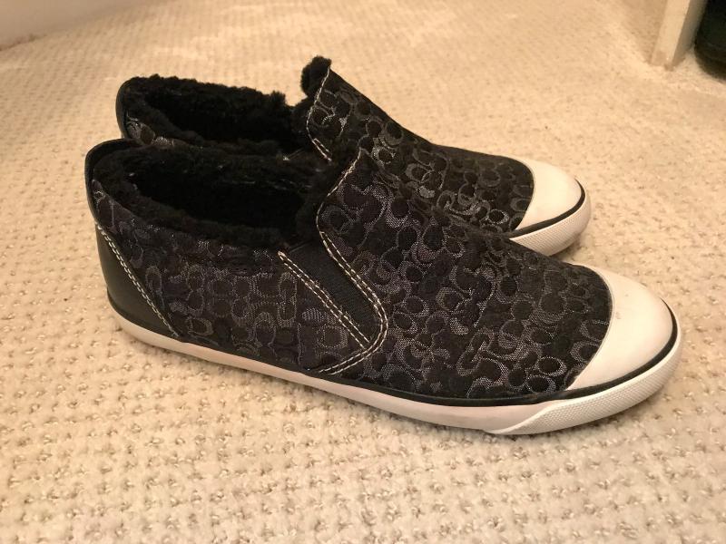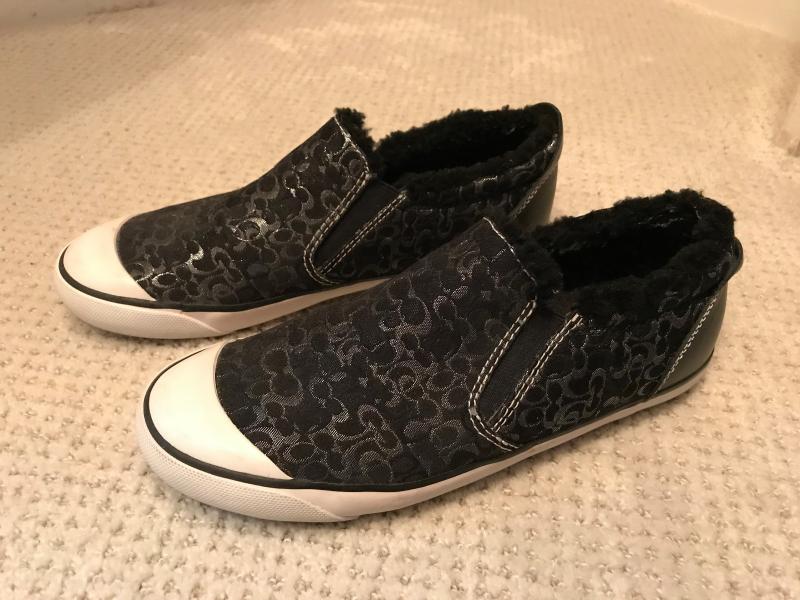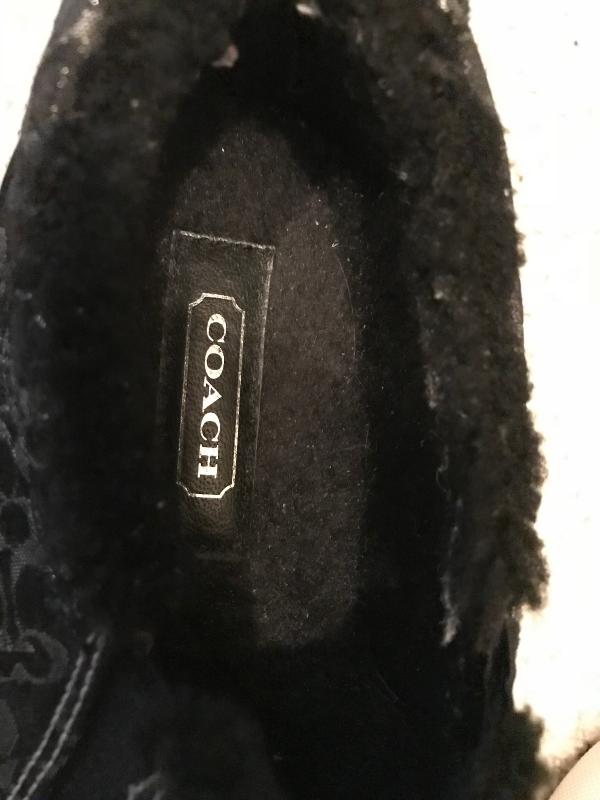 Size 7 1/2 Black and silver Coach print canvas and black leather with fleece interior. Great condition