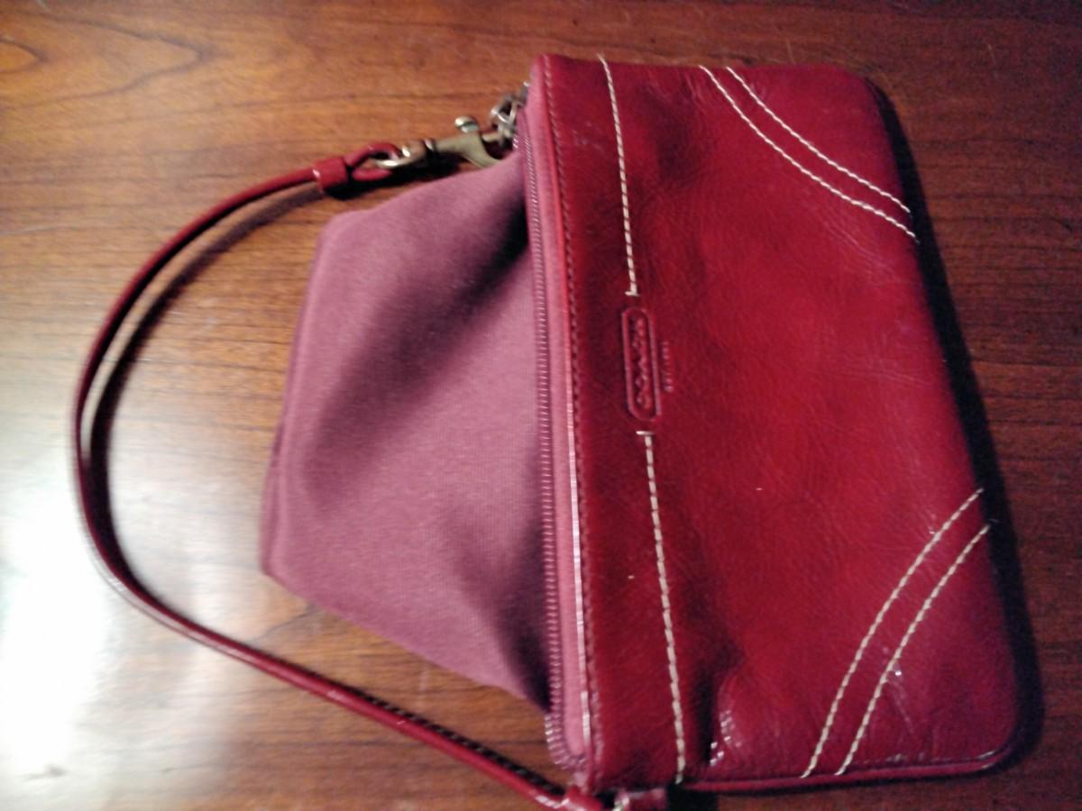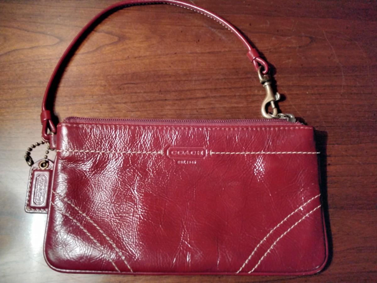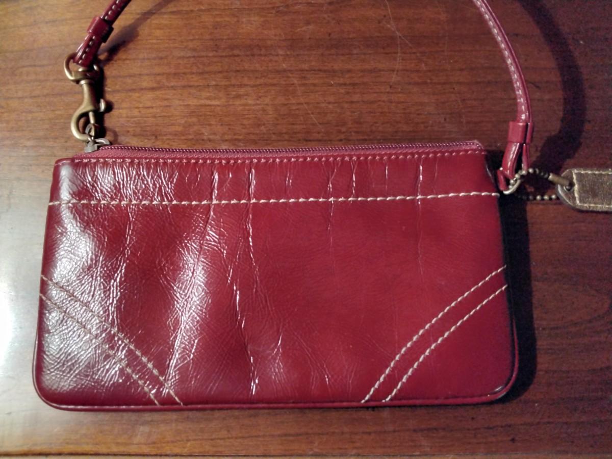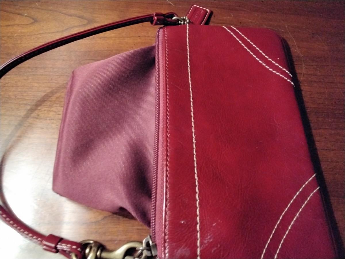 The purse is darker than the pictures depict. It's a gorgeous deep rich maroon. Just a simply gorgeous purse. No stains, rips or tears. No scuffs. New condition.