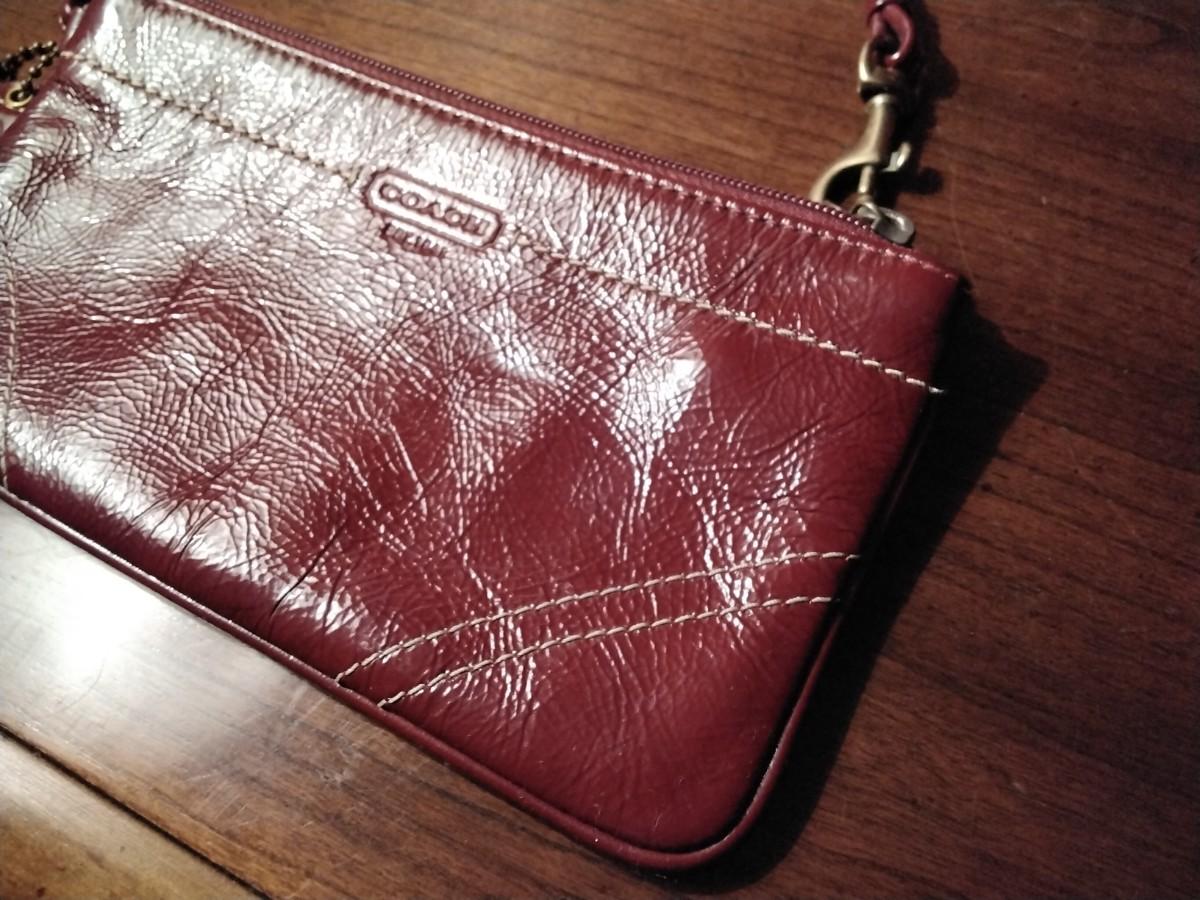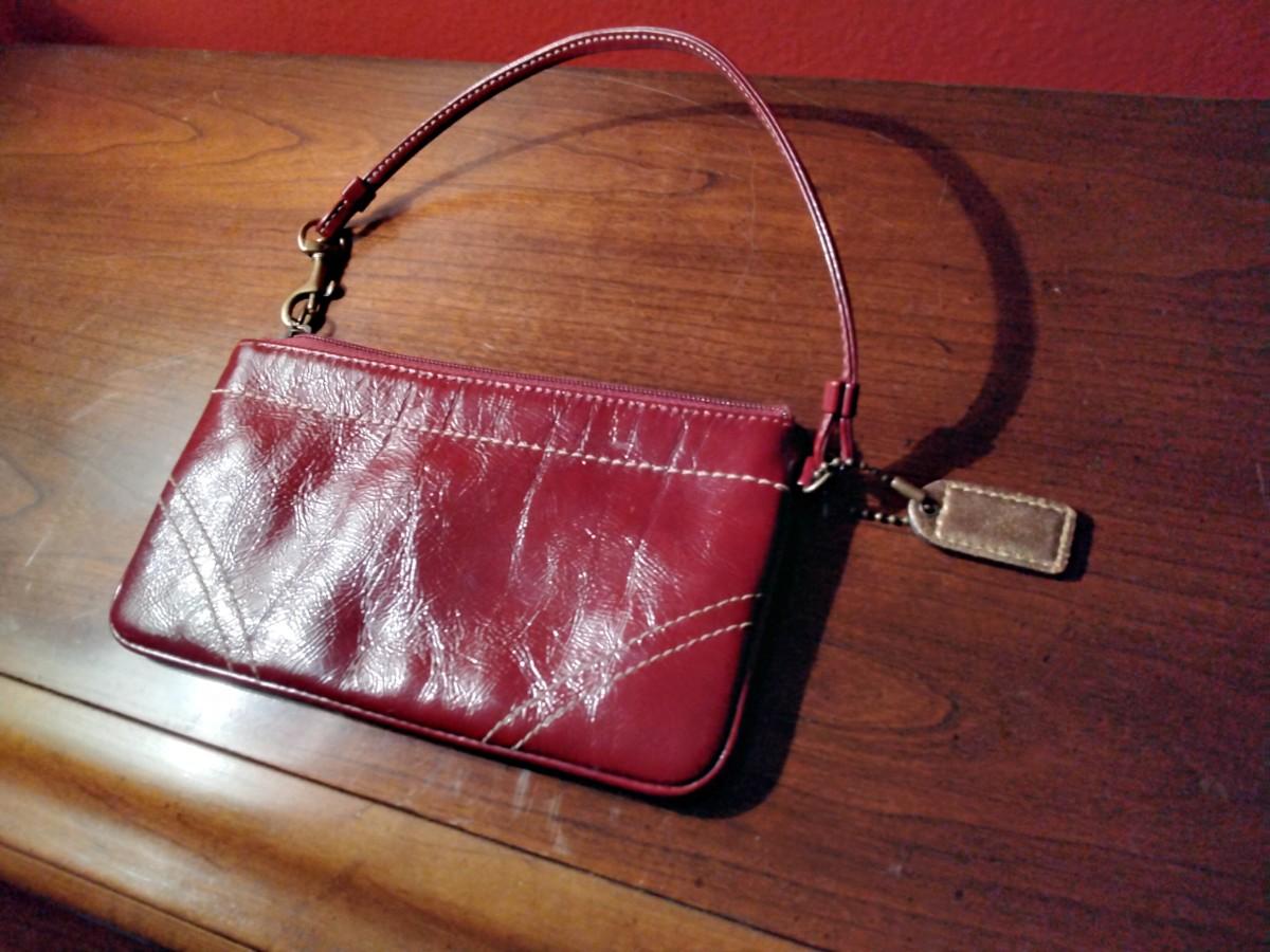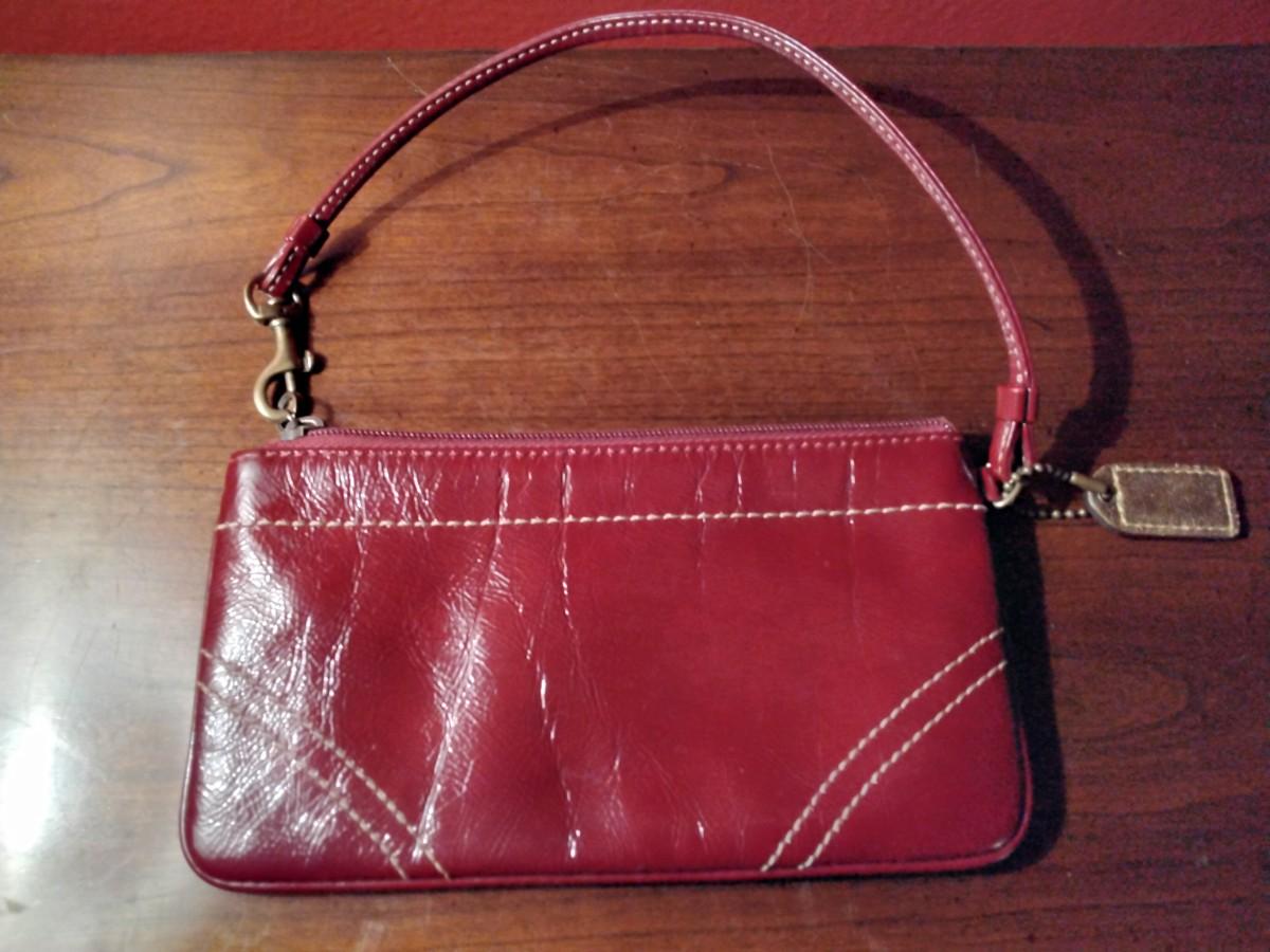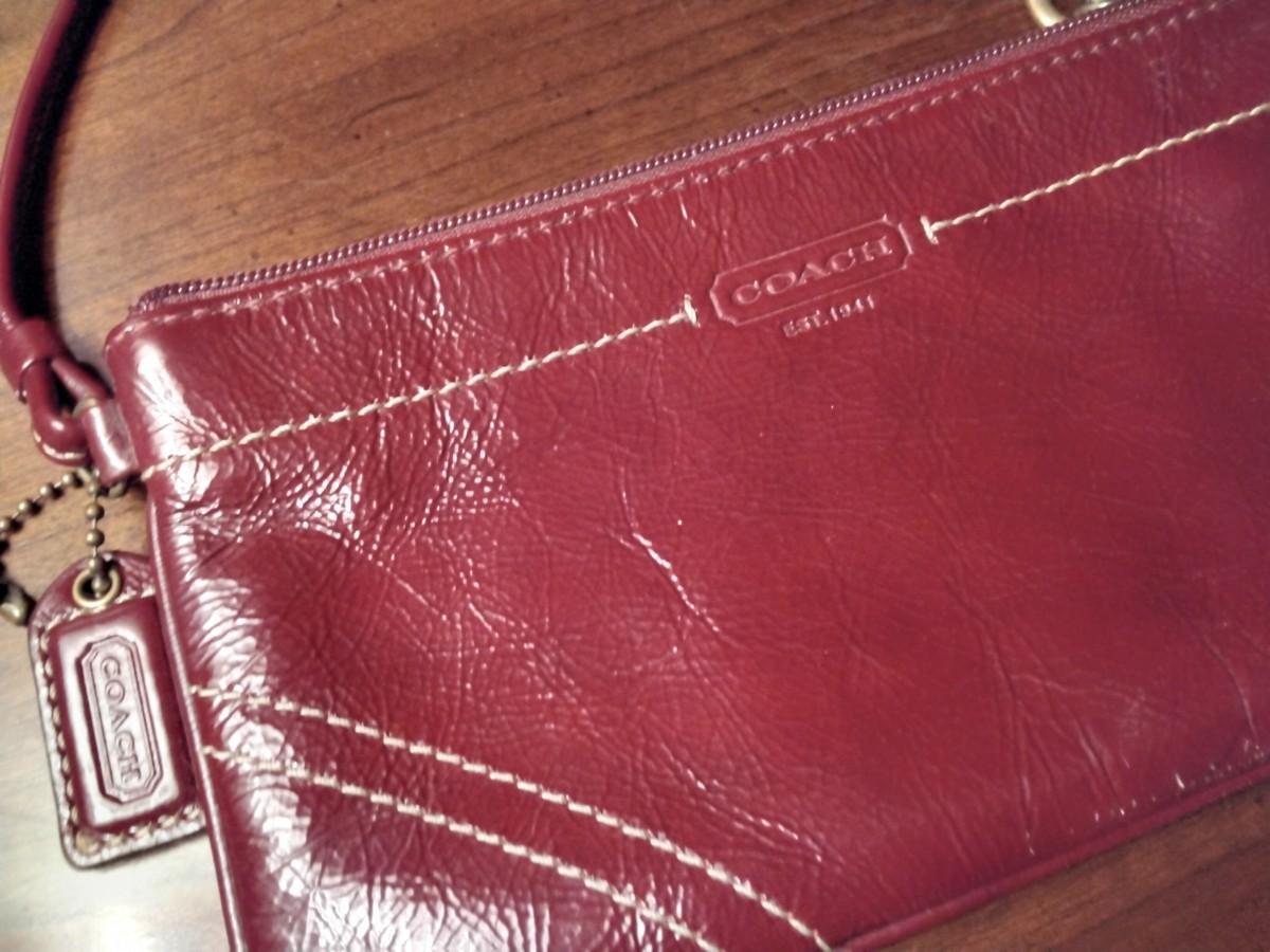 The purse is darker than the pictures depict. It's a gorgeous deep rich maroon. Just a simply gorgeous purse. No stains, rips or tears. No scuffs. New condition.