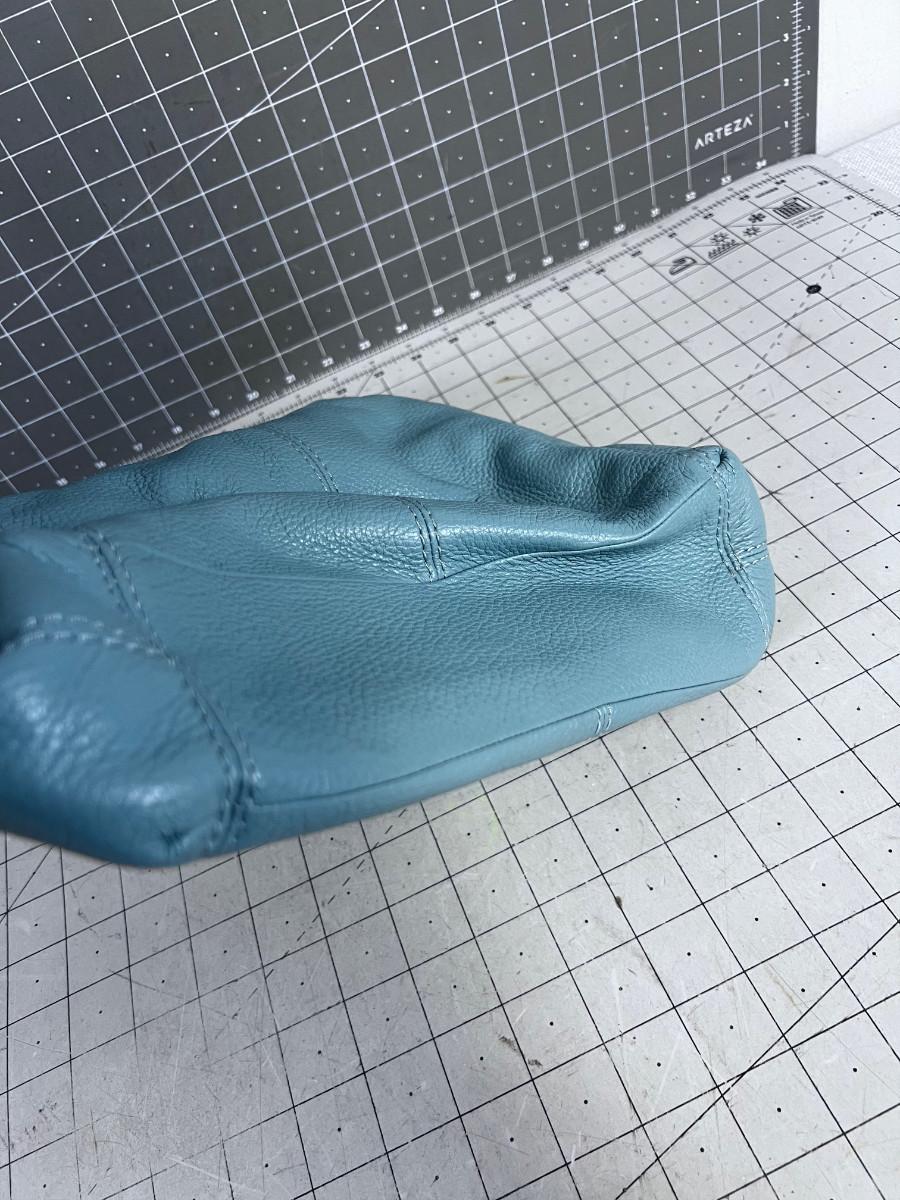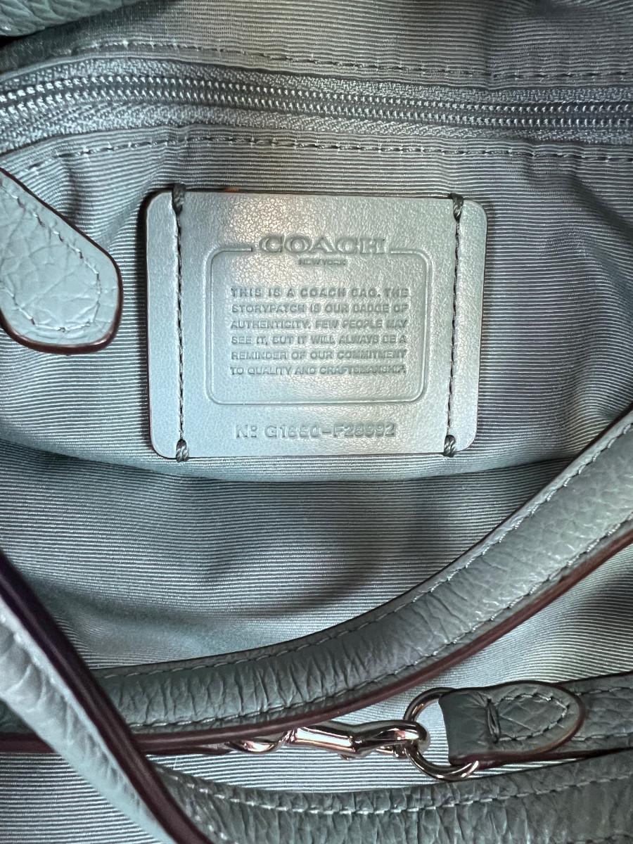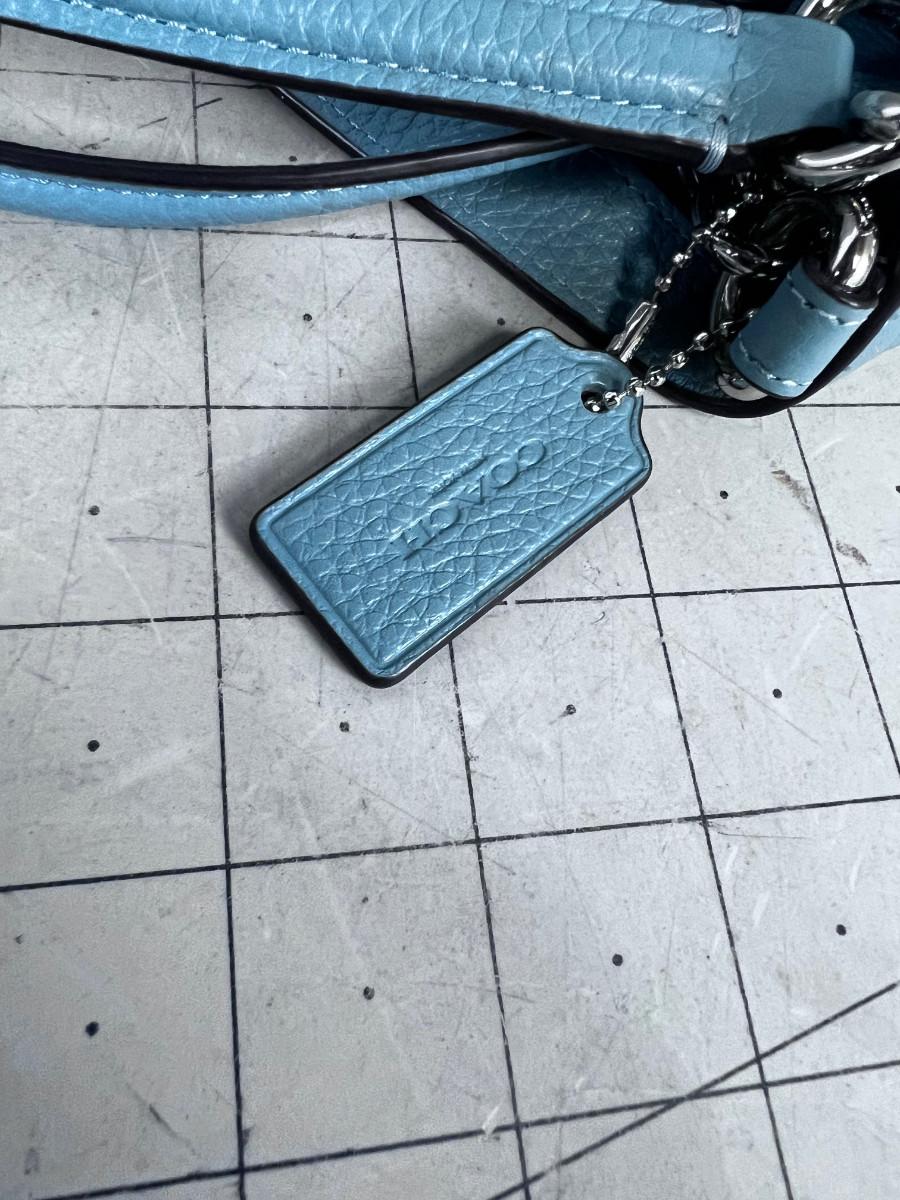 Excellent condition on this Coach Lexy Shoulder Bag in Light Blue pebble grain flexible, slouchy leather. Smaller version tote approx.10 3/4 x 9 x 4 1/4"...jacquard fabric lining. Inside zip and pockets. Magnetic snap closure. Handles with 5 1/2" drop. Detachable 20" strap for shoulder or crossbody wear..#G1880-F28992 Estate find. Offered with no reserve...